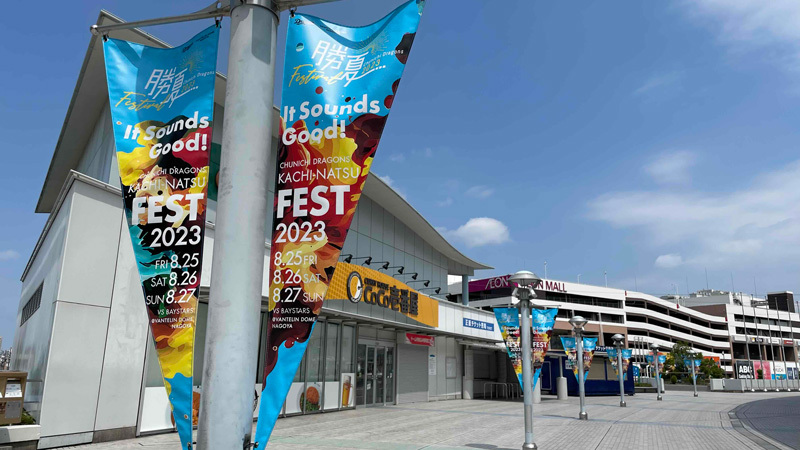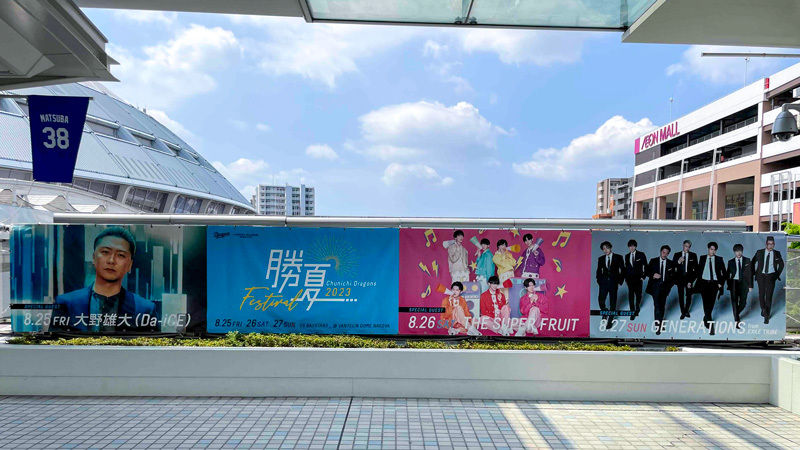 なお、バンテリンドーム ナゴヤの周囲では、『勝夏フェスティバル 2023』に向けて特別装飾を実施中。横断幕には勝夏フェスティバル 2023にゲスト出演する大野雄大(Da-iCE)、THE SUPER FRUIT、GENERATIONSが、夏らしさをイメージしたロゴとともにデザインされている。一方、三角バナーはイベント当日3日間は、特別バージョンに変わる予定だ。