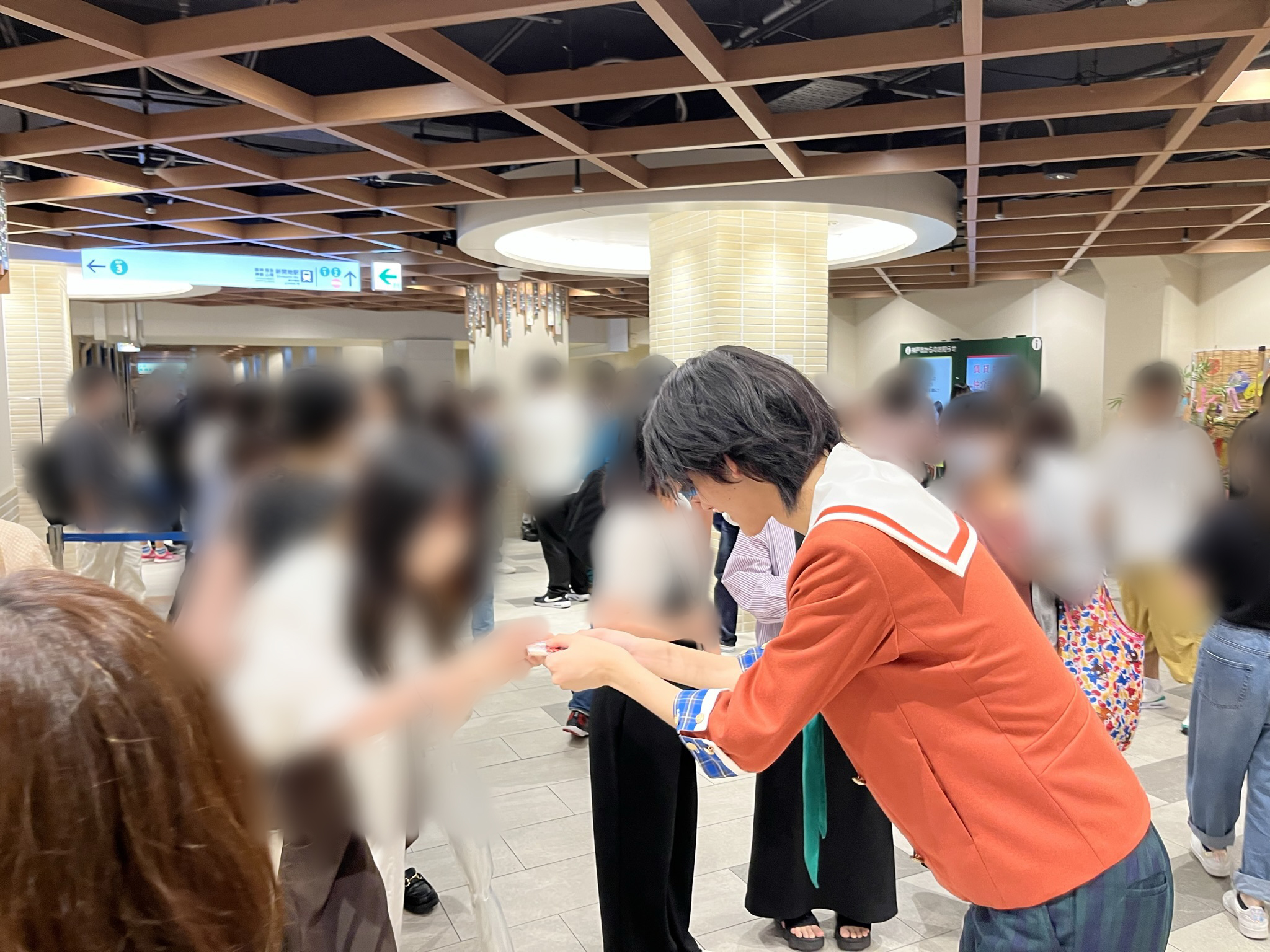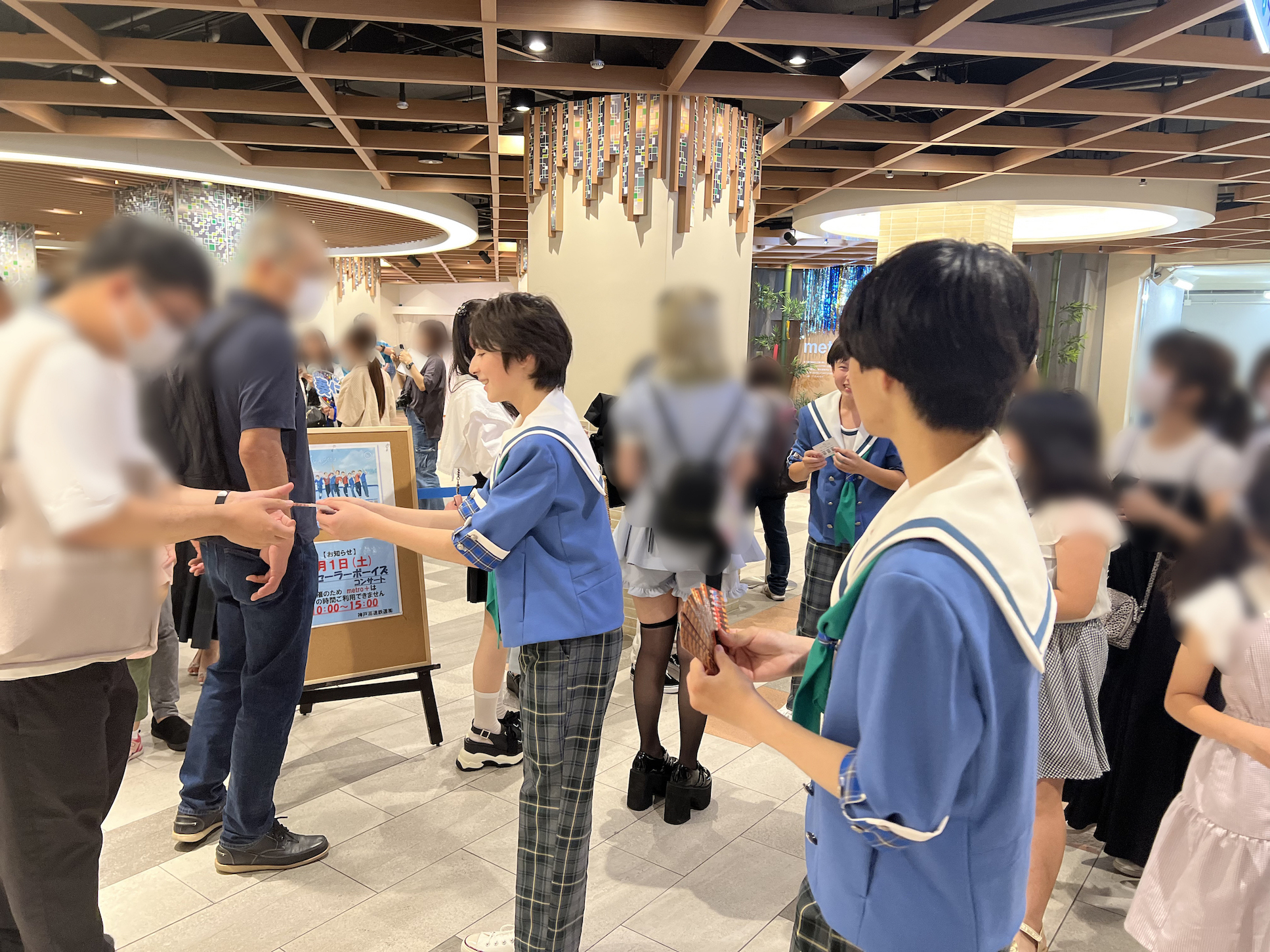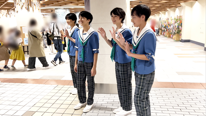 リハーサルを終え、衣装に着替えたメンバーは、開演10分前になると広場前を通行する人々に呼び込みを開始! 少しはにかみながらも、「神戸セーラーボーイズです! ぜひ観て行ってくださーい!」と元気に声をかけていた。