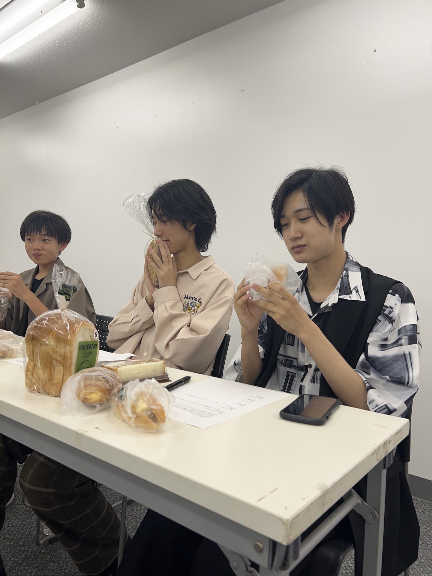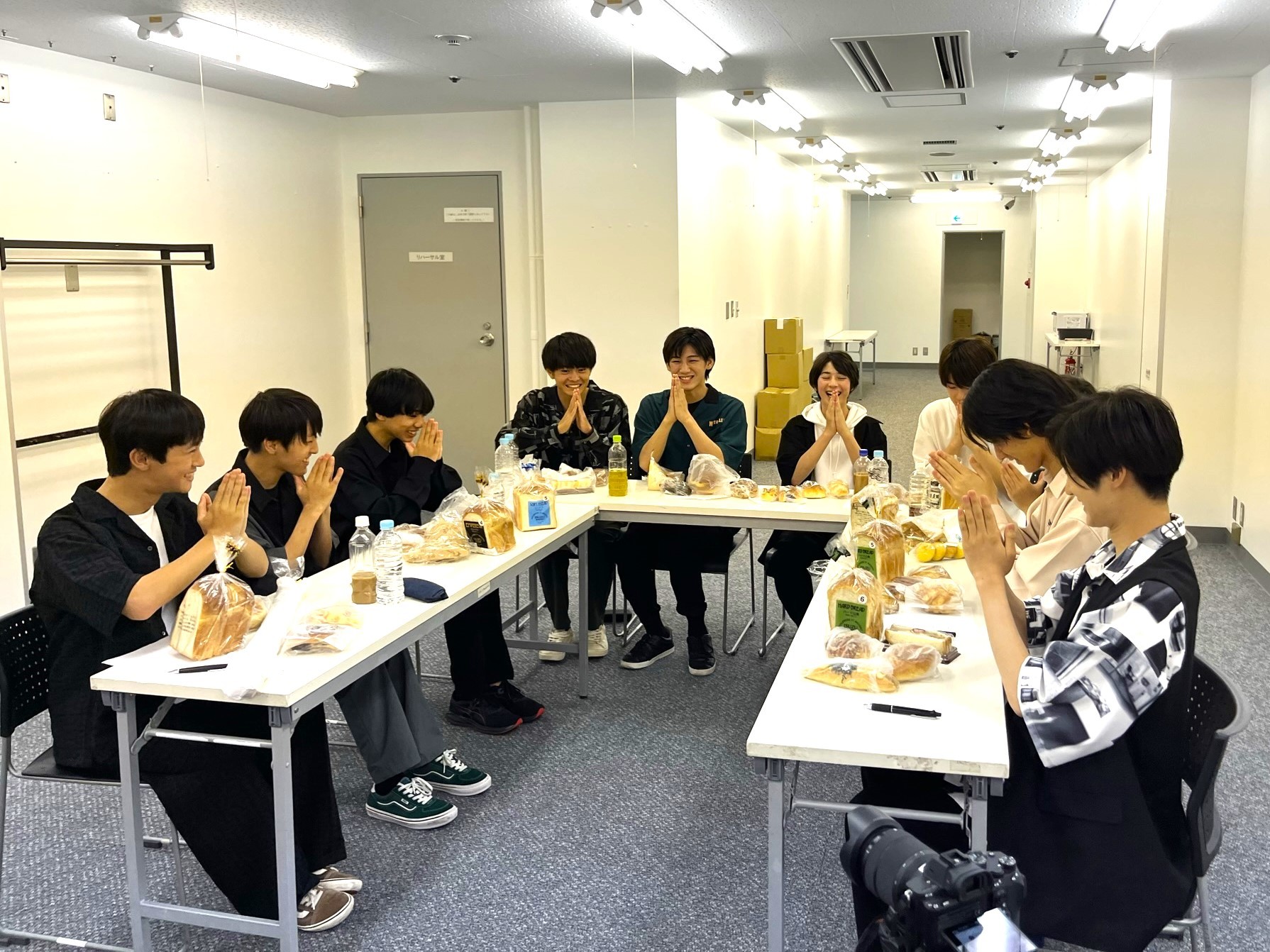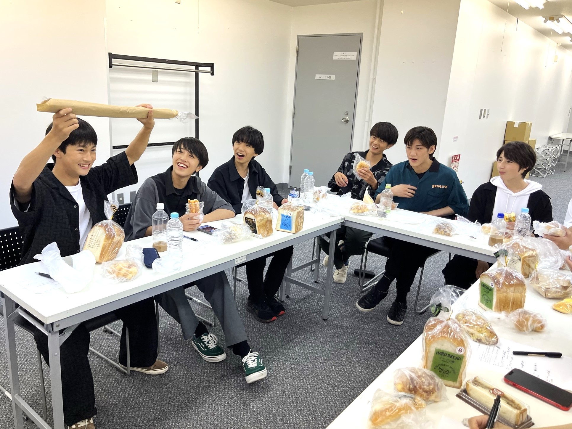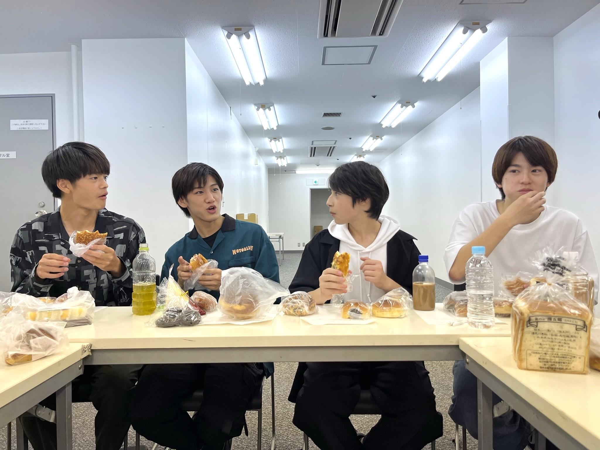チョココロネの美味しい食べ方をみんなにレクチャーする崎元リスト、「もちもちで美味しくて5個も入っていて幸せ」とタマゴぼうやをほおばる最年少の髙橋龍ノ介は、キャラクターにぴったりのパンを選んでいておもしろい。