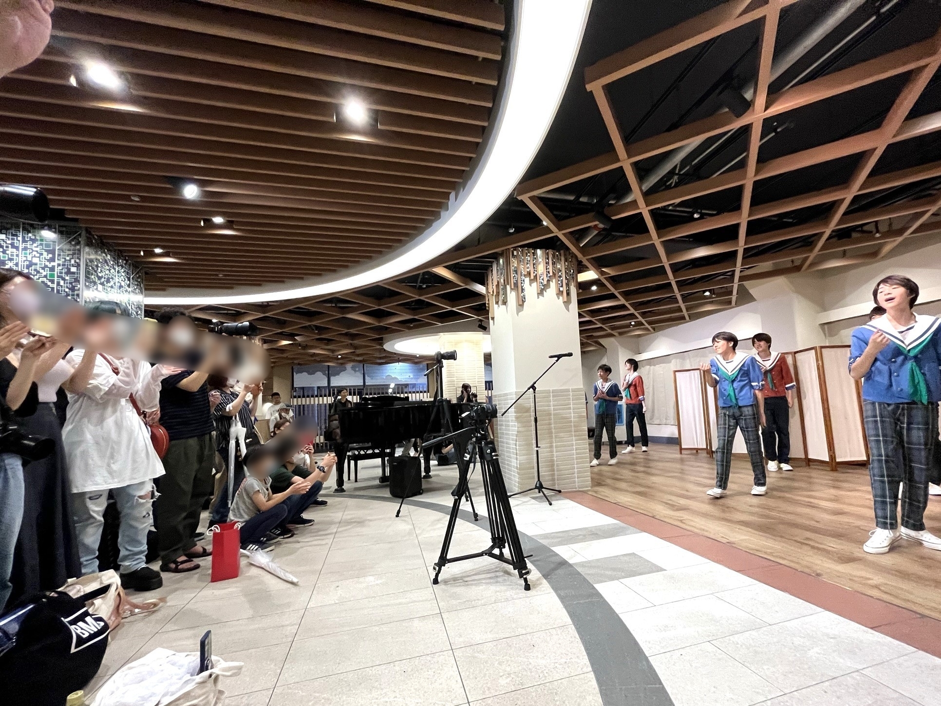 神戸セーラーボーイズの舞台の中でも重要な役割を果たす「合唱」は、彼らの特徴のひとつだ。少年期独特のボーイ・ソプラノを披露できる時間は限られている。彼らのフレッシュな歌声、パフォーマンスを一目見ようと、ストリートピアノが設置された中央広場には、開演前からファンがたくさん集まった。