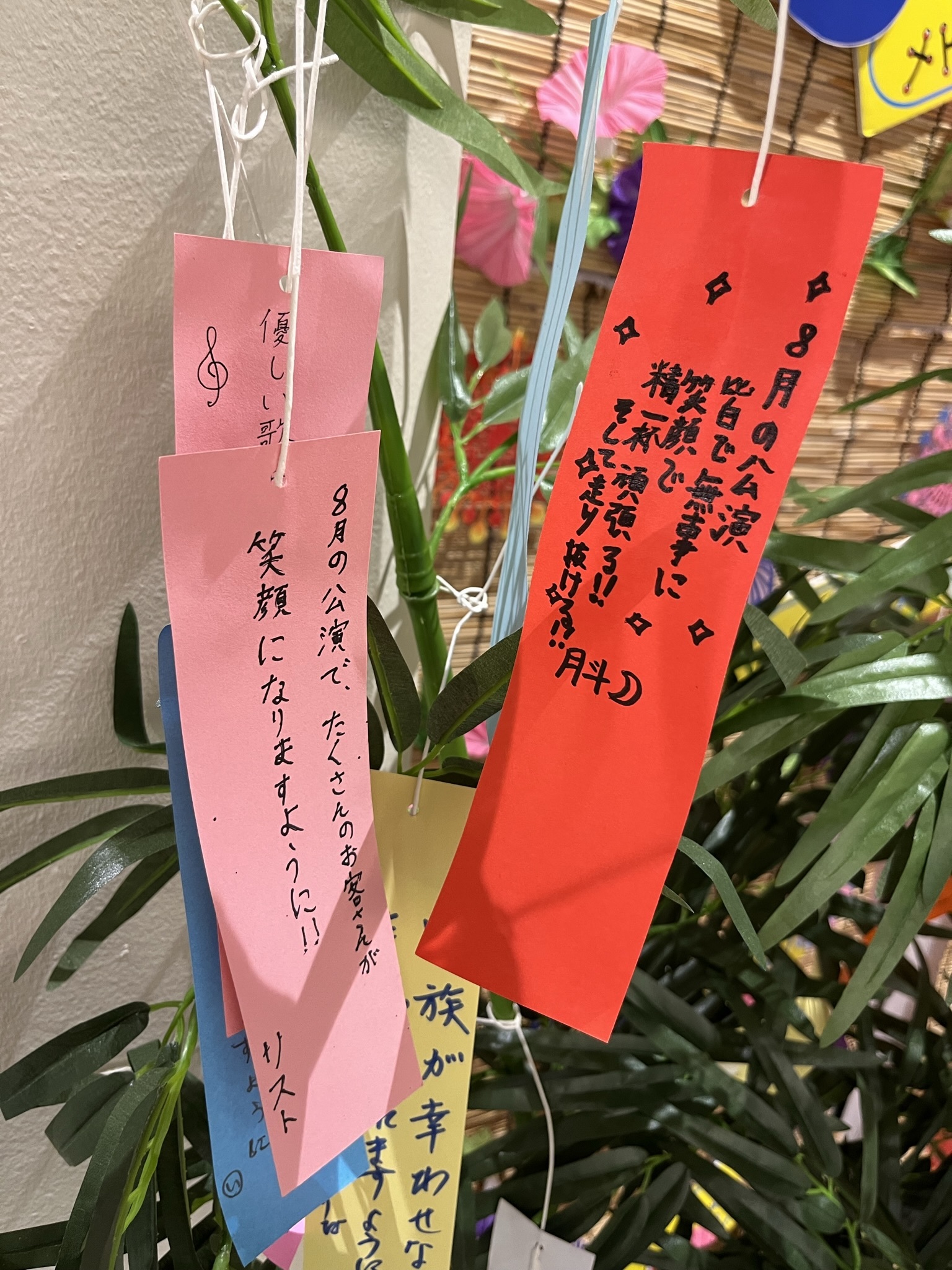 七夕イベントとあって、会場には大きな笹が飾られ、誰でも自由に短冊に願い事を書くことができるコーナーも。なかなか願い事が思いつかないメンバー、すらすらペンを走らせるメンバーなどさまざま。それぞれに公演の成功やスキルアップを願って笹に飾った。短冊は後日、神戸の湊川神社で御祈祷、お焚き上げされたそう。