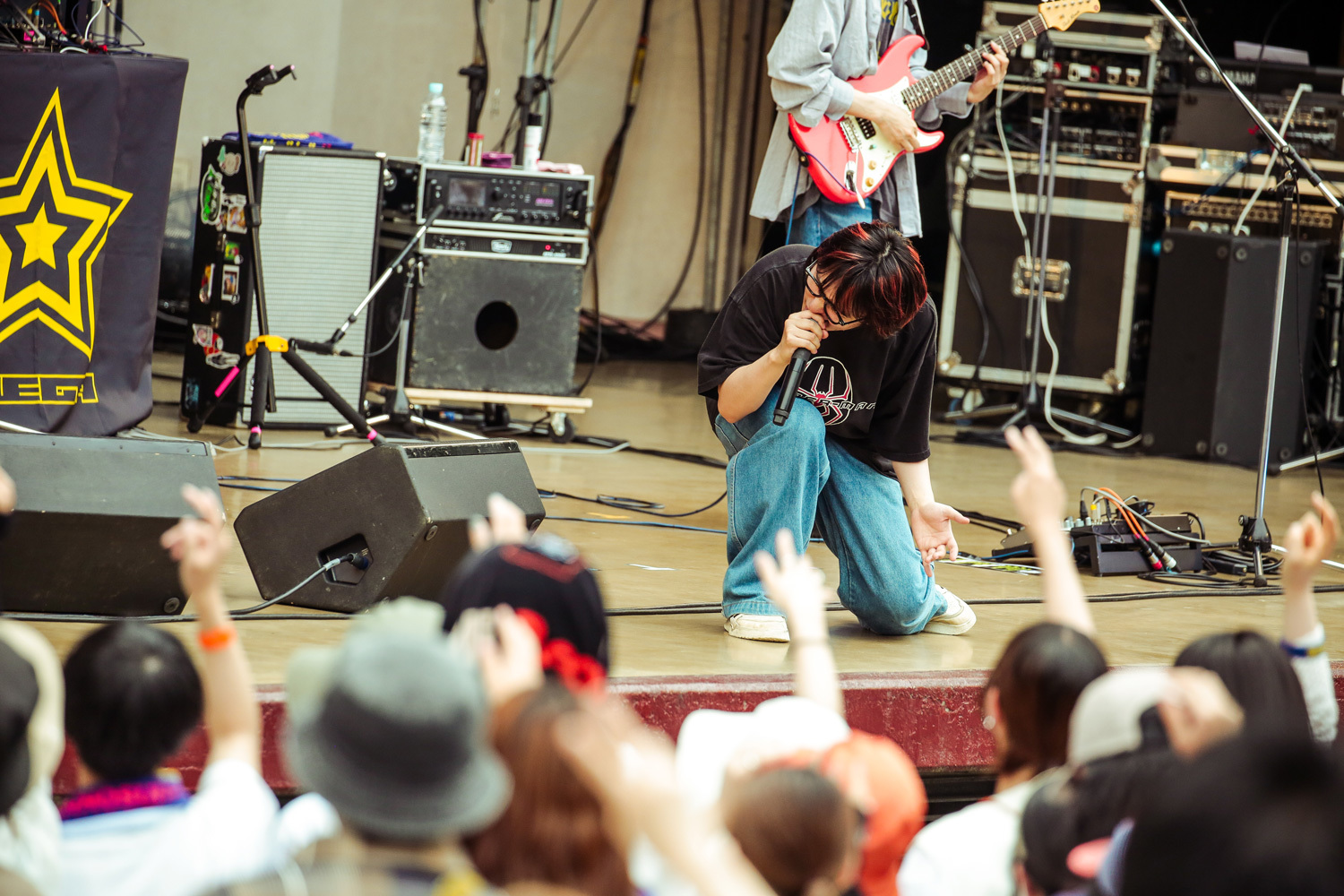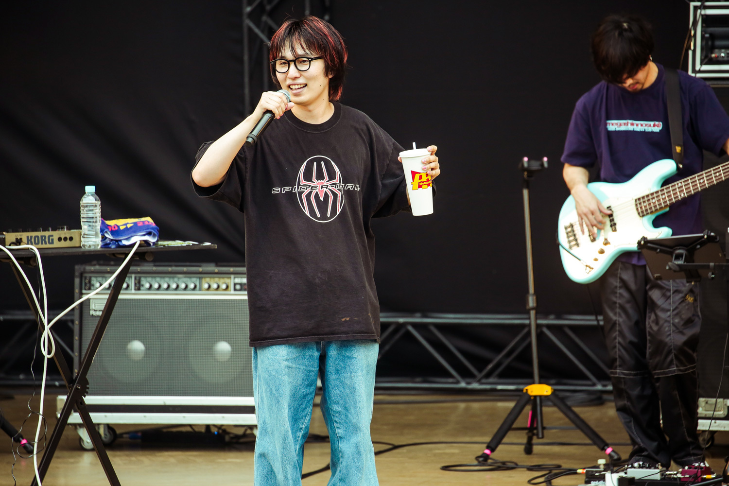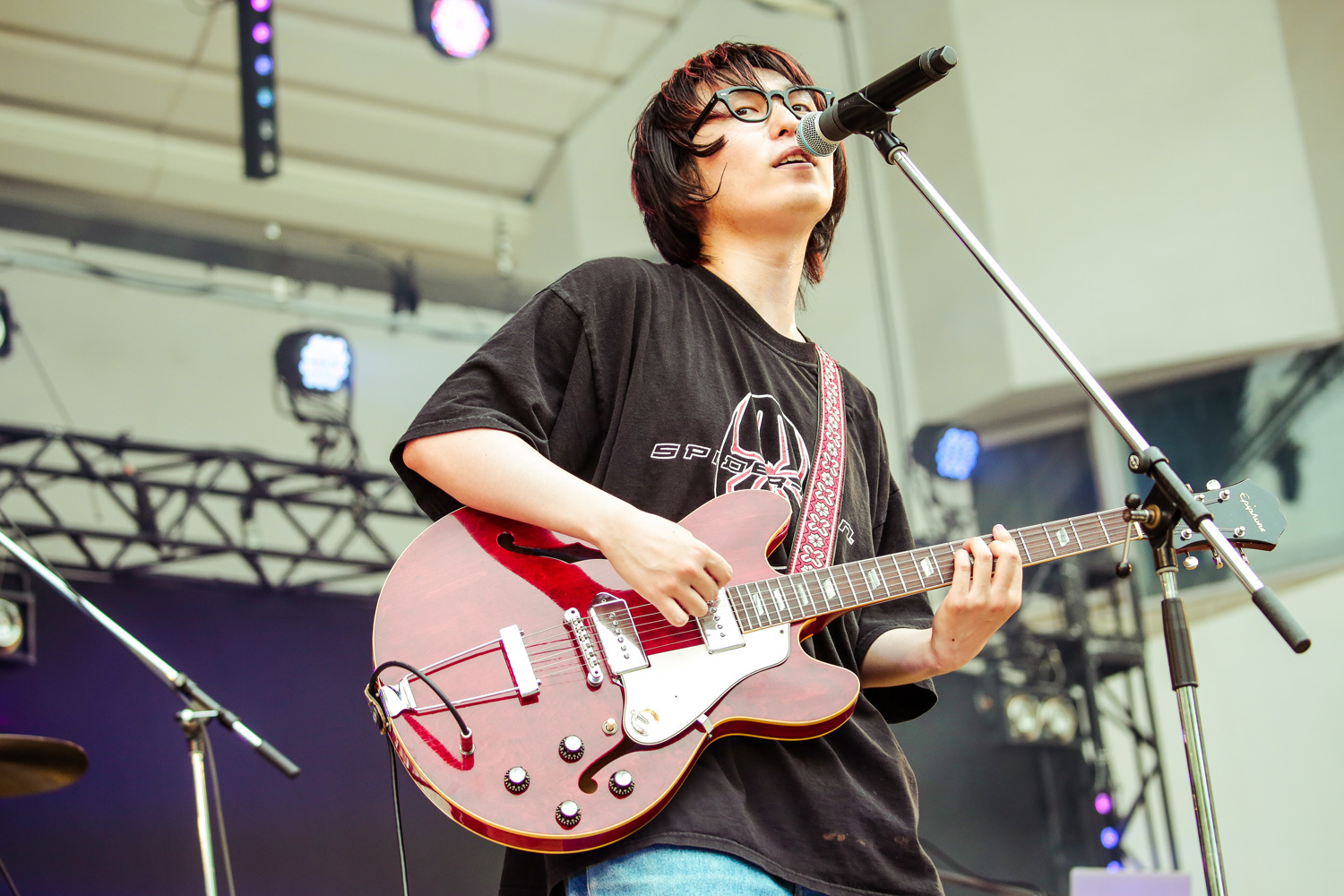 MCでは「アツくなってきたっすね。大阪って街が熱いっすわ! 半袖でライブするのいつぶりかわかんないっすけど……あ、タトゥーいれました!」といつも通りのマイペースな展開から、「ここのステージが気持ち良すぎて」と爽快な表情を浮かべるMega Shinnosuke。さらに「クリエイターの人っている? こういう時、手あげた方がいいよ! 何か目指している人には特に今度のワンマンを観に来てほしい」と呼びかけるアツい場面も。さらに後方の芝生エリアで踊っている観客との掛け合いで会場を沸かせて、「みんなで踊りましょう」と「Sweet Dream」へ。「O.W.A.」「明日もこの世は回るから」でバンドサウンドの熱がさらに上がり、ラストは「車に揺られて帰りますわ」と「甲種街道をとばして alternative ver.」。ソングライティングの幅広さと奥行きがたっぷりと味わえるようなセットで、今に全てをかける鮮烈なステージだった。