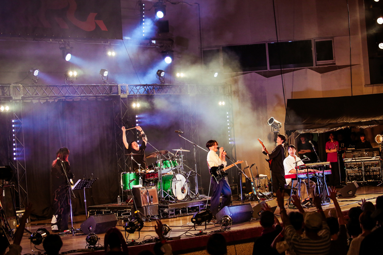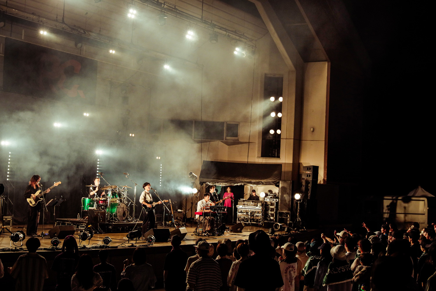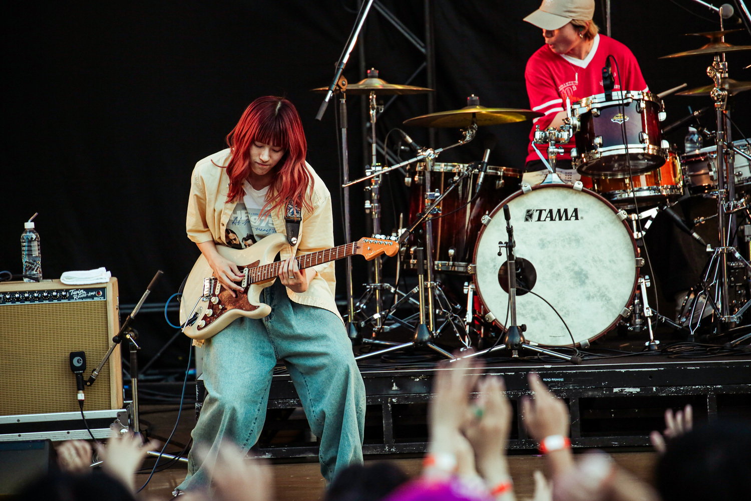 MCでは「アツくなってきたっすね。大阪って街が熱いっすわ! 半袖でライブするのいつぶりかわかんないっすけど……あ、タトゥーいれました!」といつも通りのマイペースな展開から、「ここのステージが気持ち良すぎて」と爽快な表情を浮かべるMega Shinnosuke。さらに「クリエイターの人っている? こういう時、手あげた方がいいよ! 何か目指している人には特に今度のワンマンを観に来てほしい」と呼びかけるアツい場面も。さらに後方の芝生エリアで踊っている観客との掛け合いで会場を沸かせて、「みんなで踊りましょう」と「Sweet Dream」へ。「O.W.A.」「明日もこの世は回るから」でバンドサウンドの熱がさらに上がり、ラストは「車に揺られて帰りますわ」と「甲種街道をとばして alternative ver.」。ソングライティングの幅広さと奥行きがたっぷりと味わえるようなセットで、今に全てをかける鮮烈なステージだった。