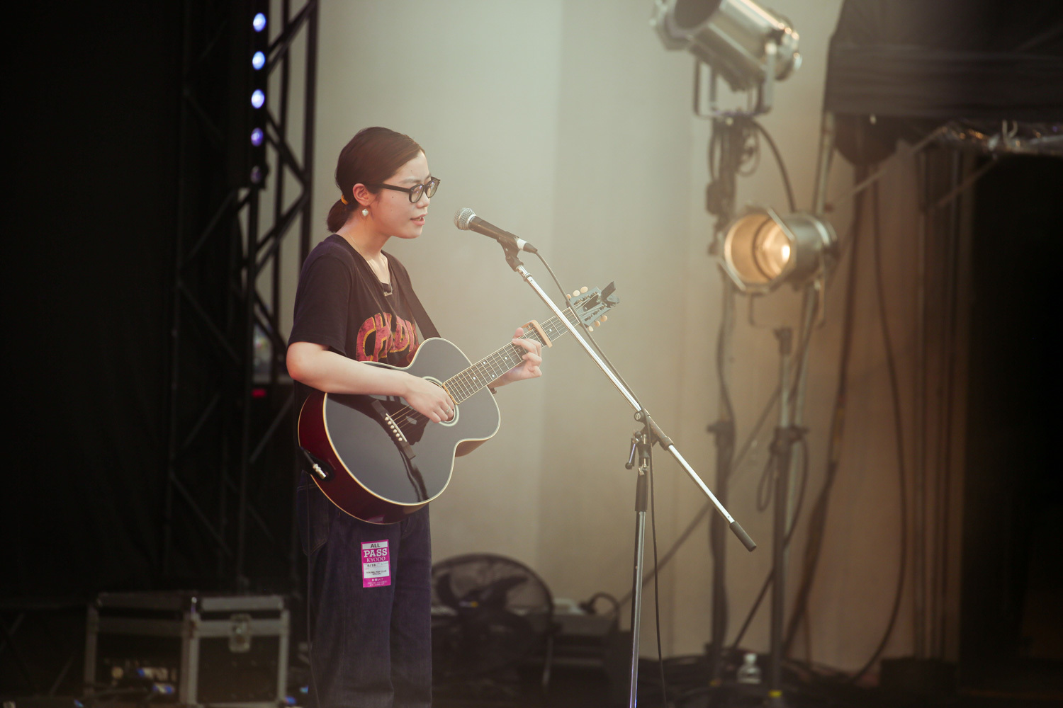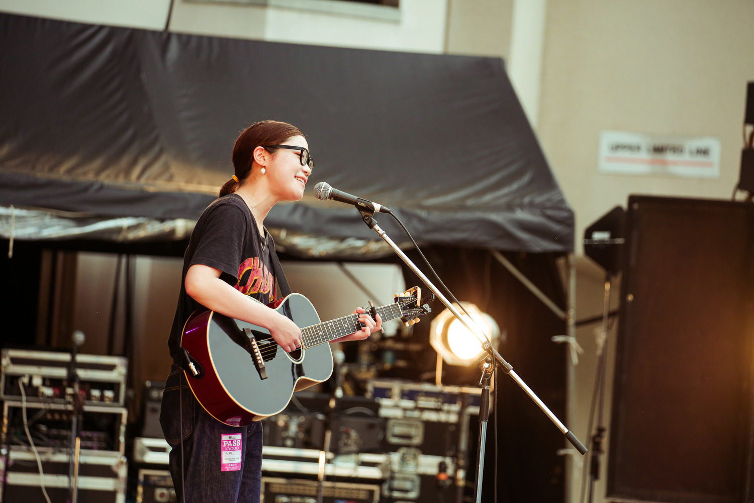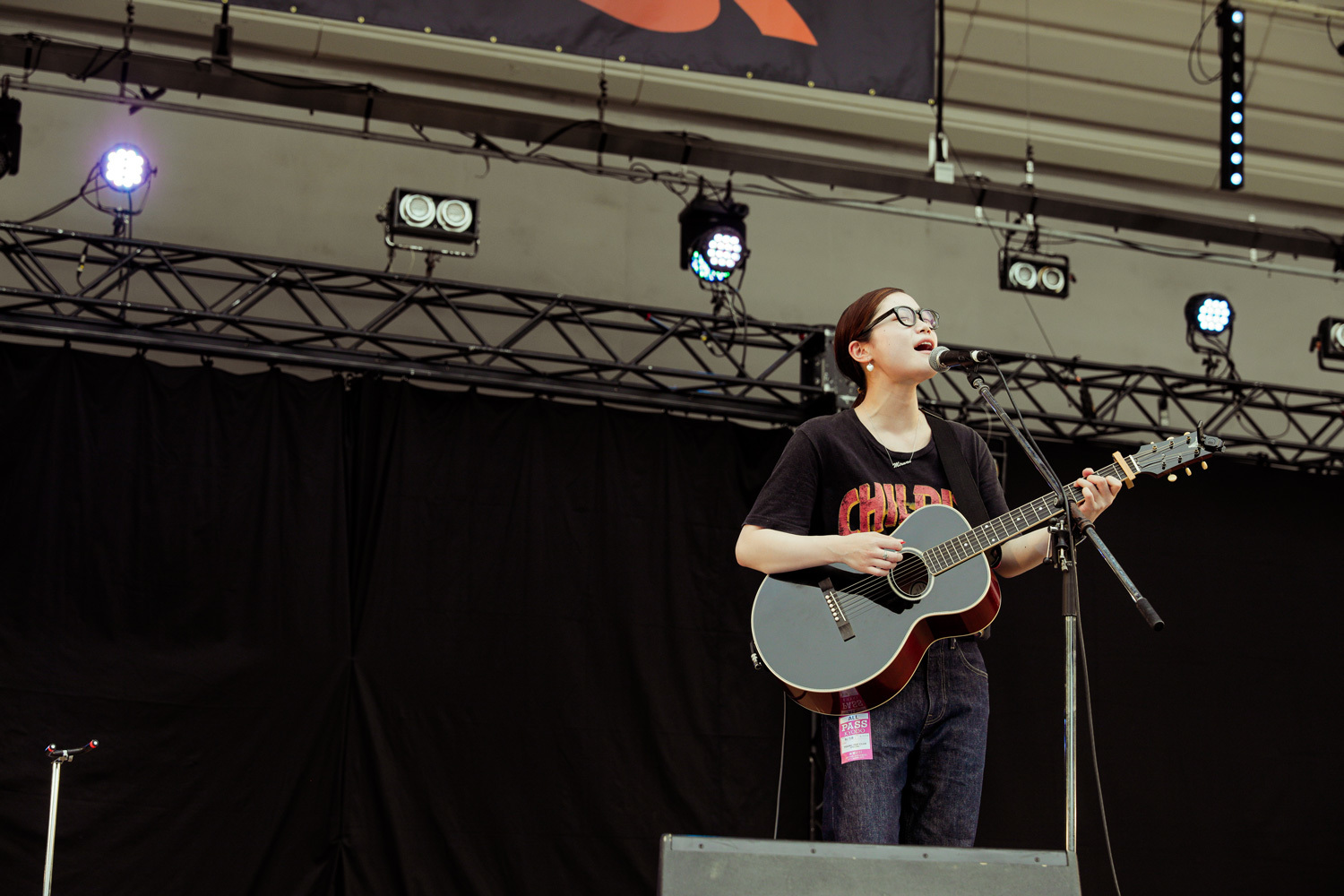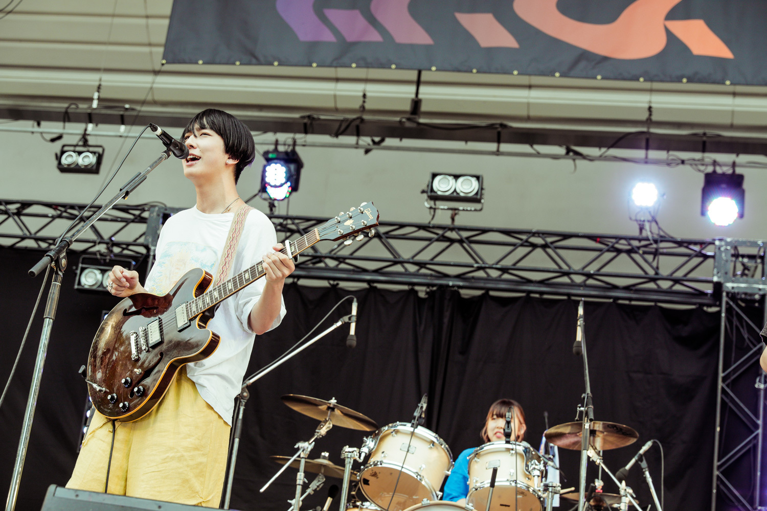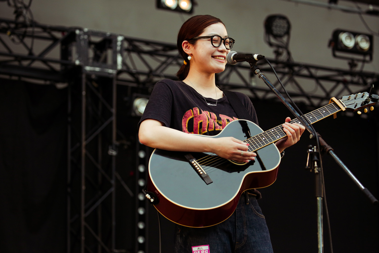 この日、唯一の弾き語りでステージに立った、みらん。1曲目「瞬間」から観客を惹きつける歌声。広いステージで、ひとりギターを鳴らし歌う姿は凛としていて美しくもカッコいい。「ひとりで来ちゃったんで、そりゃ寂しいんだけど……」と少し不安げな表情を浮かべるも、「この景色を独り占めできると思うとやばいよね。ありがとう。焼き付けるように、歌っていこうと思います!」とまっすぐに想いを伝えて「バターシュガー」へ。そして「サニーデイ・サービスの曽我部恵一さんと大阪で作った曲で、きっと今日に合いそうだなと思って」と今度は「低い飛行機」を披露。日常の中で見過ごしてしまいそうな感情や言葉を大切にキャッチして綴られた歌は、この日にもぴったりと寄り添ってくれて、じんわりと心に沁みる。空いっぱいの流れる雲を見上げ、揺れる木々のざわめきや吹き抜ける風を感じながら浴びる、みらんの弾き語りは格別だなぁ、と感じたのは筆者だけではないはず。