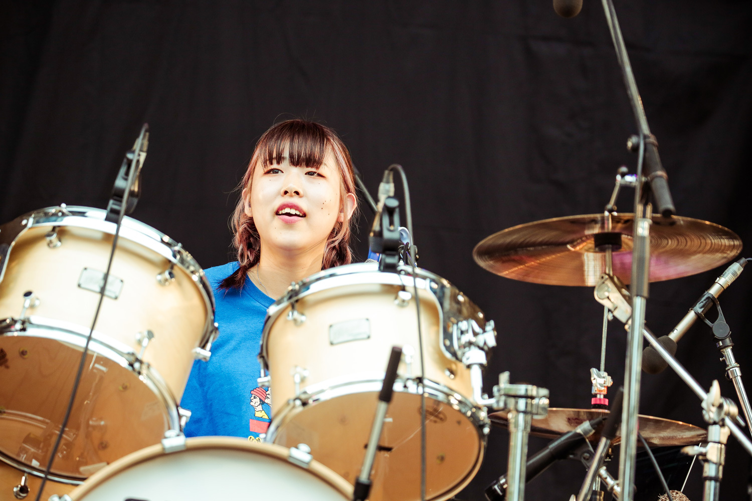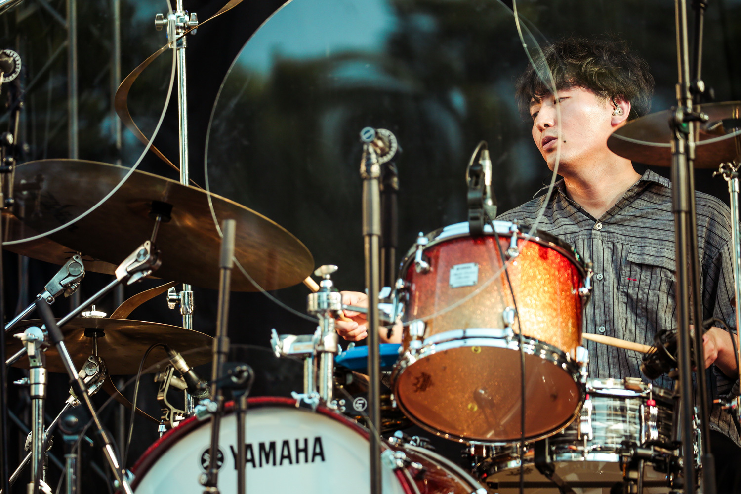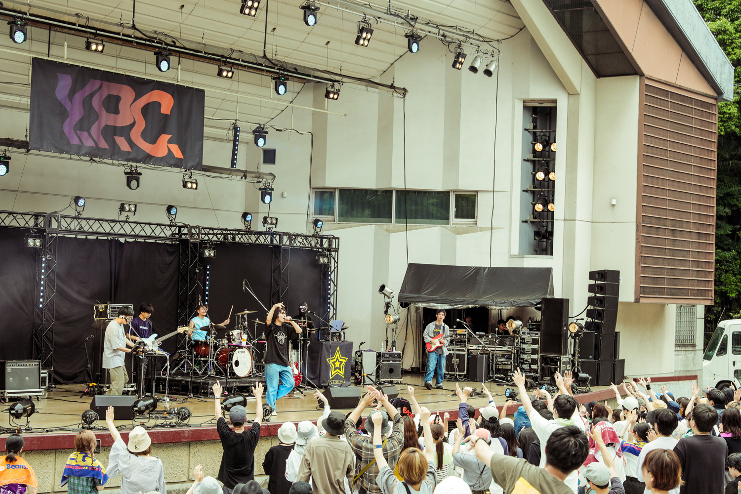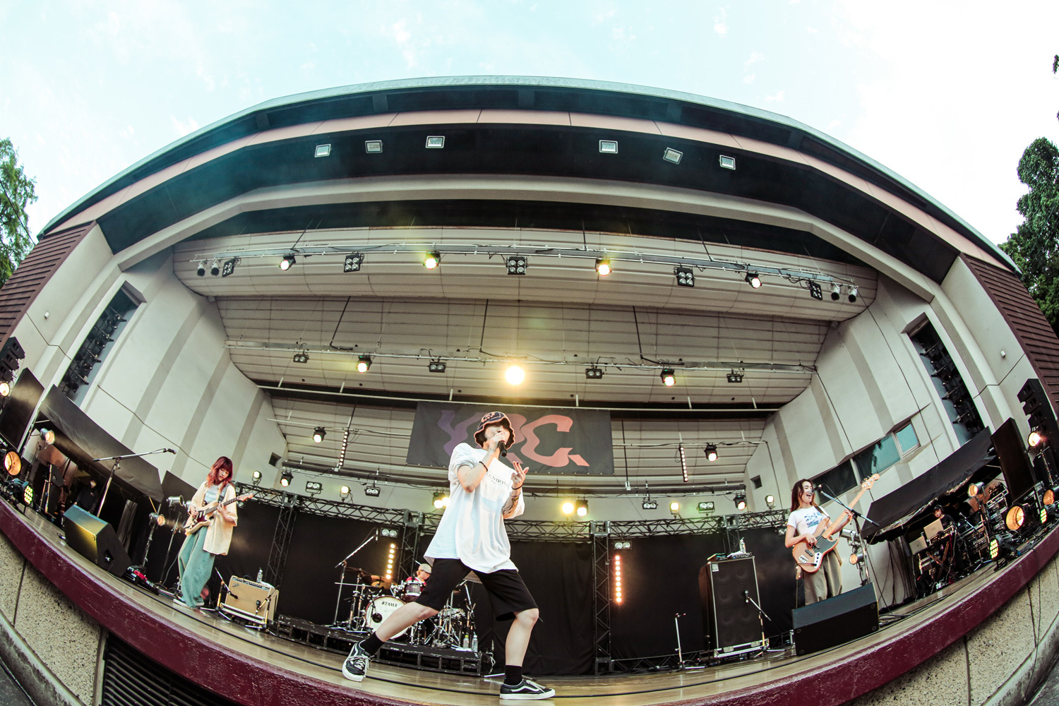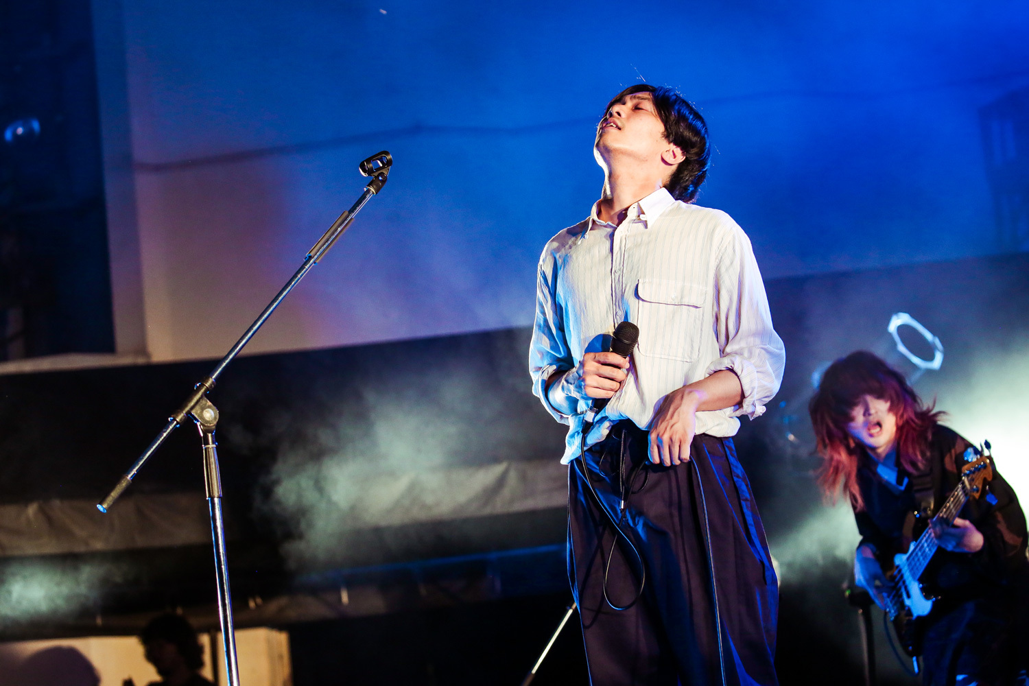 リハーサルの「あたらしい朝」から、早くも観客の心踊らせていたのは、リュックと添い寝ごはん。この日の出演者の中で、唯一今回が『YPC』初出場となる。1曲目「青春日記」から松本ユウ(Vo.Gt)の声が野音の空にまっすぐと伸びていき、リズムに合わせて揺れるフロア。曲終わり、さっそくメンバーでトークを始め「ちょうどいい天気! 初夏の感じですね!」と野外の開放感を感じながら感想を語り、「裸足なんですけど……薬指の爪だけ長くてはずかしい」と松本が明かして笑いを誘う。そんなチャーミングなMCとは裏腹に、分厚いバンドサウンドで魅せていく「渚とサンダルと」。波のようにうねる堂免英敬(Ba)のベースラインに、ぬん(Gt)の奏でる海面のように煌めくギターが心地いい。