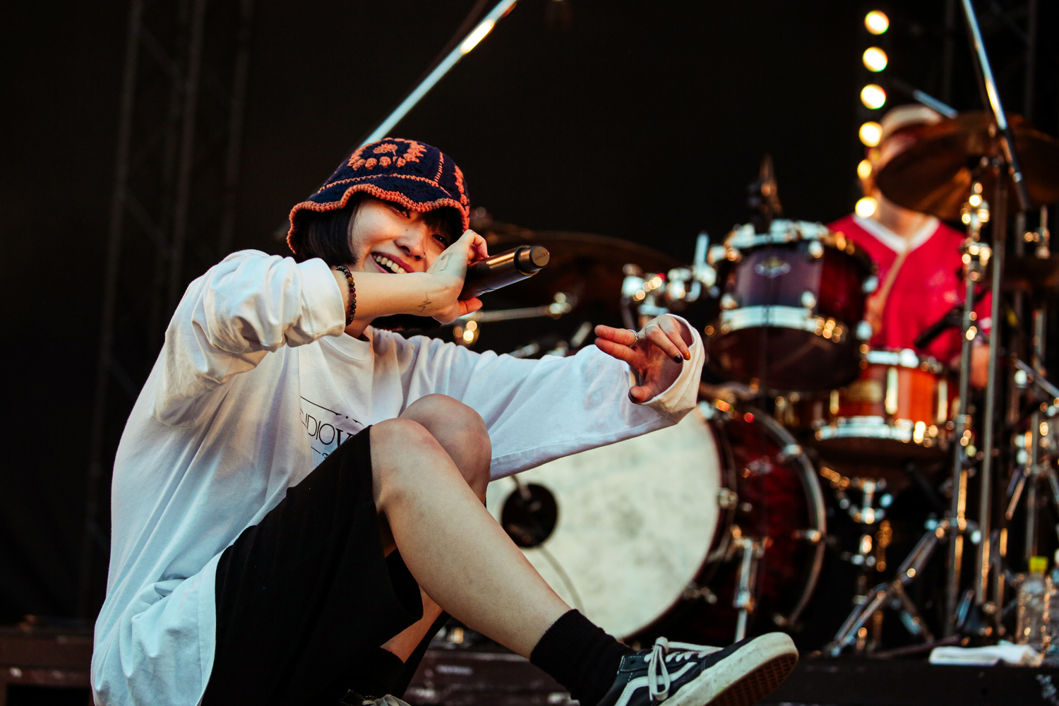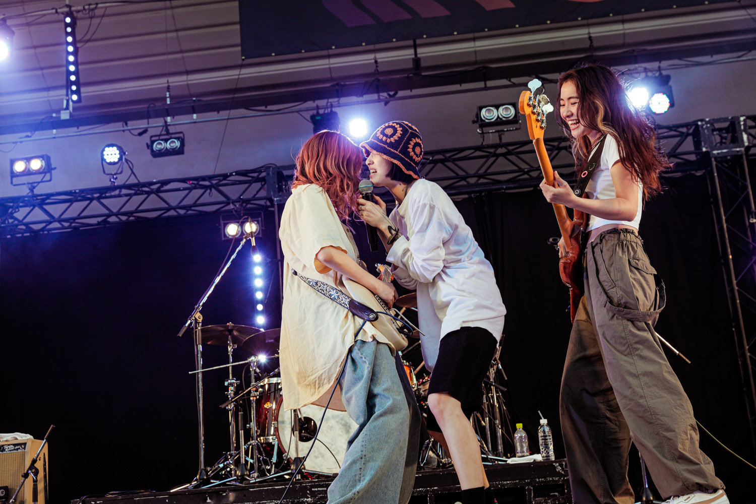 Maika(Ba.Vo)の弾き出すベースラインが体を揺らした「rose feat.Vaundy」を経て、MCではMaikaが挨拶。「バイブスがハッピーだよね」と嬉しそう。Motoも「きもちいです。最後まで楽しんでくださいっ!」と笑顔。ほどよく力が抜けた空気感も彼女たちの魅力だ。続いてLily(Gt.Vo)のボーカルから始まる「L.I.B」を無邪気さ全開で披露。客席は大きく手を挙げ体を揺らす。落日の野音にぴったりの「アンドロン」と「Vacance」で切なさを醸し出し、後半は勢いを増して「lemonade」「Tremolo」とアンセムを連続で投下。「シェキララ」でMotoが被っていた帽子をタオル代わりにぐるぐる回すと、客席でも一斉にタオルの花が咲く。ラストはLilyがタイトルを名付けた新曲「you n me」で締め括る。MCでMaikaが「今までやった方々がこの空気を作ってくれた感じがして温かい気持ちです」と話していた通り、イベントスタートから繋がれたバトンは素晴らしい形で大トリのBialystocksに渡された。