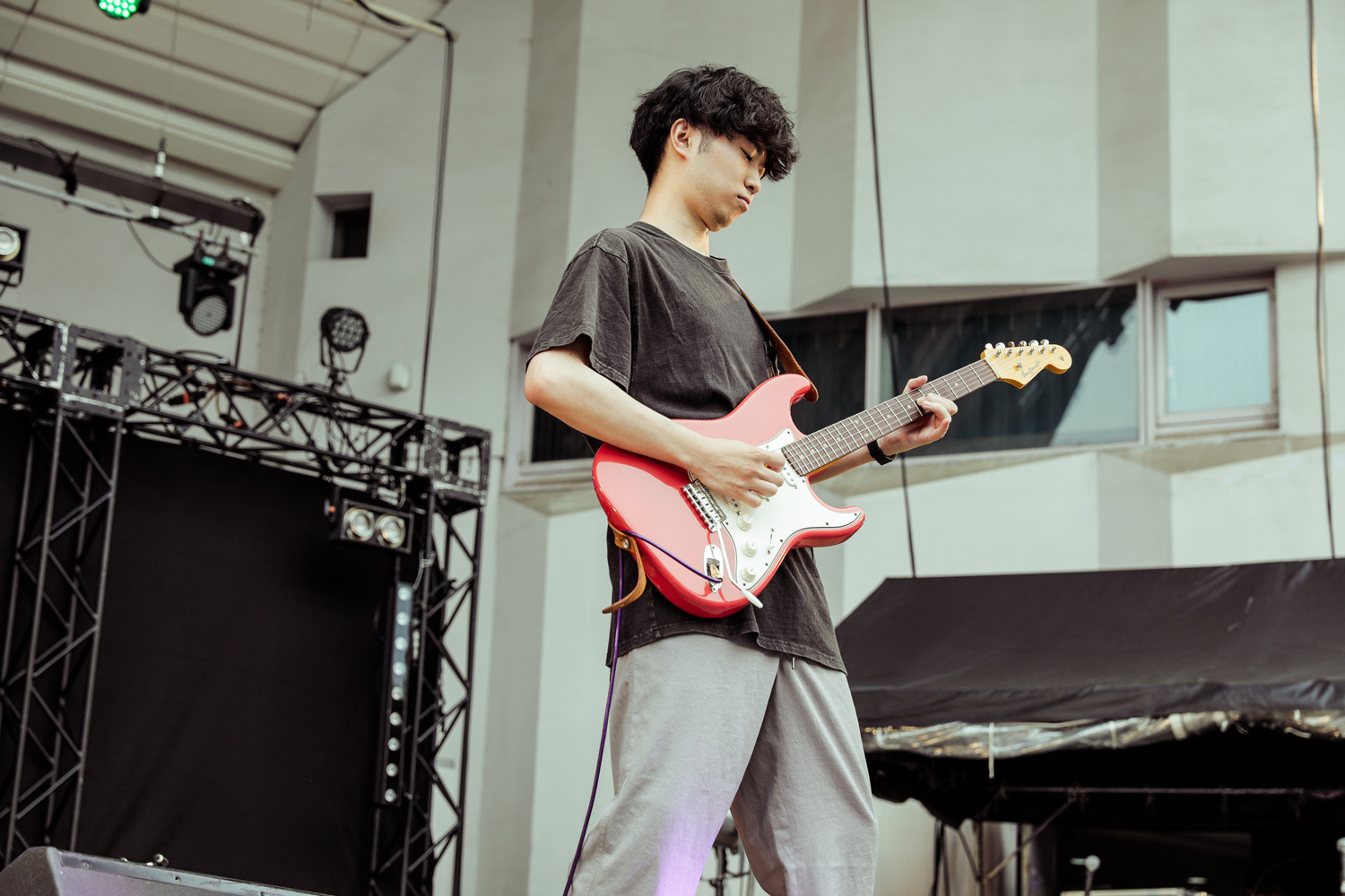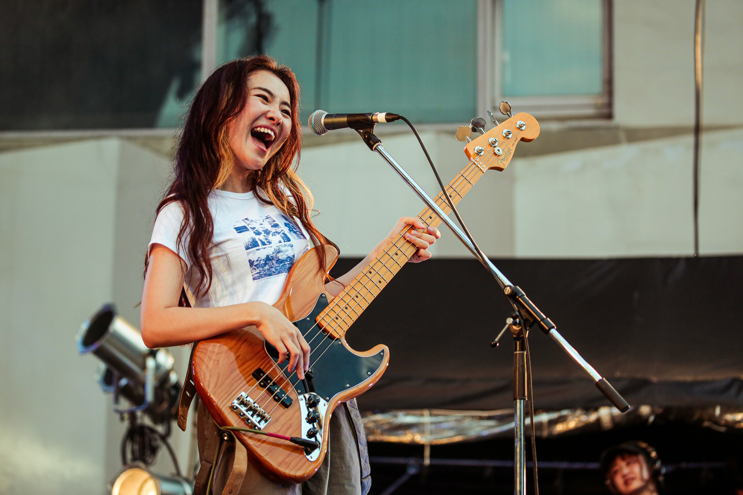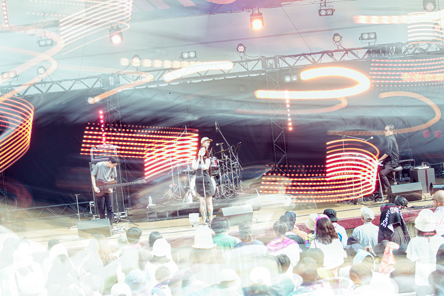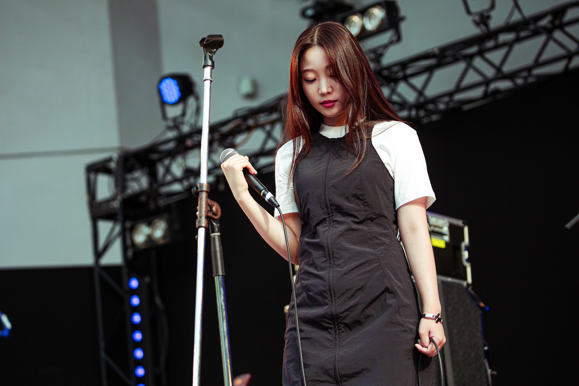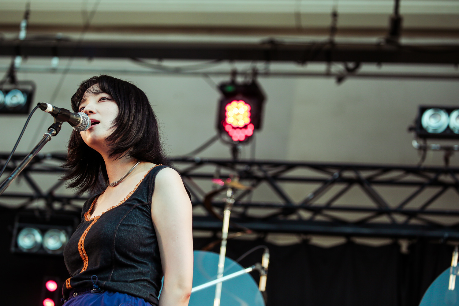 今年3月に心斎橋・Live House ANIMAで行われた『YOUNG POP CLUB vol.10』以来、大阪でのライブは2度目のHaruy。サポートにTAIHEI(Key/Suchmos、賽)、市川仁也(Ba/D.A.N.)、澤村一平(Dr/SANABAGUN.)を迎えて登場した。彼女がリハーサルを始めると、これまで曇っていた空から太陽が顔を出し、ステージを照らし出した。柔らかく澄んだ彼女の歌声からは神秘性も感じられるが、まるで天気も意思を持って彼女を応援しているかのようだと感じてしまう。1曲目は「Snake」。目を閉じてしっとりとウィスパーボイスを響かせる。