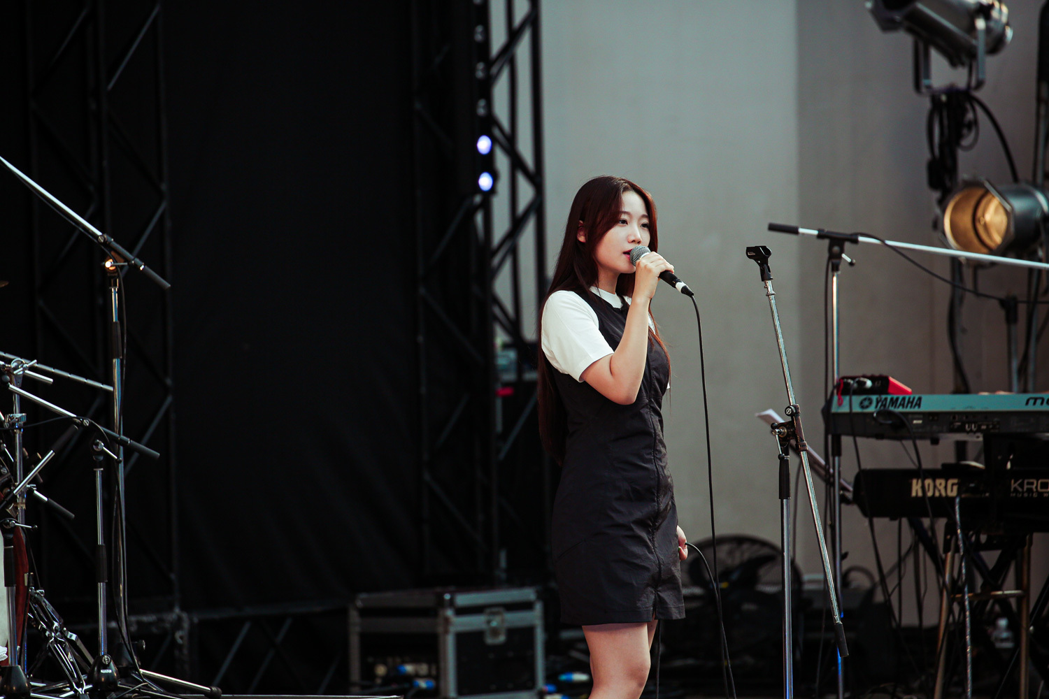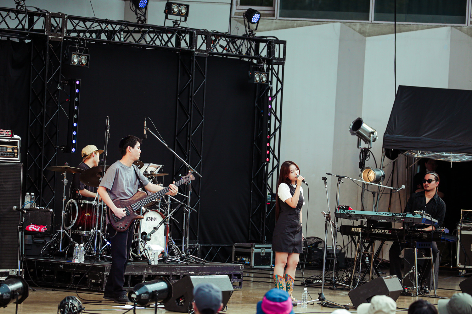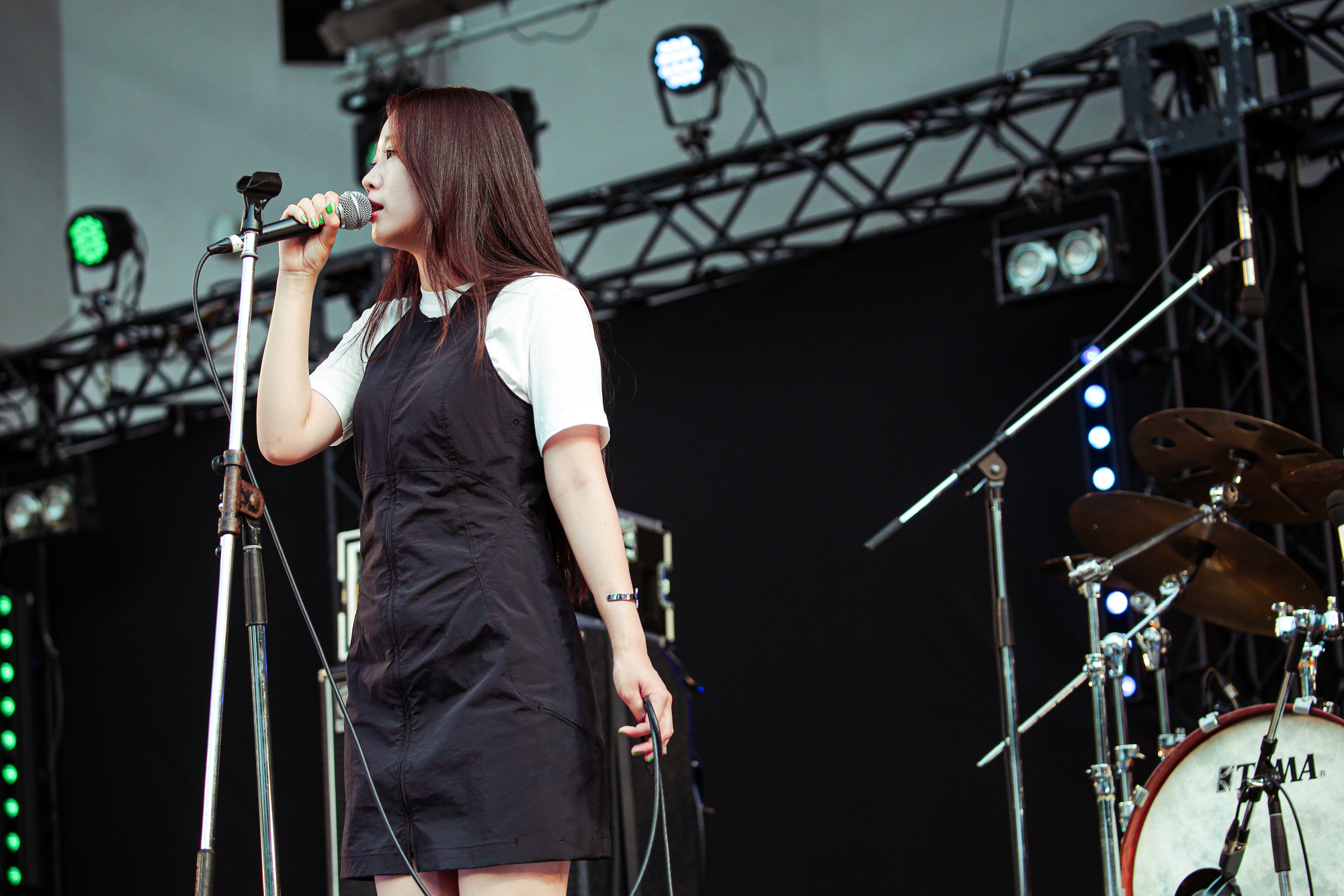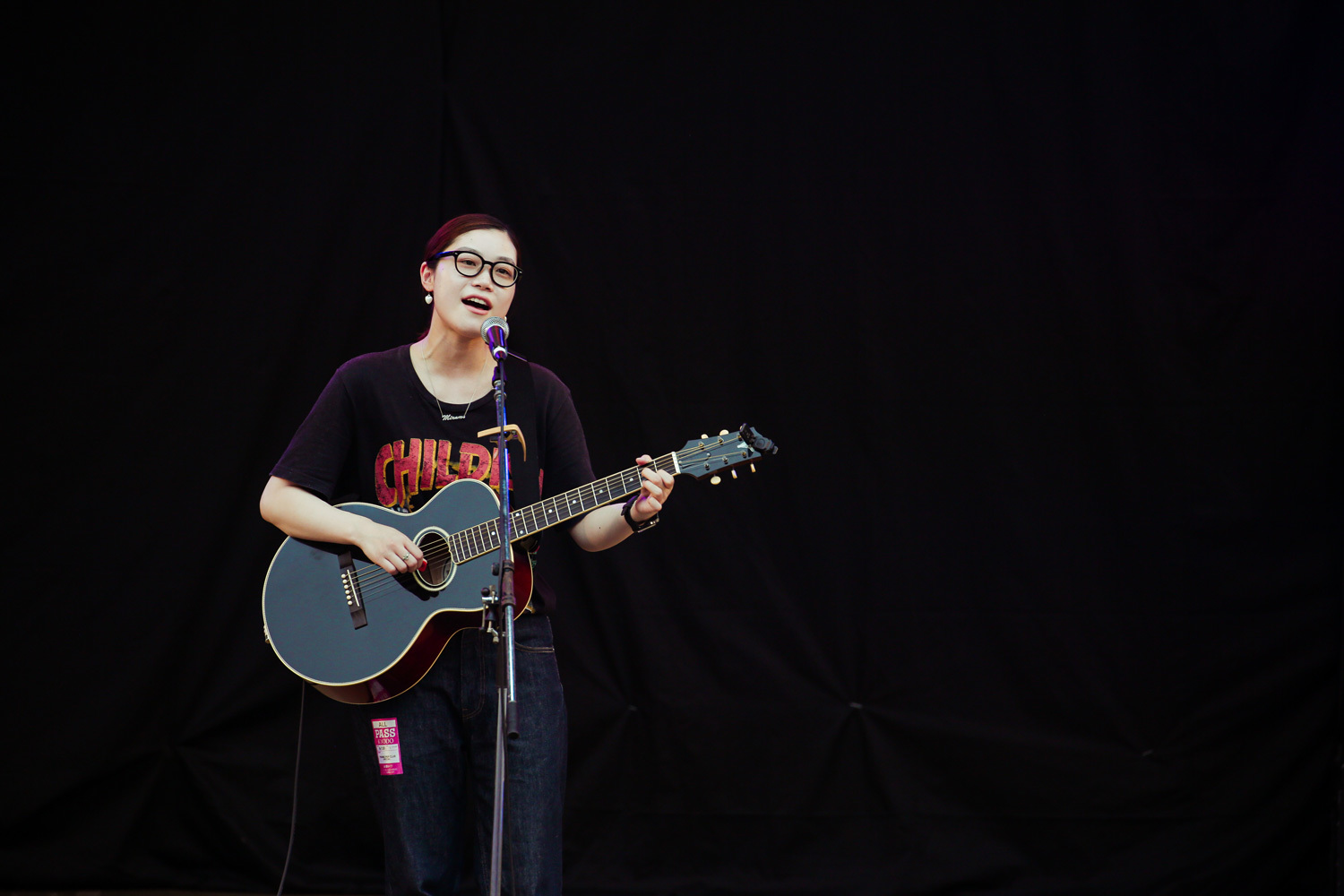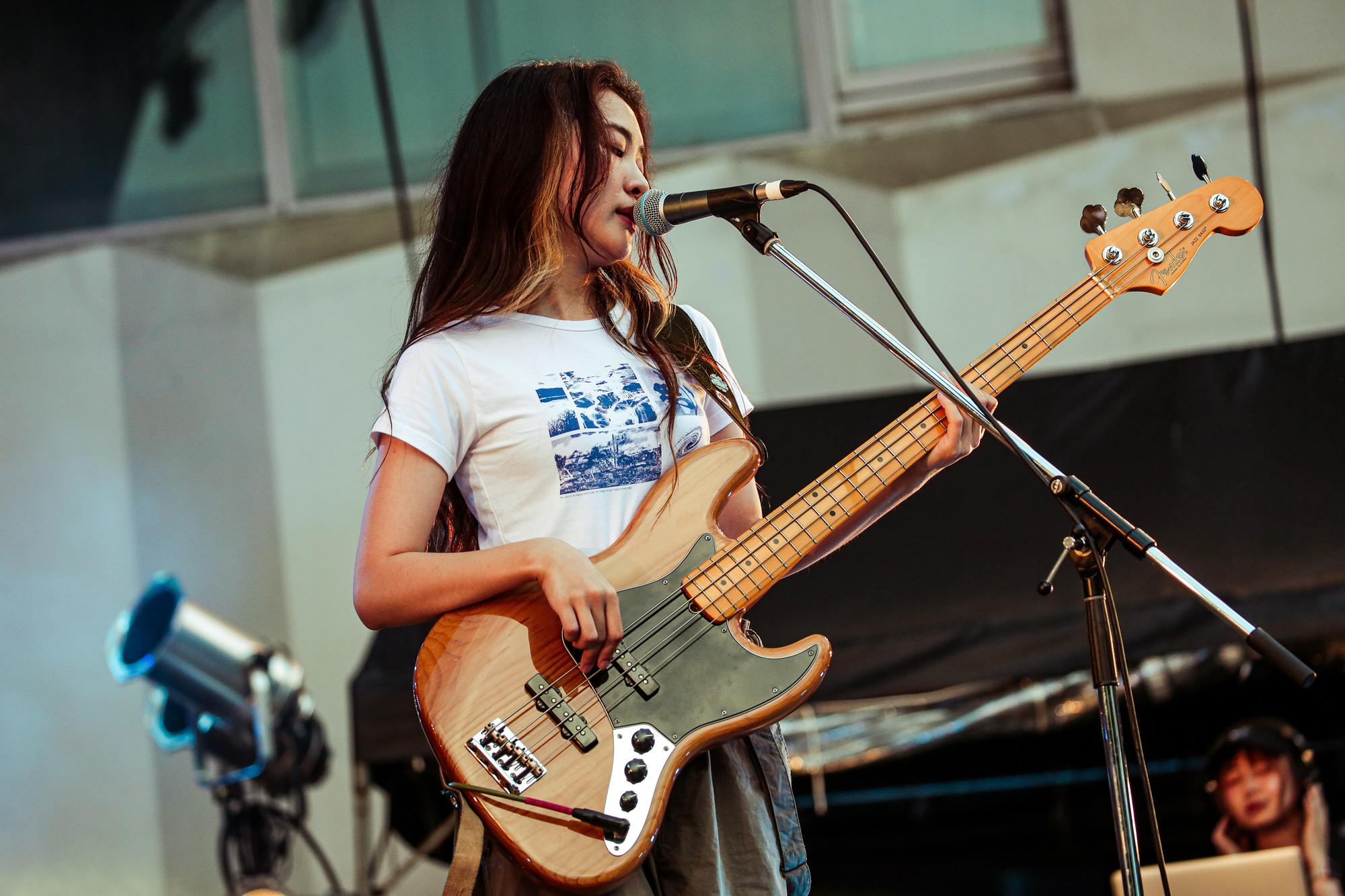 今年3月に心斎橋・Live House ANIMAで行われた『YOUNG POP CLUB vol.10』以来、大阪でのライブは2度目のHaruy。サポートにTAIHEI(Key/Suchmos、賽)、市川仁也(Ba/D.A.N.)、澤村一平(Dr/SANABAGUN.)を迎えて登場した。彼女がリハーサルを始めると、これまで曇っていた空から太陽が顔を出し、ステージを照らし出した。柔らかく澄んだ彼女の歌声からは神秘性も感じられるが、まるで天気も意思を持って彼女を応援しているかのようだと感じてしまう。1曲目は「Snake」。目を閉じてしっとりとウィスパーボイスを響かせる。