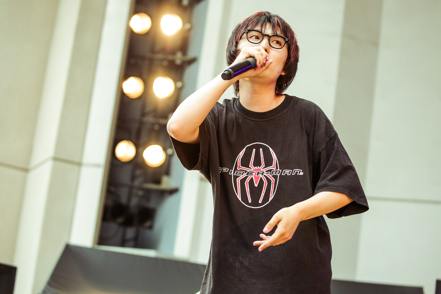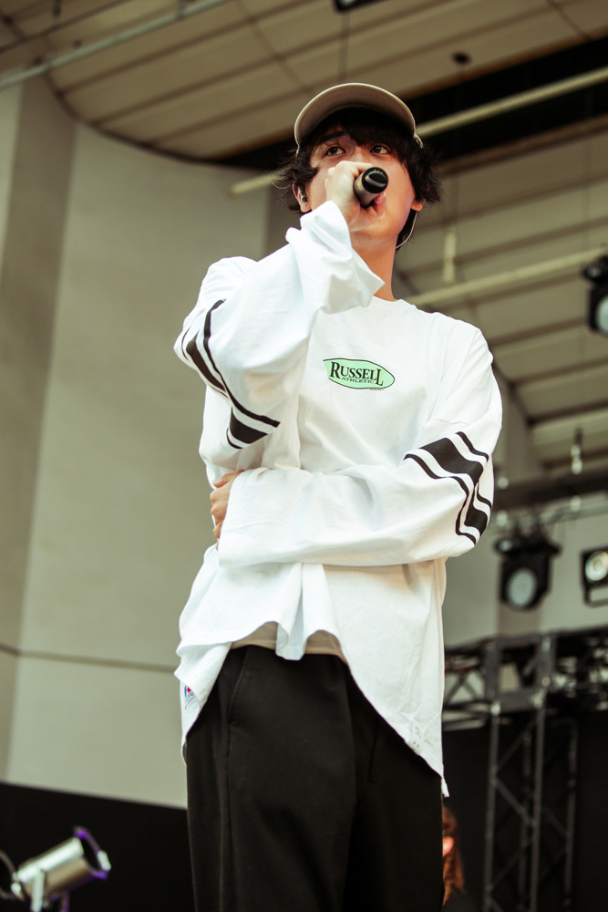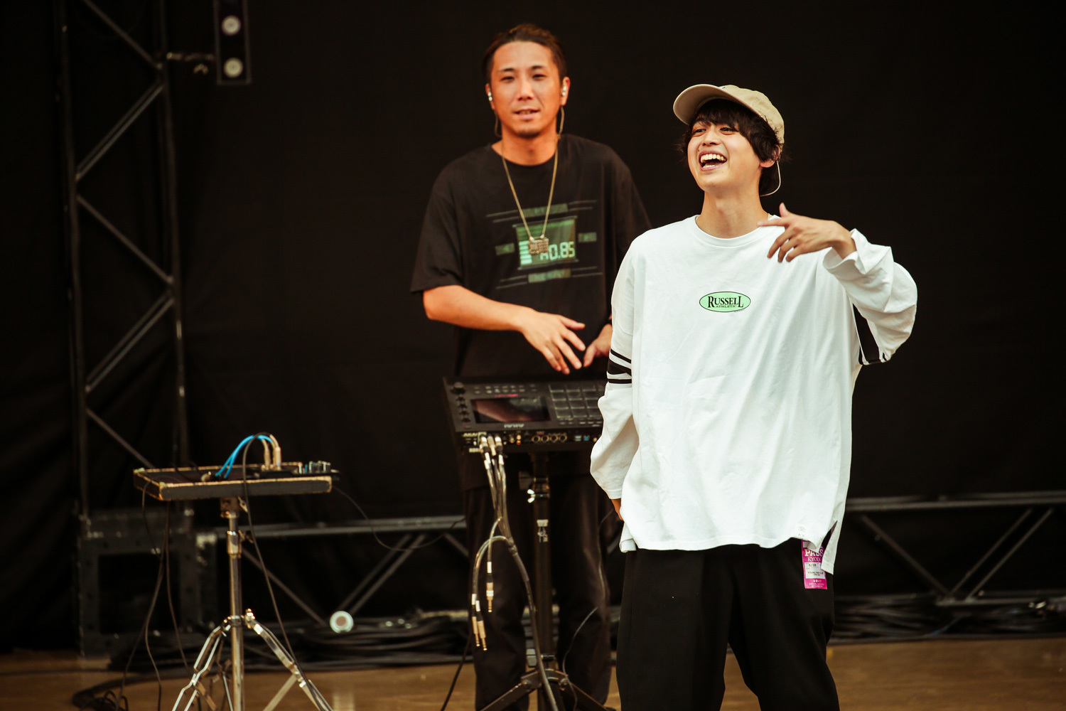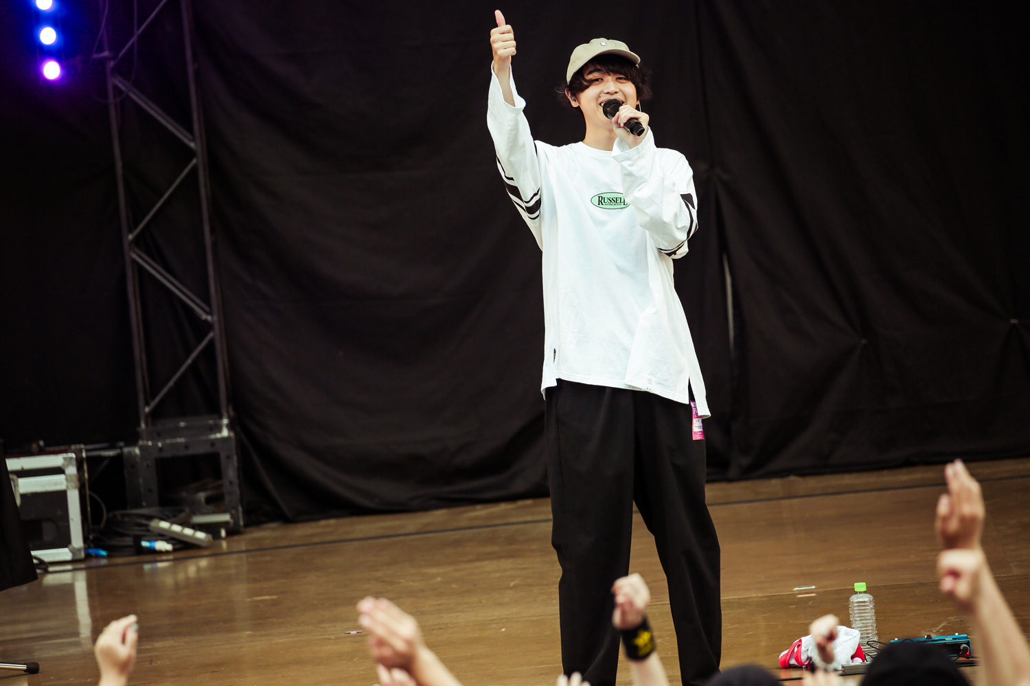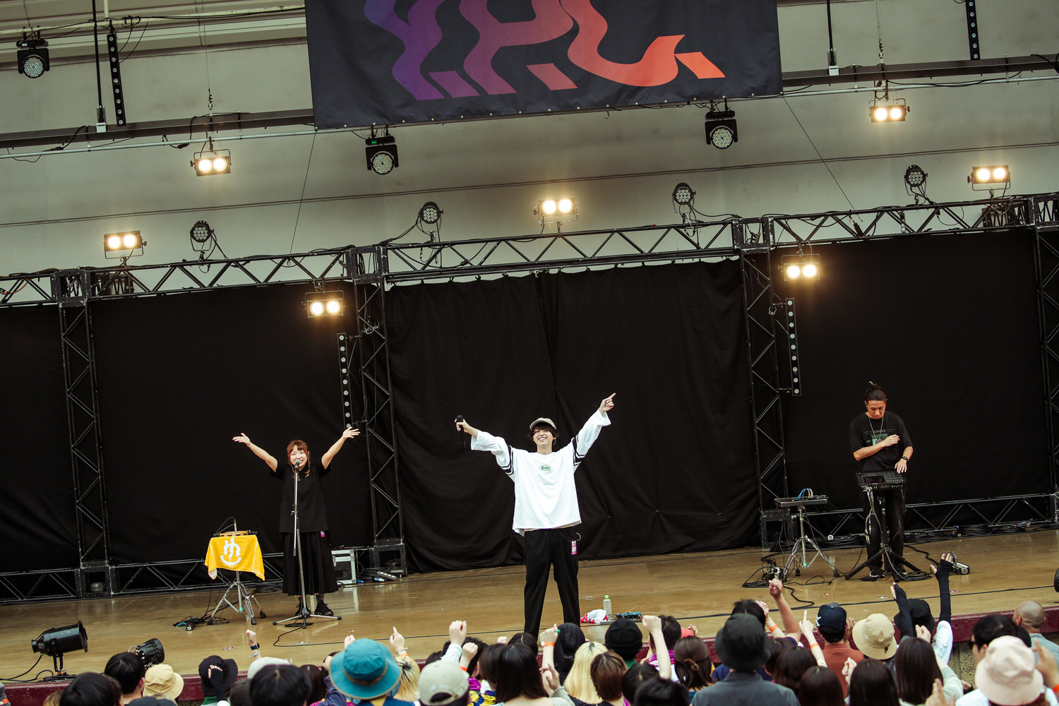 人懐っこいキャラクターで観客とコミュニケーションを取り、朗らかな雰囲気で会場をひとつにしたのは、ラッパーでトラックメーカーのぜったくん。「大阪、調子どうですか? ゆったりいこう」と「Midnight Call」でゆらゆらチルタイム。コーラスのキミカとMPCプレイヤーのKO-neyによるサポートも最高に気持ち良い。「皆さん、種族は何ですか?」の呼びかけに応える形でコール&レスポンスがキマった「人間」で同盟を結び、手持ちの飲み物を掲げて乾杯ポーズをした「orange juice」でさらに観客との距離を近づける。