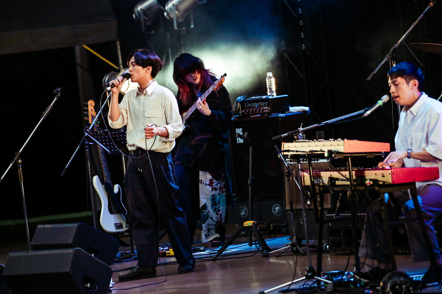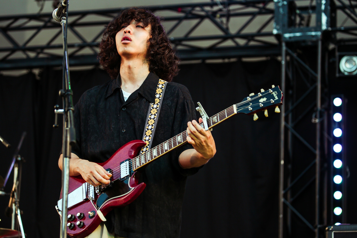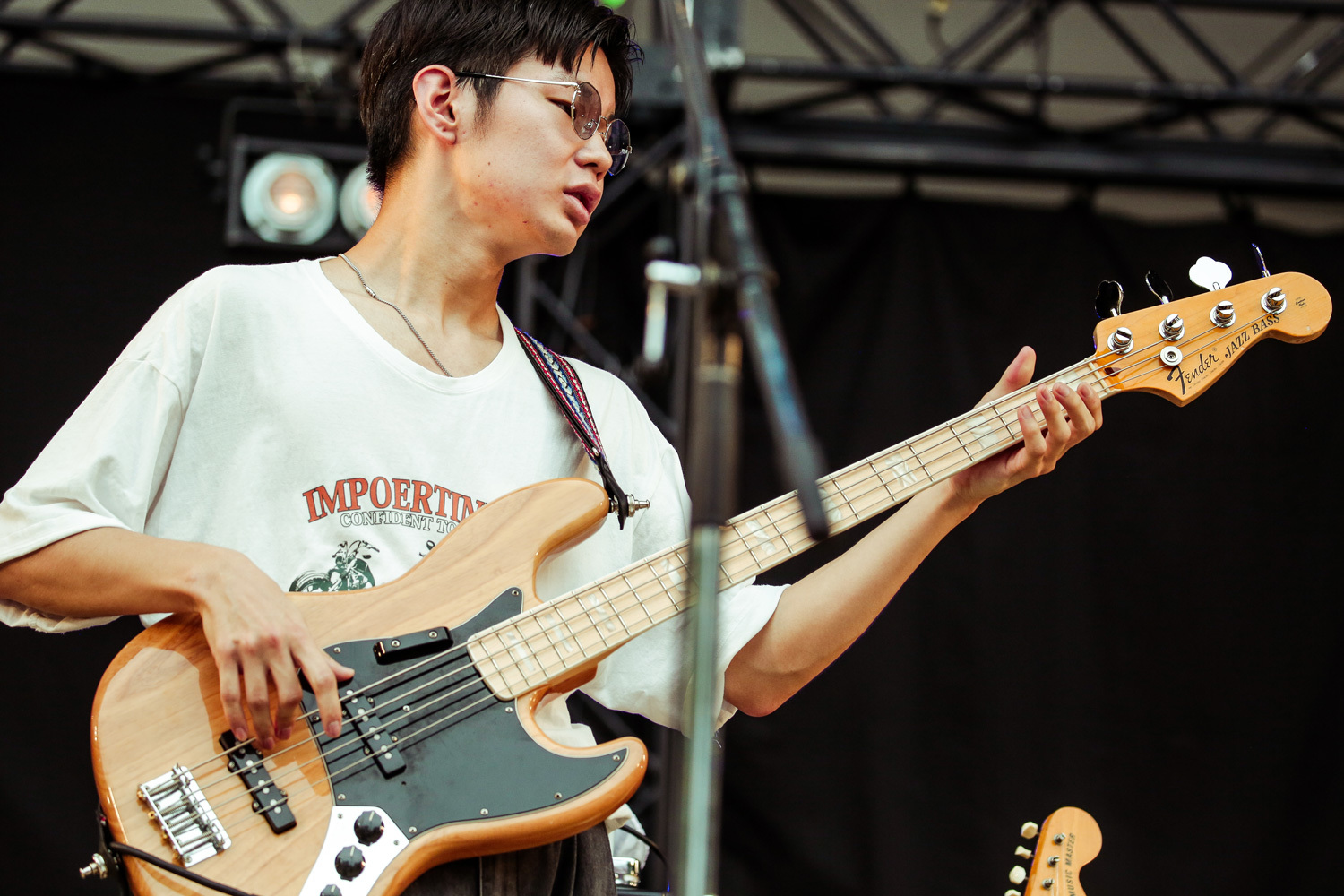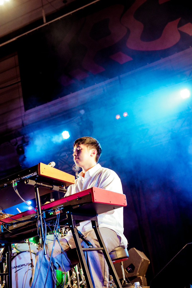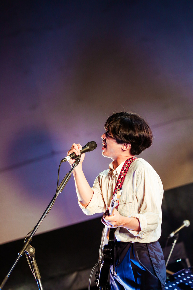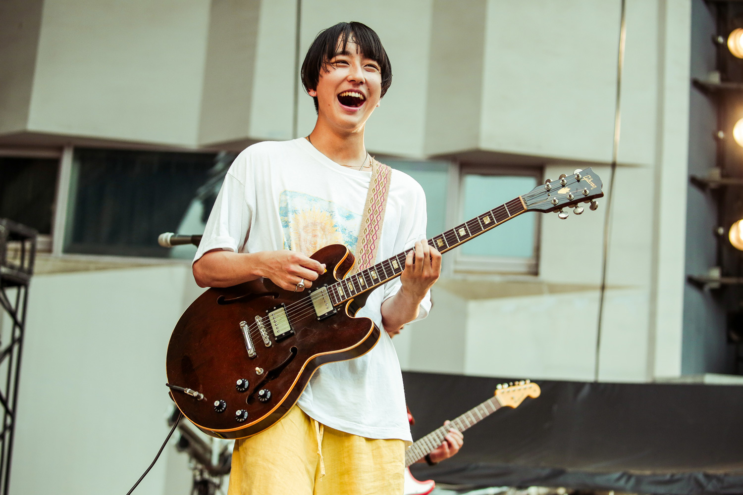 時刻は19時を過ぎたが空はまだ明るい。3日後には夏至が訪れ、本格的に夏が始まる。そんな夏の入り口に大トリをつとめたBialystocksは、圧倒的なパフォーマンス力でその実力を知らしめた。この日のサポートメンバーは朝田拓馬(Gt)、Yuki Atori(Ba)、小山田和正(Dr)。まずはカントリー要素のある「Emptyman」から軽やかに音を飛ばす。甫木元空(Vo)の透明感のある歌声とフェイクが最高に気持ち良く、早くも多幸感に満たされる。しかし一転、「コーラ・バナナ・ミュージック」ではダーティーで力強い音の波に飲み込まれる。「ようこそおいでいただきました」と甫木元が改めて挨拶すると客席から大歓声が上がり、嬉しそうにはにかむ。「我々はさっきしゃぶしゃぶを食べたので、すごい元気なんで」と気合いのMCを挟むと「差し色」を披露して極上の時間を作り出した。