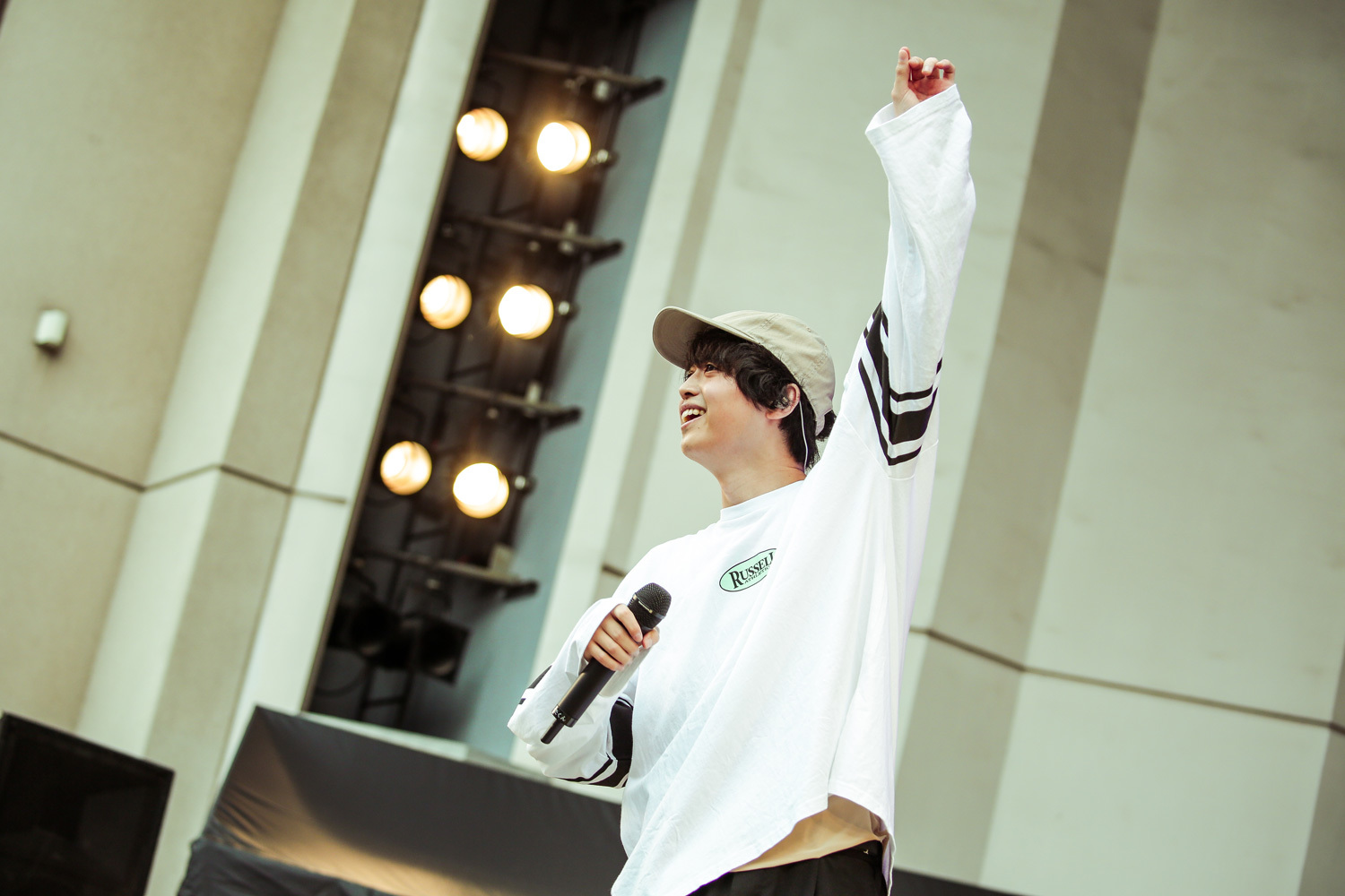 1曲終わるごとにMCを挟み、「みんな東京に来るとその土地の名前を言うわけよ。渋谷、調子どう? とか、新宿調子どう?って。何で大阪は大阪のままなんだ! と思ったので最寄りを調べたんです」とまさかの「森ノ宮」コール。これには歓喜の声が上がる。「Man Say Blen」「Bad Feeling」に続いては、夏にぴったりの新曲「サンダループ」をドロップ! <サンダル飛ばす距離選手権>のリリックに合わせて、自身が履いていたサンダルを控えめに飛ばして盛り上げる場面も。ラストチューン「Catch me Flag!!?」ではキャッチーなメロと跳ねるリズムがクラップを誘い、後方までジャンプで踊らせる。「後ろのお父さんもありがとう!」と言える人柄にはほっこり。1度見たら好きになってしまうステージで魅了したぜったくんだった。