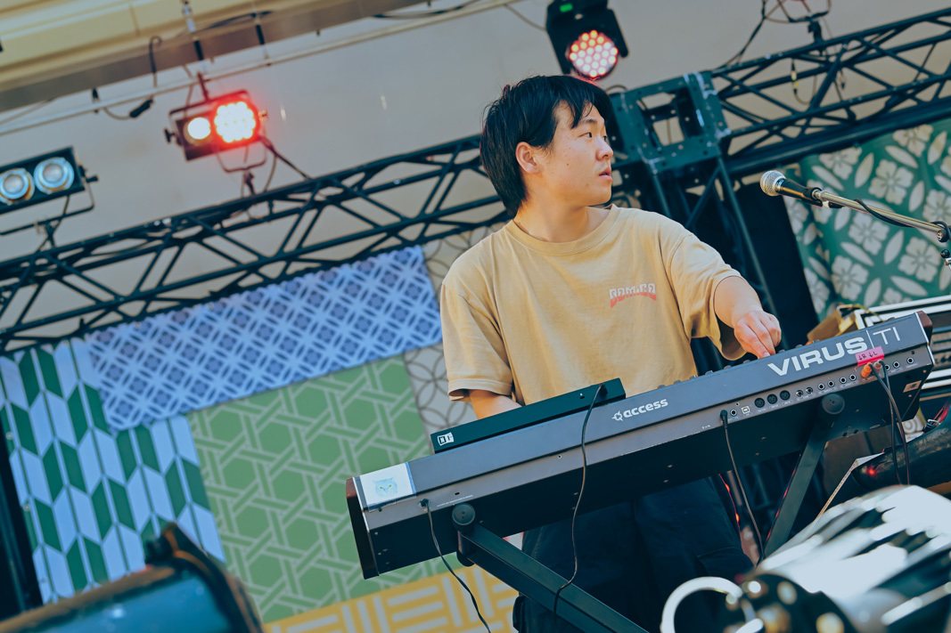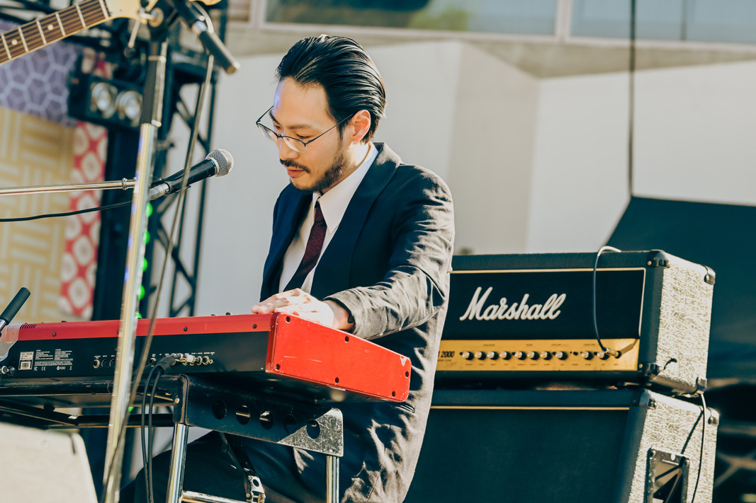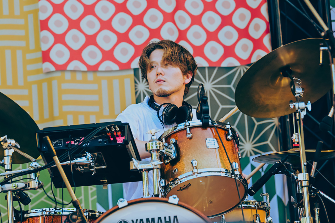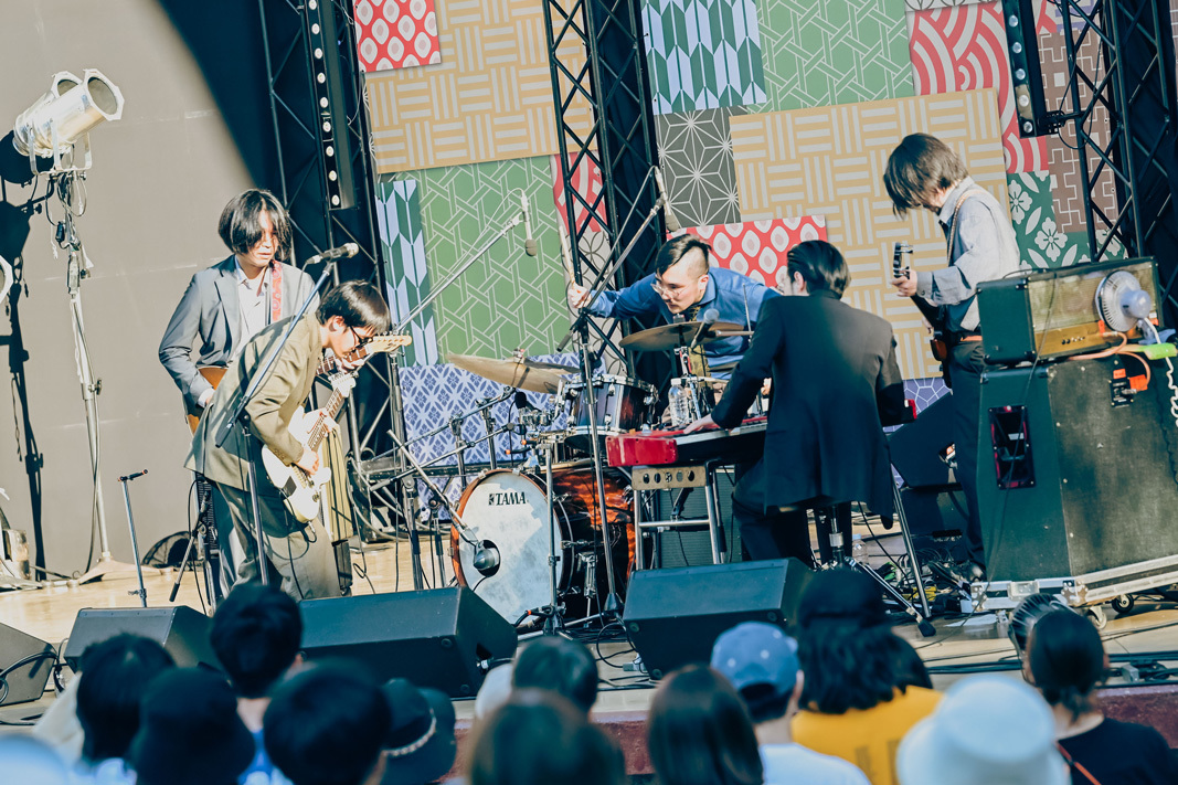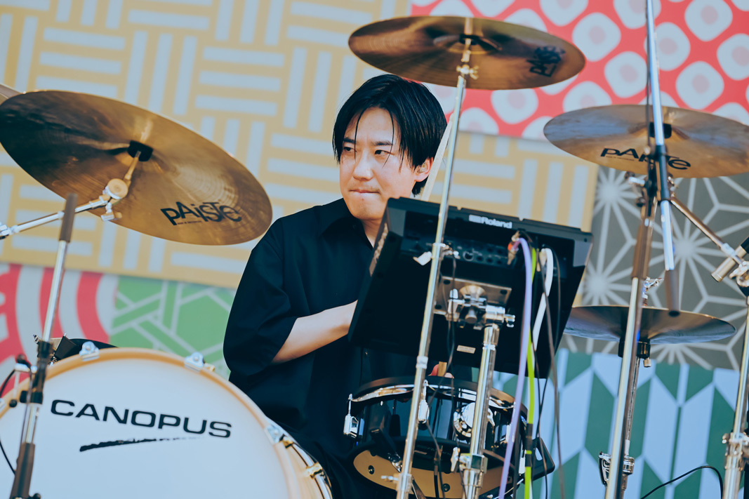 続いて、So Kanno(Dr)と高木のビートが響き渡るとフュージョン色が強めの「ナイトクルージング」で音の深海へ導いてゆく。MCでは高木が観客を労い、「俺ら大阪滞在4時間らしいっすよ。だから出し切らなきゃいけない」との言葉に、いけだがマイクを通さず「大阪ー!」と叫び、客席に火をつけて5月に配信リリースされたばかりの「yonaki」をメロウにプレイ。高木のウィスパーボイスが野音を吹き抜ける風に混ざり合う。「MUSICA」では美しいメロディと5人の超絶技巧が生み出すアンサンブルで多幸感に包まれる。