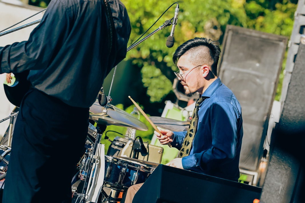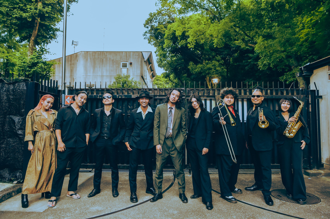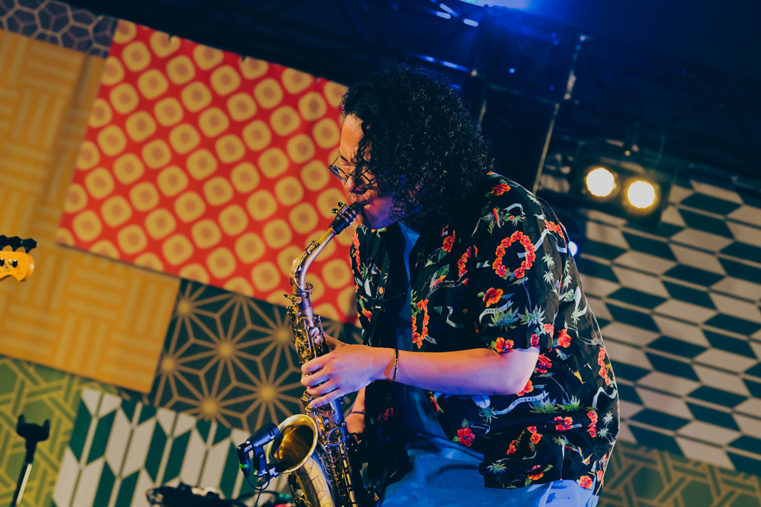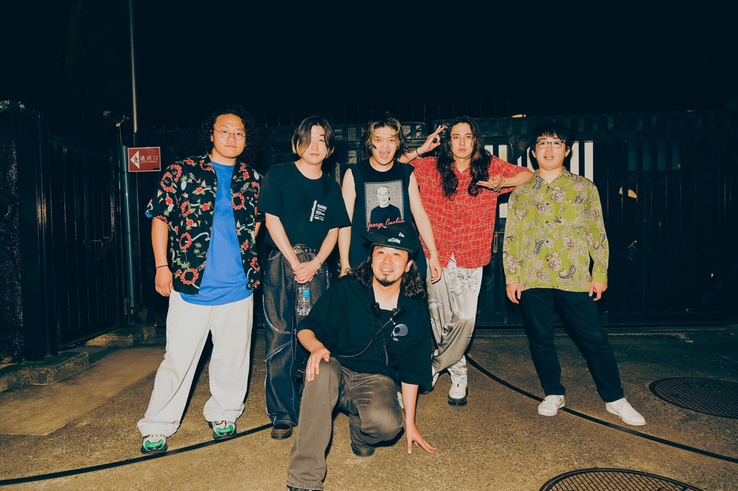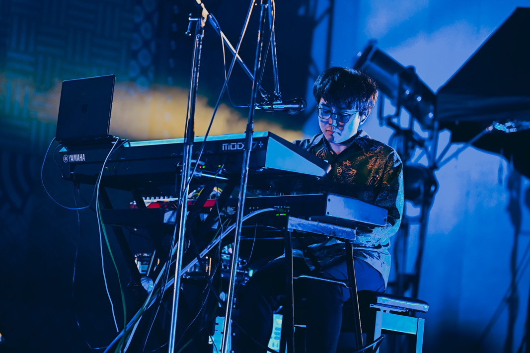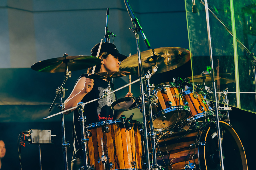 続いて、So Kanno(Dr)と高木のビートが響き渡るとフュージョン色が強めの「ナイトクルージング」で音の深海へ導いてゆく。MCでは高木が観客を労い、「俺ら大阪滞在4時間らしいっすよ。だから出し切らなきゃいけない」との言葉に、いけだがマイクを通さず「大阪ー!」と叫び、客席に火をつけて5月に配信リリースされたばかりの「yonaki」をメロウにプレイ。高木のウィスパーボイスが野音を吹き抜ける風に混ざり合う。「MUSICA」では美しいメロディと5人の超絶技巧が生み出すアンサンブルで多幸感に包まれる。