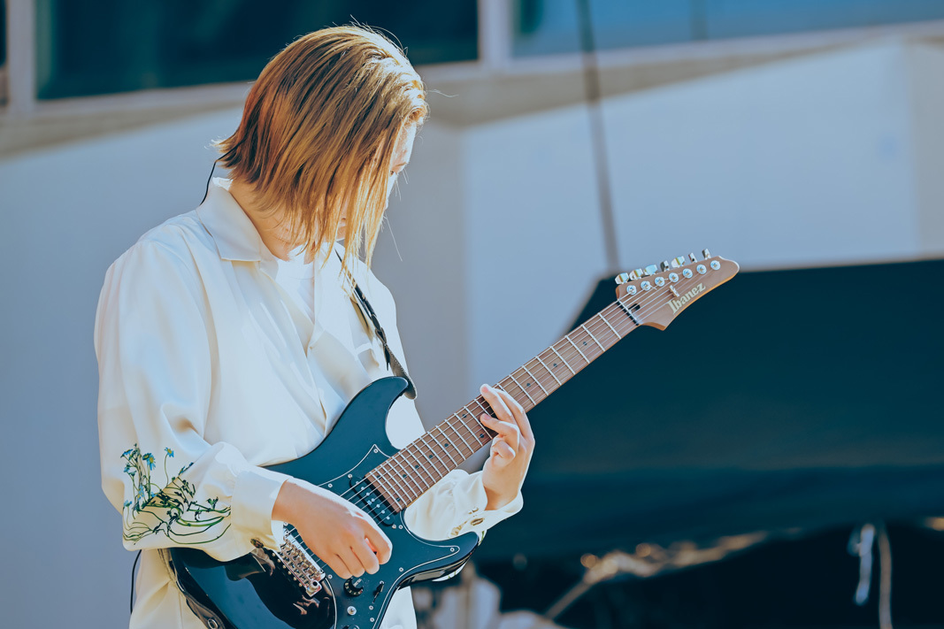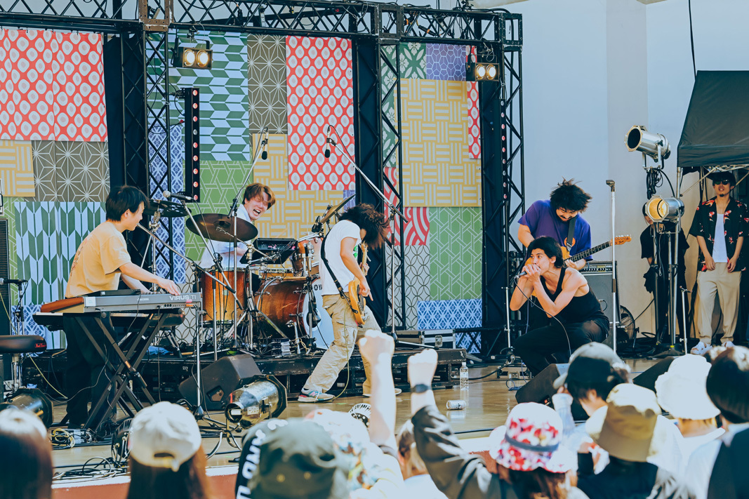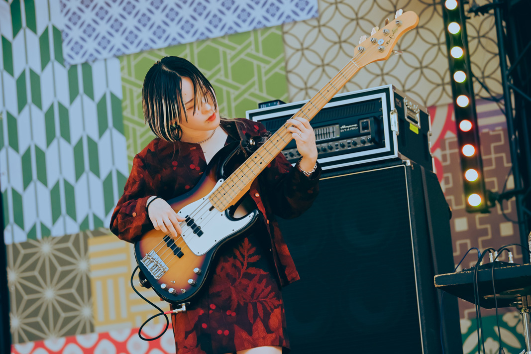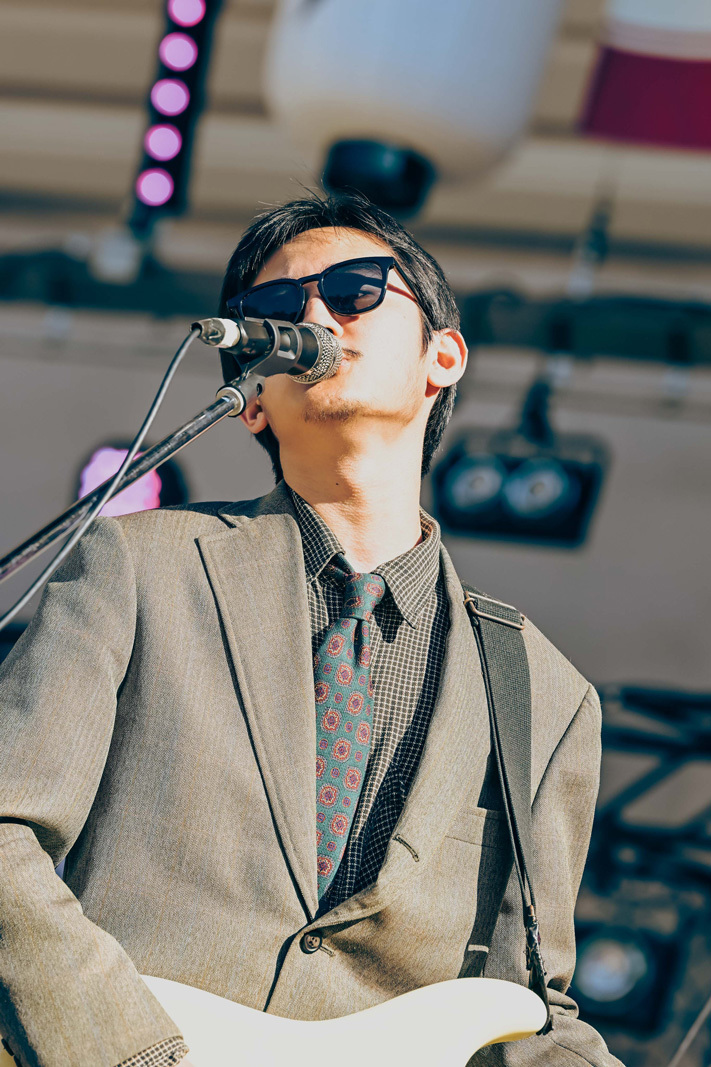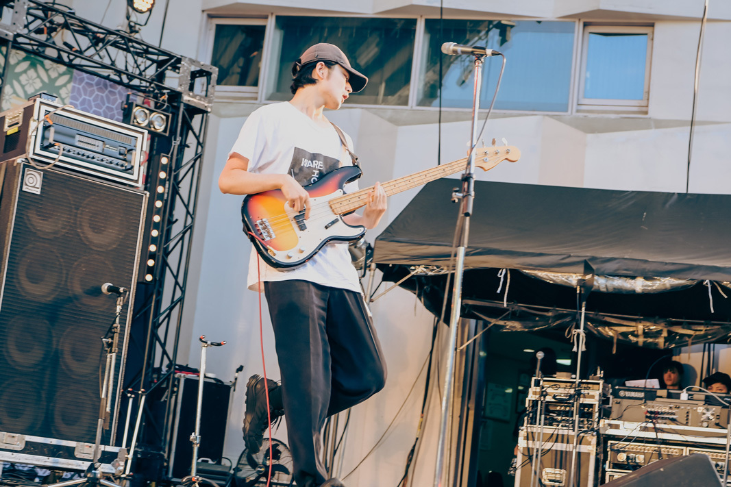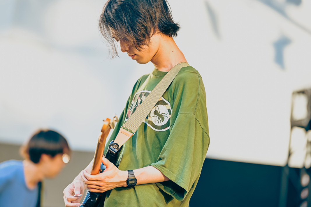 メンバー紹介を挟み、音を止めずに「母船」へ。心がざわざわする詞世界に浮遊感のあるサウンド。斜陽がステージを照らす様子もドラマチックだ。特に「異星人」、「羽」、ラストの「卵」の流れは本当にエモーショナル。柳瀬のがなり、叫ぶ、命を燃やすボーカル、静と動のコントラストが強い演奏、圧巻の表現力に飲み込まれる。生ぬるい夏の空気を震わせた轟音と緊張感は甘美だったと言えよう。ライブを終えたメンバーは、三々五々違う方向に掃けていった。間違いなく、会場にいた全員の記憶に残るライブ。いつまでも鳴り止まぬ拍手と歓声がそのことを証明していた。