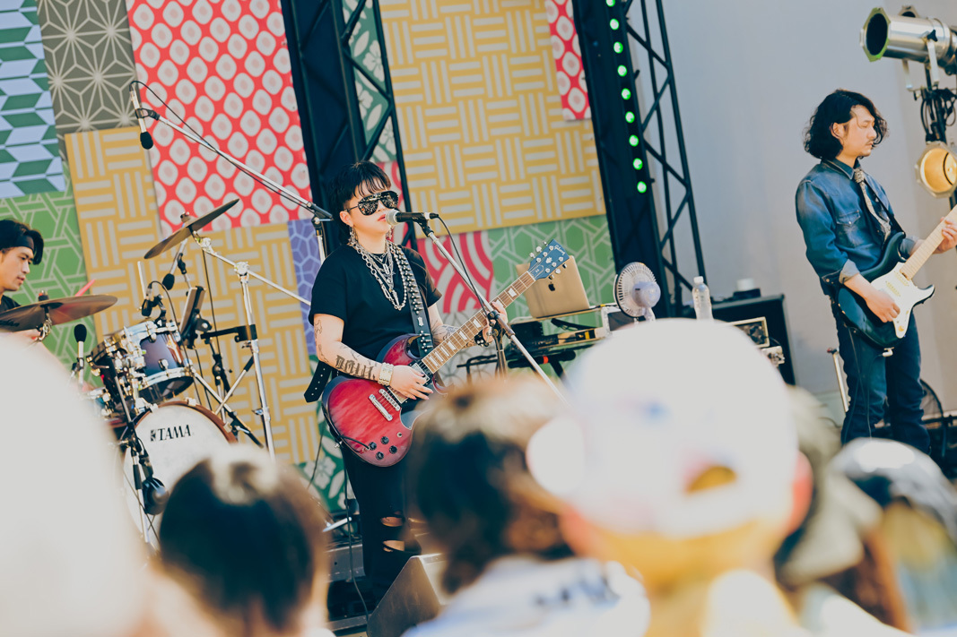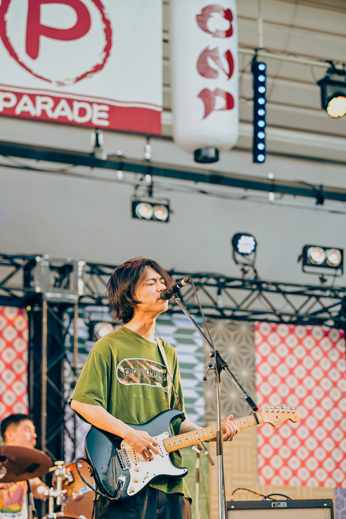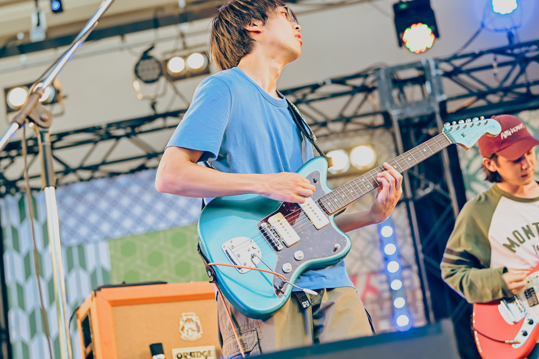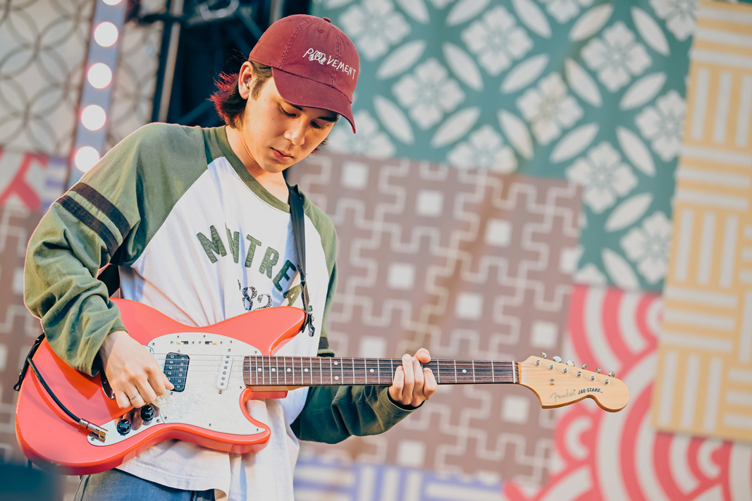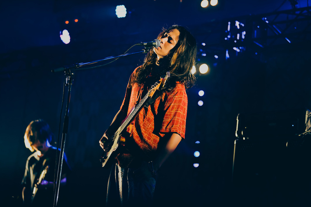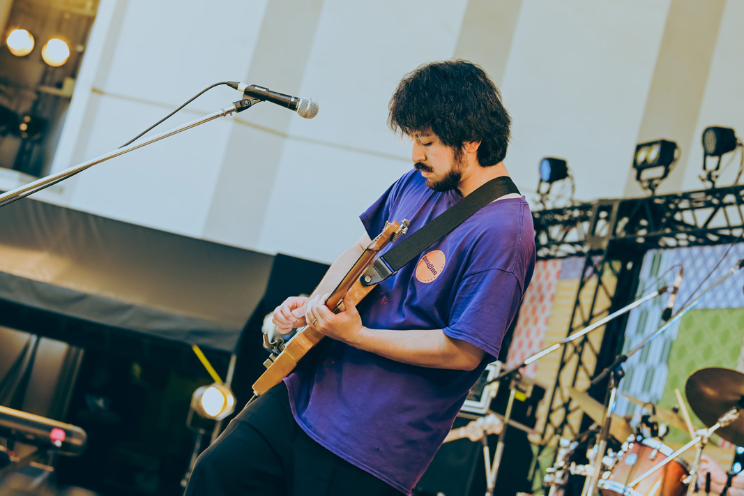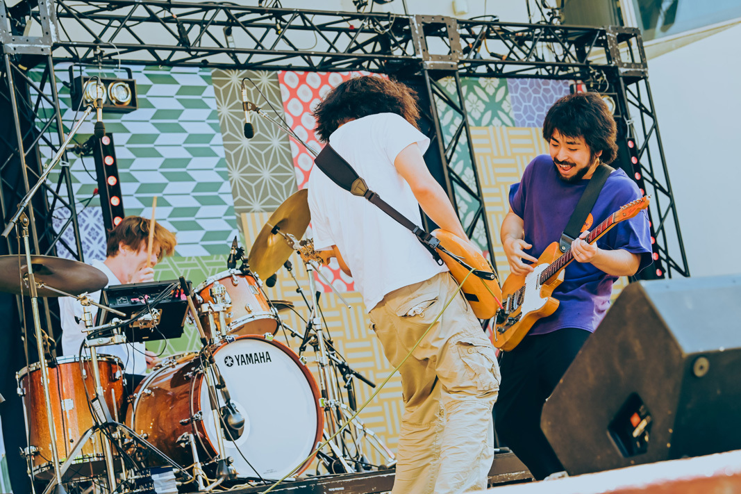ようやく過ごしやすくなった時間帯に登場したのはDYGL。サポートメンバーに鈴木健人(Dr/never young beach)を迎えた編成でロックサウンドを響かせた。秋山信樹(Vo.Gt)が「こんにちは、こんばんは。DYGLです」と挨拶し、「Take It A way」から軽快にライブスタート。続けて楽曲にいこうとしたところで、暑さからなのか、秋山が高校生の時から使っているギターに不調が見られたと演奏をやり直す。「後で(ギターを)たくさん褒めてあげます」と笑う秋山の優しさが素敵だ。「Let It Sway」をプレイして秋山は「音が出なくなる度に1個エフェクターを減らしていくという実験が始まりました。最後は丸裸になるかもしれませんが、頑張ります!」と笑顔。こんなトラブルも生ならでは。続く「Under My Skin」では、下中洋介(Gt)と嘉本康平(Gt)のディレイのきいたギターのユニゾンが気持ち良く、客席もゆらゆらと体を揺らす。