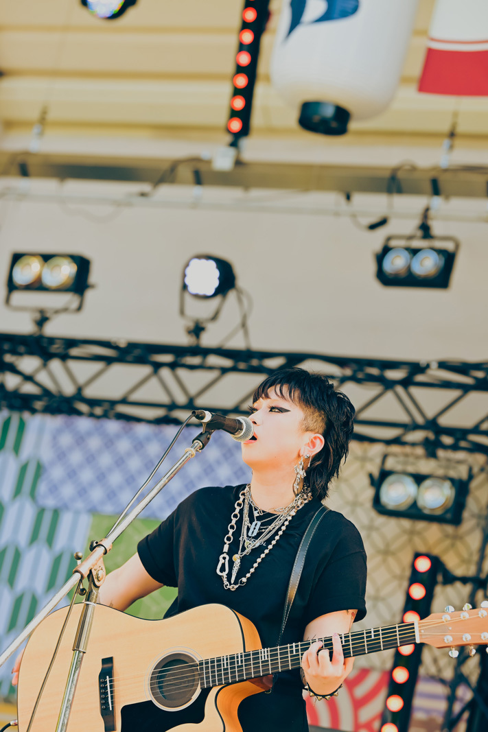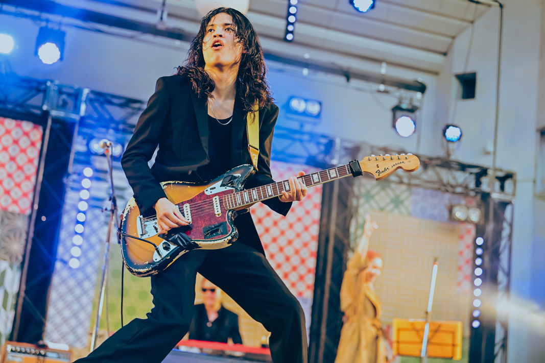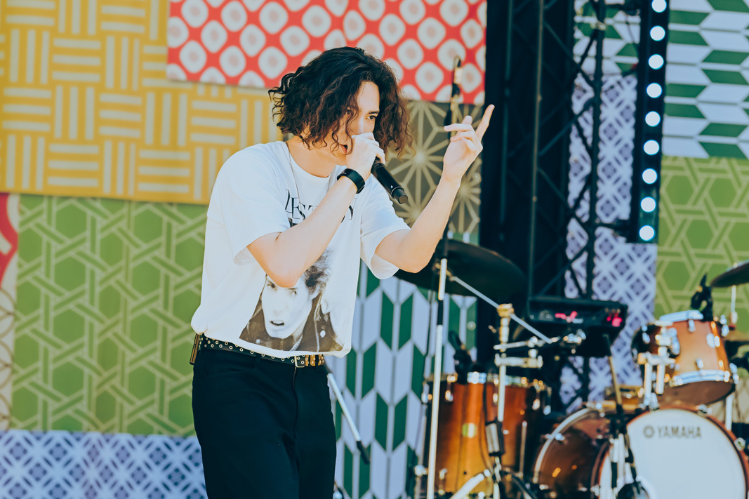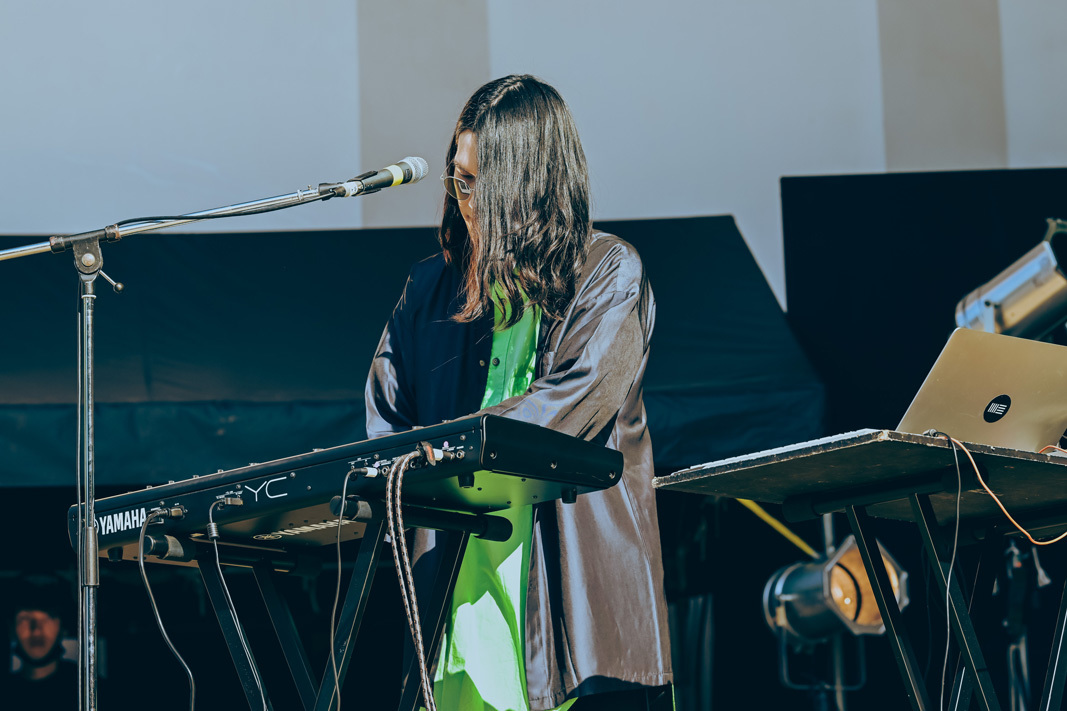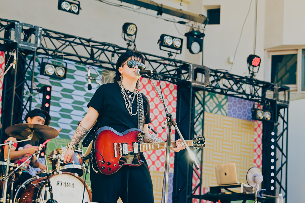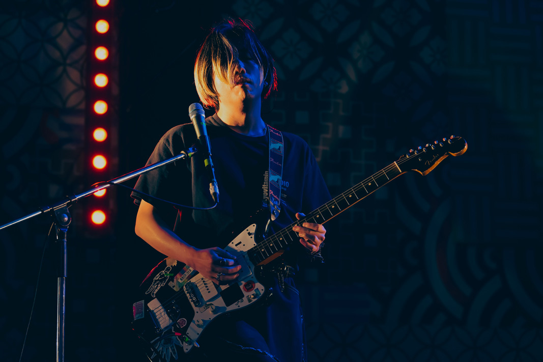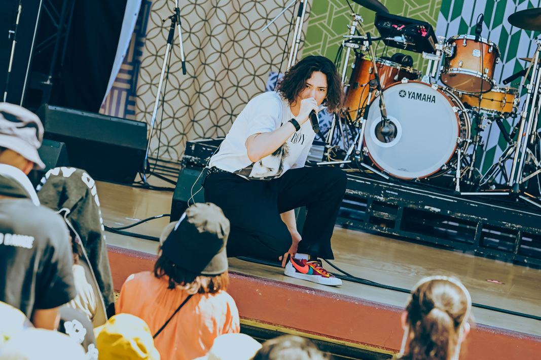 ようやく過ごしやすくなった時間帯に登場したのはDYGL。サポートメンバーに鈴木健人(Dr/never young beach)を迎えた編成でロックサウンドを響かせた。秋山信樹(Vo.Gt)が「こんにちは、こんばんは。DYGLです」と挨拶し、「Take It A way」から軽快にライブスタート。続けて楽曲にいこうとしたところで、暑さからなのか、秋山が高校生の時から使っているギターに不調が見られたと演奏をやり直す。「後で(ギターを)たくさん褒めてあげます」と笑う秋山の優しさが素敵だ。「Let It Sway」をプレイして秋山は「音が出なくなる度に1個エフェクターを減らしていくという実験が始まりました。最後は丸裸になるかもしれませんが、頑張ります!」と笑顔。こんなトラブルも生ならでは。続く「Under My Skin」では、下中洋介(Gt)と嘉本康平(Gt)のディレイのきいたギターのユニゾンが気持ち良く、客席もゆらゆらと体を揺らす。