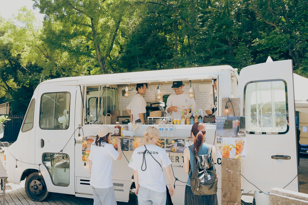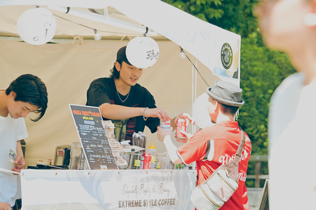 会場に入ると、早速右手にフードのお店が構えていた。人気のミュージックバー「virgo」はホットドッグを、東大阪市八戸ノ里にある和食と韓国料理の「和韓」はタコスや唐揚げを販売。また後方芝生エリアでは、大阪・天満のコーヒーショップ「STREAMER COFFEE COMPANY」がドリンクやドーナツを販売、「ANOTHER TABLE.LLC」のキッチンカーではハンバーガーなどが提供されていた。