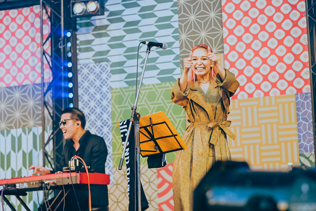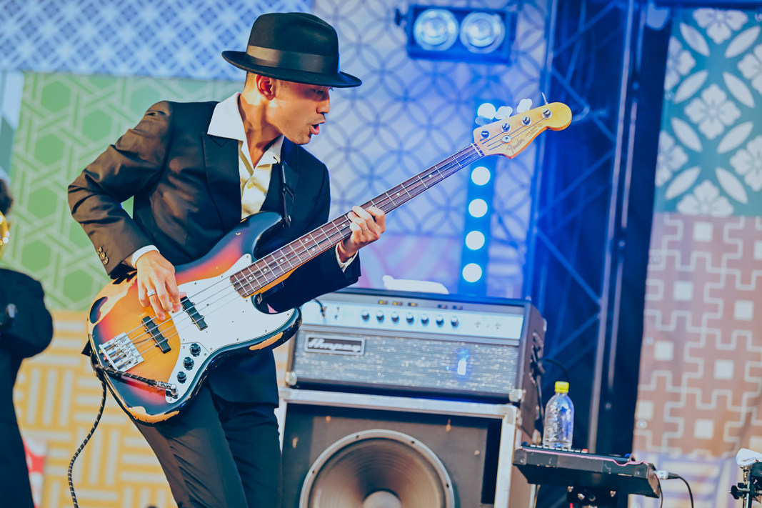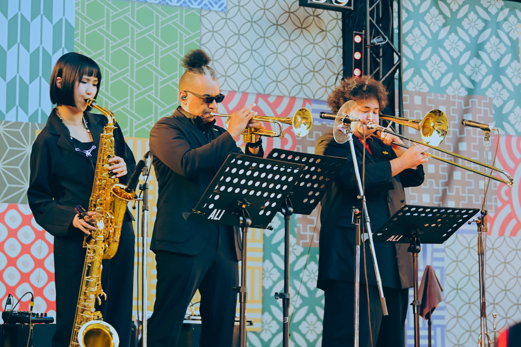 筆者が多国籍バンド・ALIと出会ったのはちょうど1年前の大阪城野音だった。当時あまりのカッコ良さに度肝を抜かれたことを思い出す。何が言いたいかというと、ALIの野外ライブは最高なのだ。この日の編成はCesar(Gt)、なみちえ(Rap.Cho)、LUTHFI(Ba)、ルイス・バジェ(Tp)、YOSHIO(Tro)、前田サラ(Sax)、JIN INOUE(Key)、BOBO(Dr)、そしてLEO(Vo)という9人の大所帯。いつものように「仁義なき戦い」のテーマが聞こえると客席の疲れもあっという間に吹き飛び、一斉に体を揺らす。