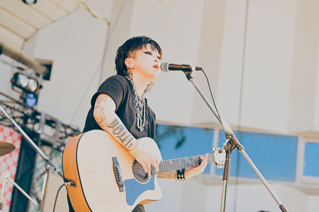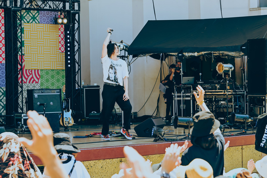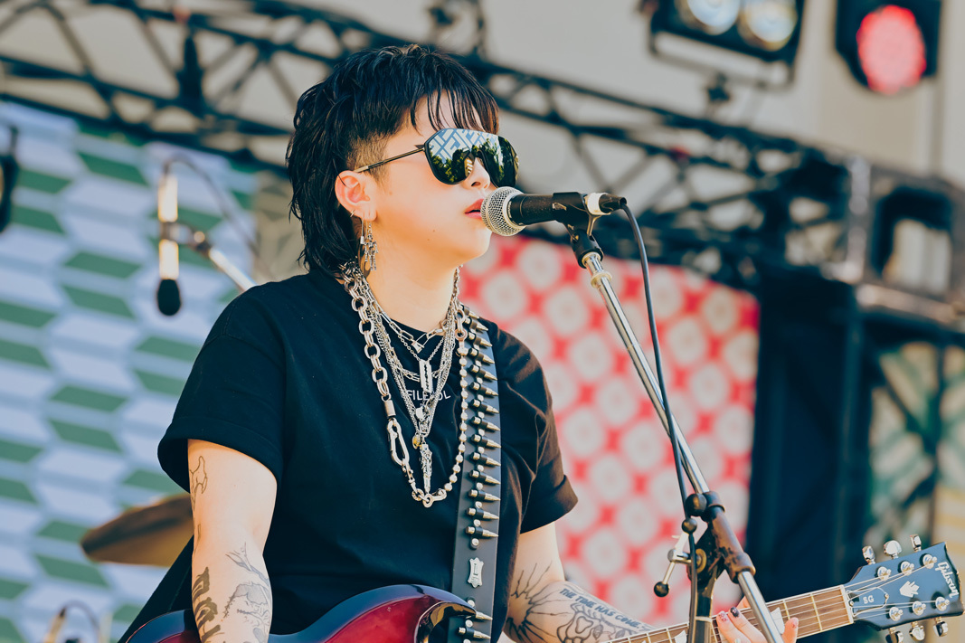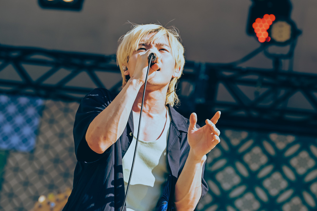 渋さと勢いはじわじわ加速。テンポアップした「ZION」ではコールアンドレスポンスもバッチリキメる。さらに「IGNITE」「Fire」と、否が応でも全身音の波にまみれるダンスナンバーの連投でアツアツの空気を作り上げ、「やべえ、まだボルテージが足んねえ」との言葉から前日に配信されたばかりの「Dancer in the Dark」を投下。ラストチューンの「$uper$onic」まで、一切緩まぬパワーで轟音を響かせた。エッジーなミクスチャーロックに迫力たっぷりの演奏力、破天荒なパフォーマンスでヒリヒリさせる一方で、客席に知人の顔を見つければ嬉しそうに「愛してるぜー!」と叫び、「人間ってこんなに愛おしいんだ。ヤバすぎ」「勇気を持って生きていきましょう!」と人間味あふれる言葉を投げかける。鋭児の魅力は実に底知れない。トップバッターから最高のステージングを見せてくれた。