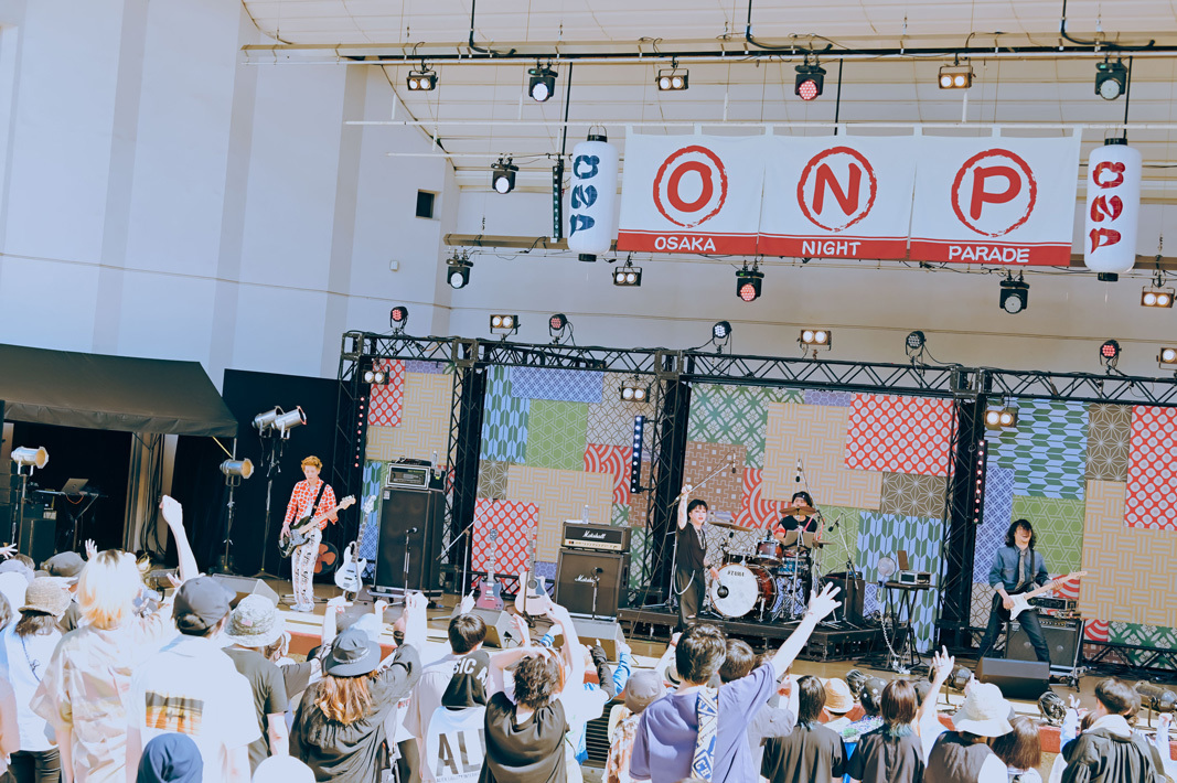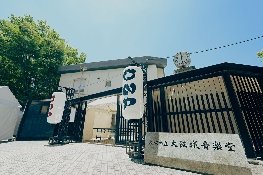 これ以上ないほどの快晴、気温は6月中旬にして30℃超え。夏先取りの天気の中、新緑薫る大阪城音楽堂には、カラフルなタオルやTシャツを身につけた観客が列をなした。会場の入り口には大きな「ONP提灯」が来場者を出迎える。