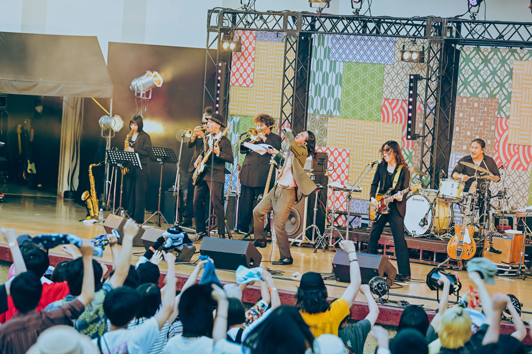 「心のぱんつを脱いでいこうぜ大阪」と高木の言葉からシームレスに音をつないで披露した「脱げぱんつ」では、ジョージ林(Sax)のソロ前、サトウカツシロ(Gt)が「皆、林さんに風を集めて!」とサウンドチェックからの伏線を回収。客席もメンバーも手でパタパタと林に風を送るというシュールな光景が広がる(笑)。いけだゆうた(Key)も立ち上がり、楽しそうにジャンプ! 林のソロがバッチリ決まるとブルージーで濃厚なセッションが繰り広げられ、豊潤なサウンドに全身が満たされる。