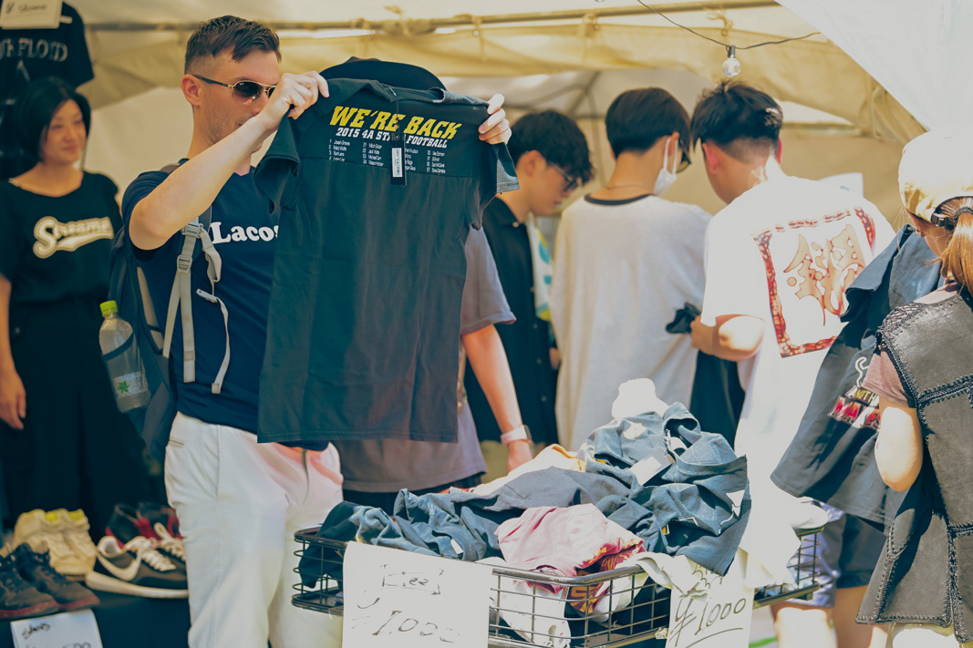 芝生エリアではアパレルの出店も。大阪・三国ヶ丘の古着屋「QUILL」、大阪・寺田町の古着屋「JUNGLE GYM」、『KOBE SONO SONO’23』にも出店・出演していた「四畳半帝国」、古着と雑貨ショップ「PEEPLE」がずらりと並ぶ。それぞれショップの特徴を活かし、ワゴンやラックを使用して帽子やTシャツといったアイテムが販売されていたのだが、その様子はさながら実店舗のような佇まい。