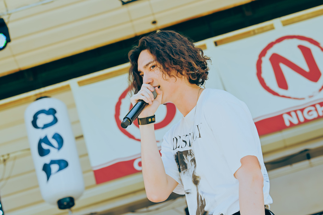 続いてMVを公開したばかりの新曲「火遊び」を投下。<俺が死んだらどうする>というパンチラインを、ゆっくりじっくり、力強く繰り出す。彼の体格もあるだろうが、ステージでの存在感は初見の人も釘付けにするほどのものだった。ピアノのイントロから真剣な表情で語りかけるように重厚なビートを全身で表現した「live for」を経て、ラストは「shame」。登場した時に感じた硬さはすっかり取れ、伸びやかな歌声で楽しそうに笑顔を浮かべてクラップを煽る。放つオーラも華やかに変化し、彼の実力と持ち味を存分に発揮したRQNYだった。