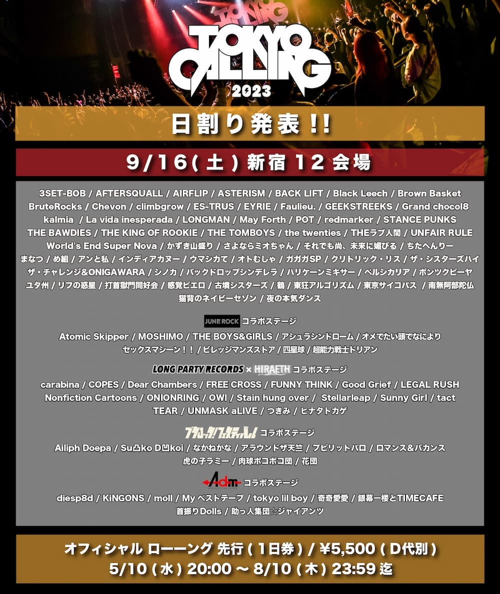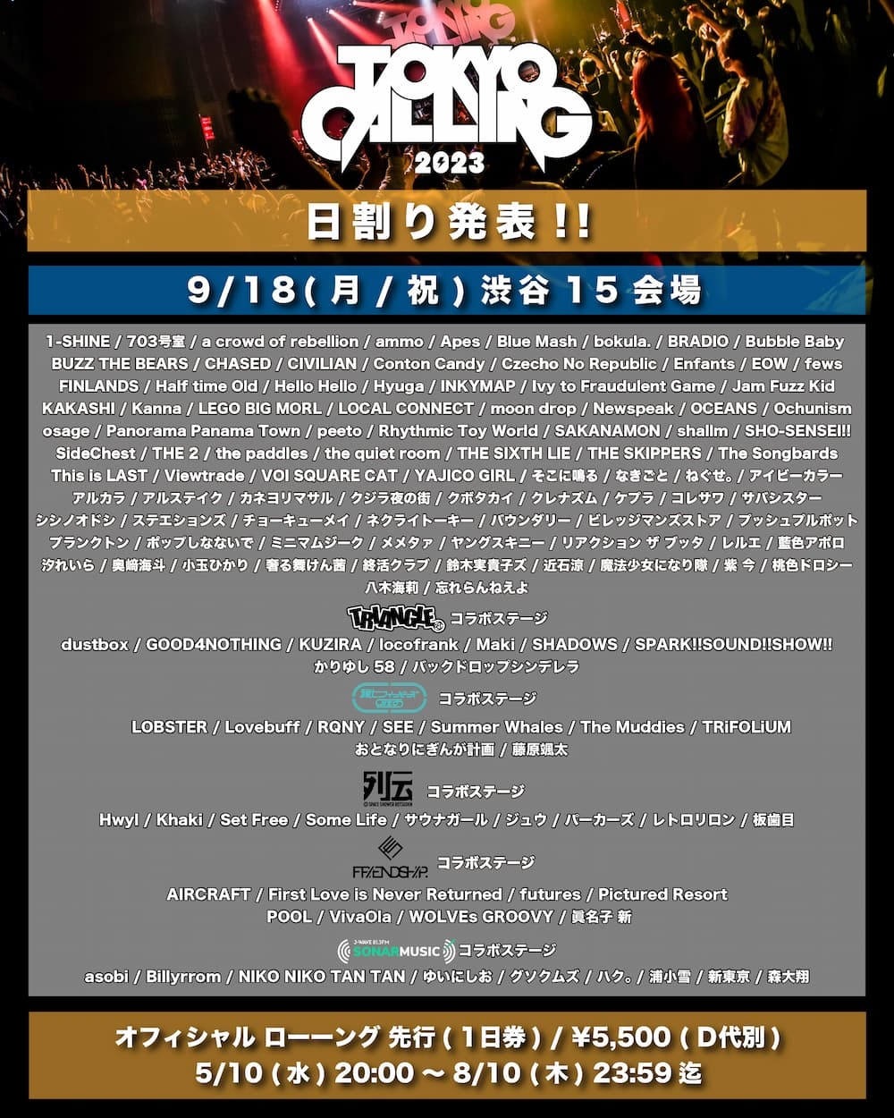 9月16日(土)から9月18日(月)にかけて新宿、下北沢、渋谷の全38会場で開催される日本最大級のサーキットフェス『TOKYO CALLING 2023』の最終出演アーティストが発表された。