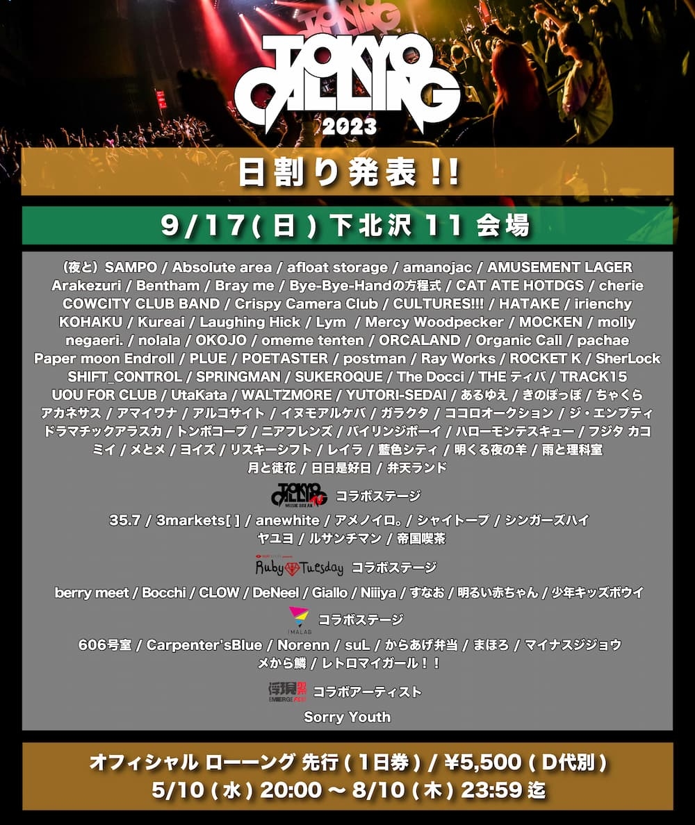 ammo、moon drop、THE BAWDIES、ココロオークション、ヤングスキニーら82組が加わり、総勢340組を超えるアーティストが出演するイベントとなる。また、新たなコラボステージとして16日(土)新宿には池袋Admコラボステージ、ブクロックフェスティバルコラボステージ、18日(月)渋谷にはSONAR MUSICコラボステージ、TRIANGLE コラボステージ、さらに17日(日)下北沢には浮現祭コラボアーティストとして台湾のオルタナティヴロックバンド・Sorry Youthが追加発表された。