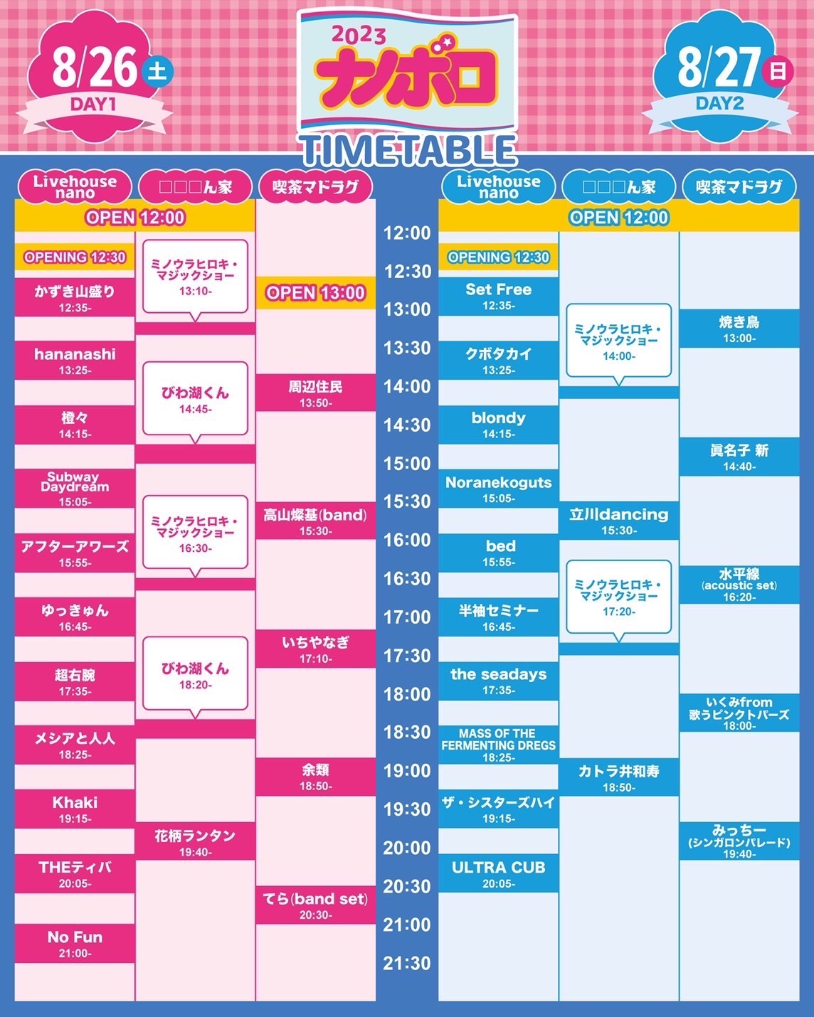8月26日(土)・27日(日)の2日間にわたってLivehouse nanoなど京都の3会場で開催される『ナノボロ2023』から、タイムテーブルが発表された。