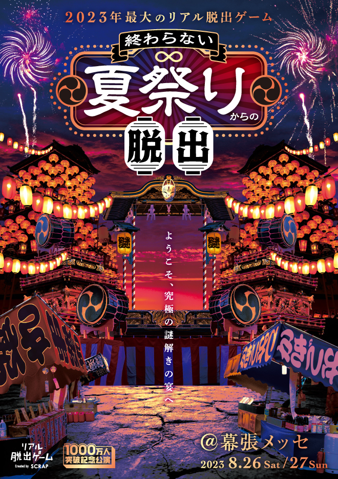 「リアル脱出ゲーム」を2007年に初開催して以降、累計の参加者数が1,000万人を突破したことを記念し、2023年最大のリアル脱出ゲーム『終わらない夏祭りからの脱出』が幕張メッセにて8月26日(土)、27日(日)の2日間限定で開催される。
