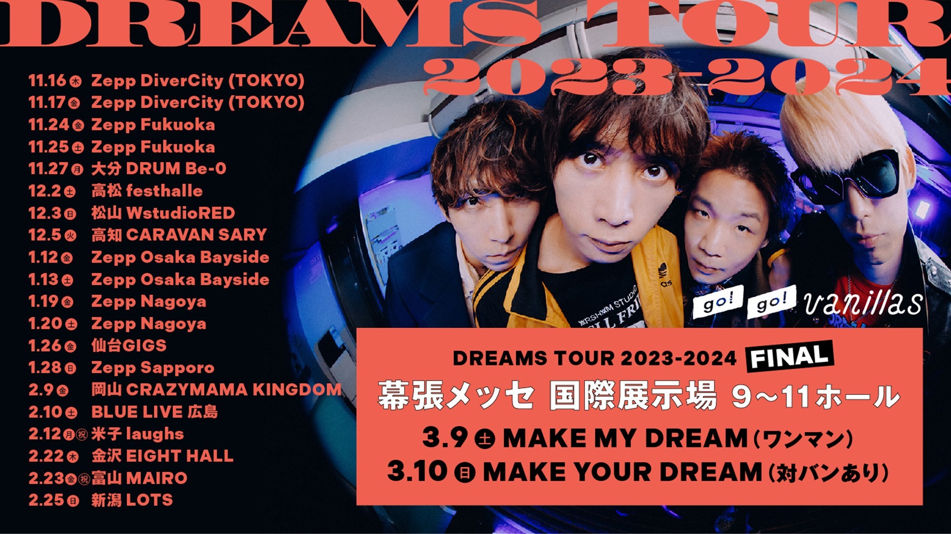 そして、現在発表されている11月からの全国ツアーが『DREAMS TOUR 2023-2024』にタイトル変更となり、ツアーファイナルとして新たに、幕張メッセ国際展示場9~11ホールでの2日間の公演が発表された。2023年3月9日(土) は『MAKE MY DREAM』 と題しワンマンライブを、3月10日(日) は『MAKE YOUR DREAM』と題し、対バンを招いて開催する。ファンクラブ「go!go!CLUB」では、チケット最速先行予約の受付もスタートした。