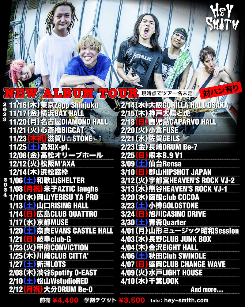 また、6thニューアルバムリリースにあわせた全国ツアーの開催も決定。11月16日(木)のZepp Shinjukuを皮切りに、2024年4月10日の千葉LOOKまで、全国45ヶ所での公演を予定している。チケットのオフィシャル先行受付は、本日8月6日(日)から8月13日(日)23時59分まで、イープラスにて実施中だ。