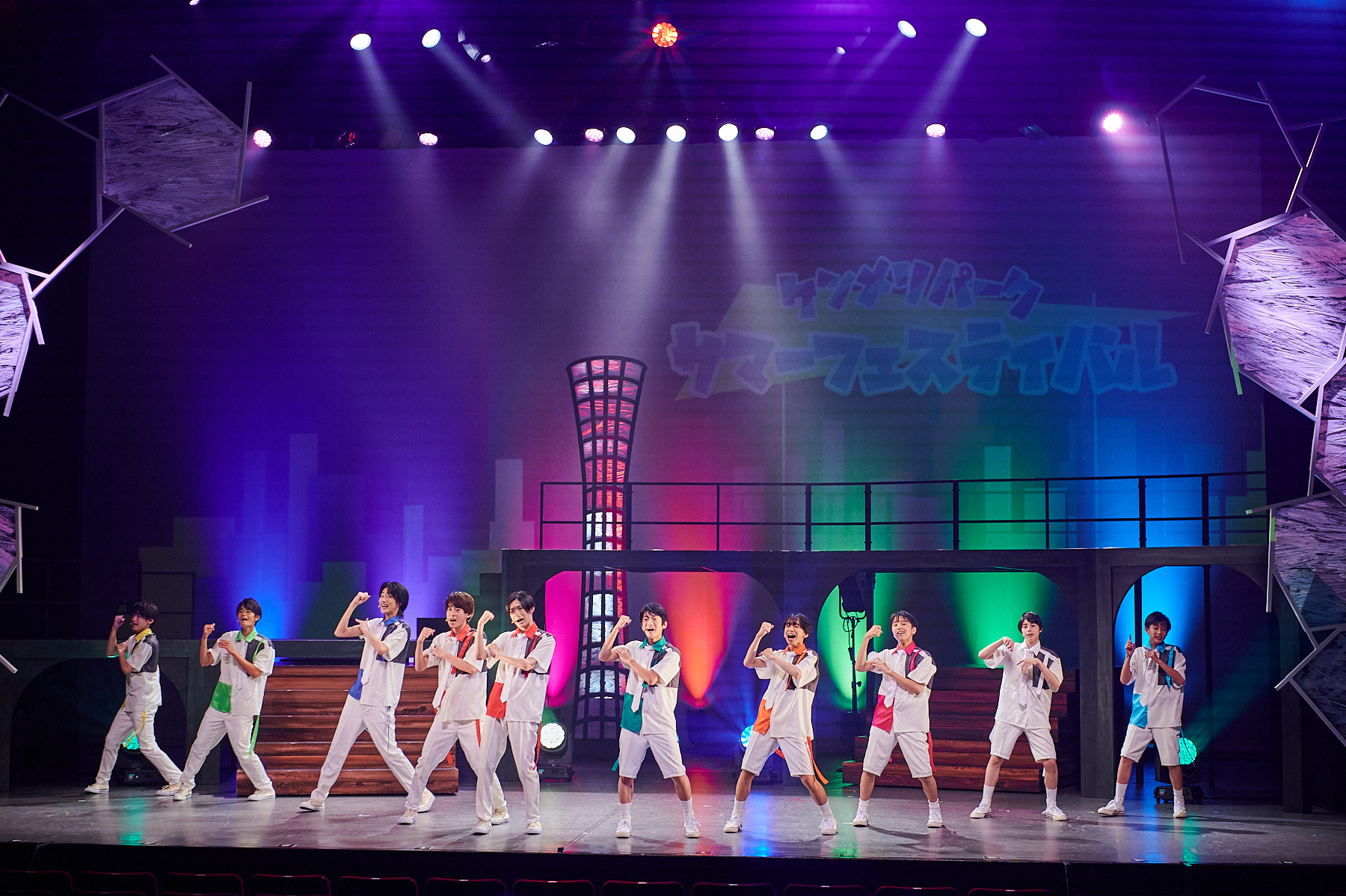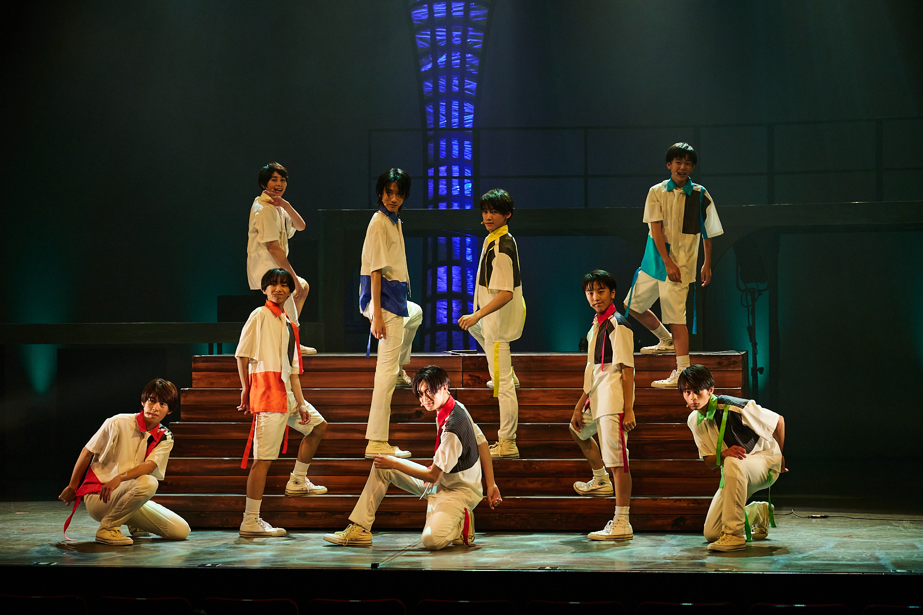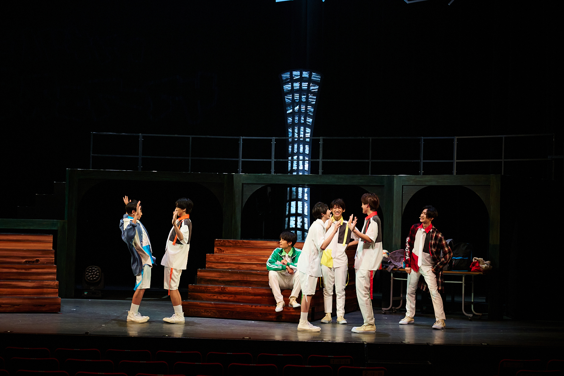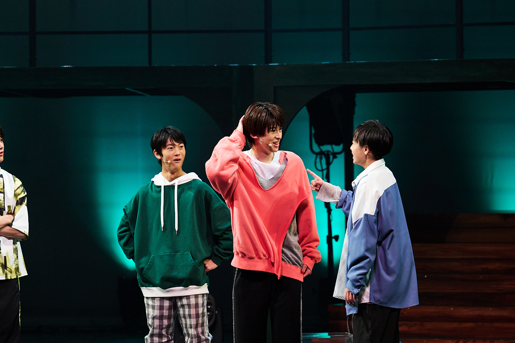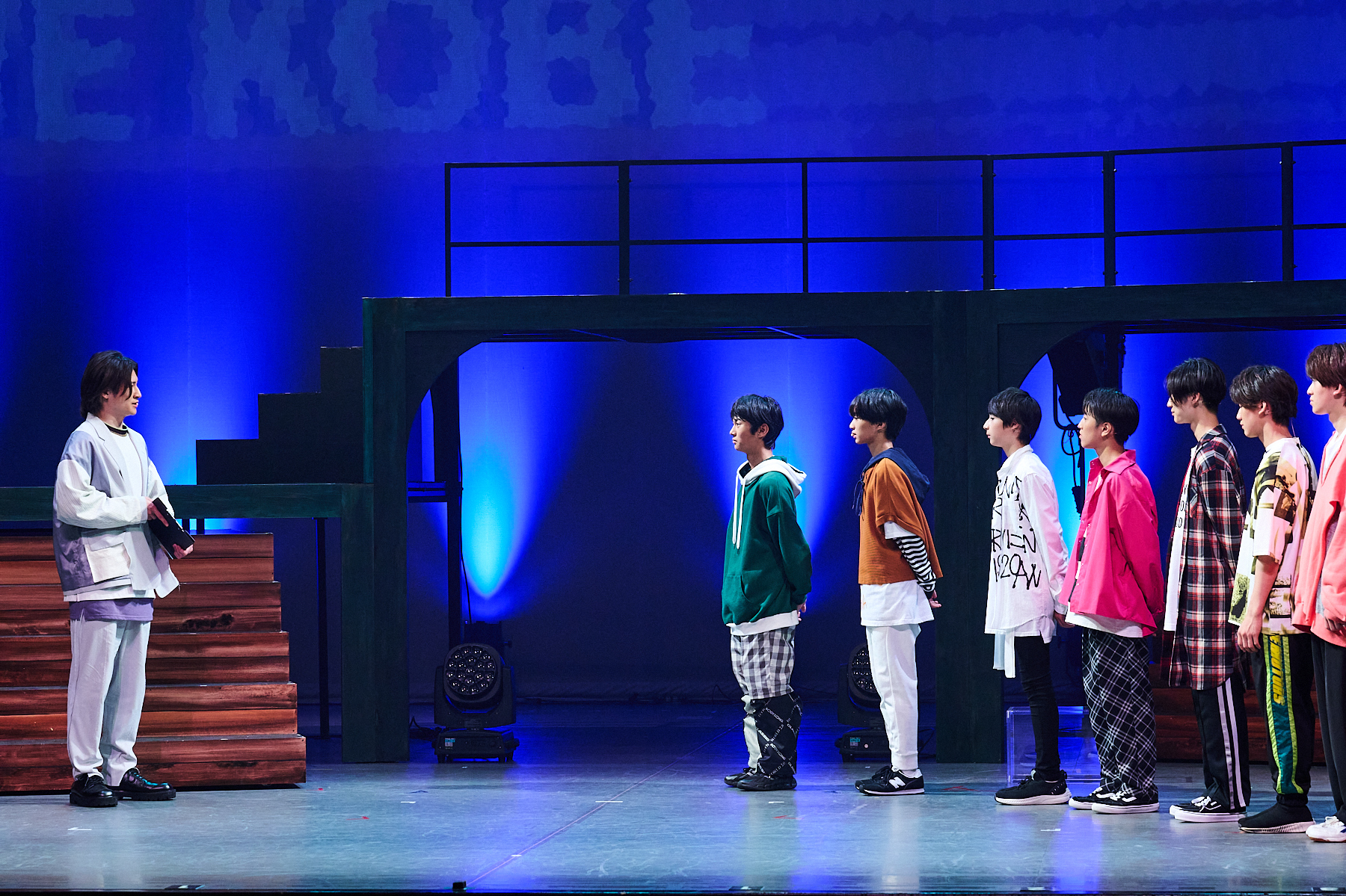 神戸の街並みを思わせる舞台に、波の音が涼しげに流れる。そして塚本晴人(塚木芭琉)、中城碧月(中川月碧)、明石田侑(明石侑成)、石川幸斗(石原月斗)、奥田頼(奥村頼斗)、崎フランツ(崎元リスト)、摂津士郎(津山晄士朗)、中田颯真(田中幸真)、細貝奏(細見奏仁)、大橋虎ノ介(髙橋龍ノ介)が、それぞれのメンバーカラーを反映したカラフルな衣装で登場した。