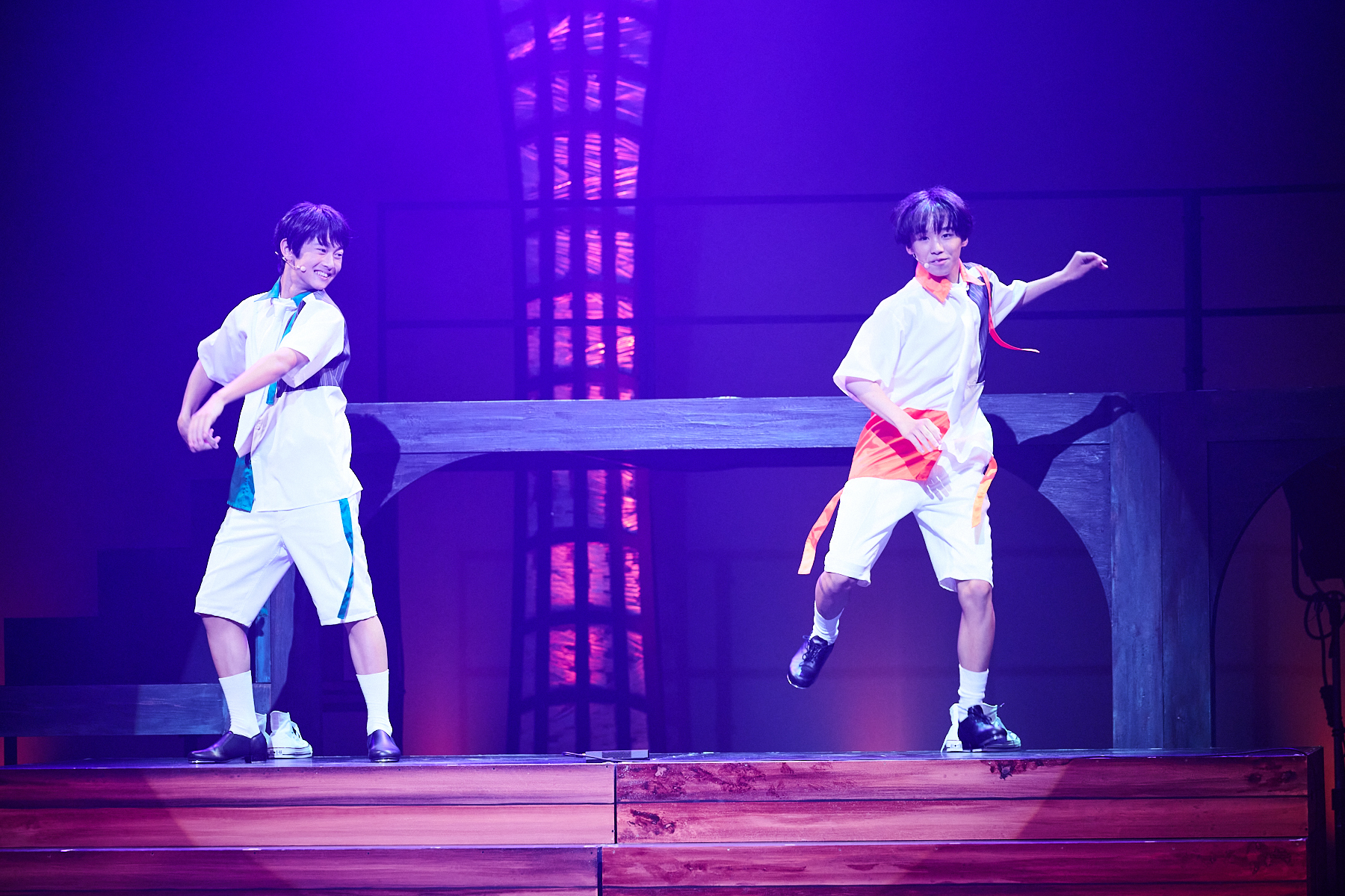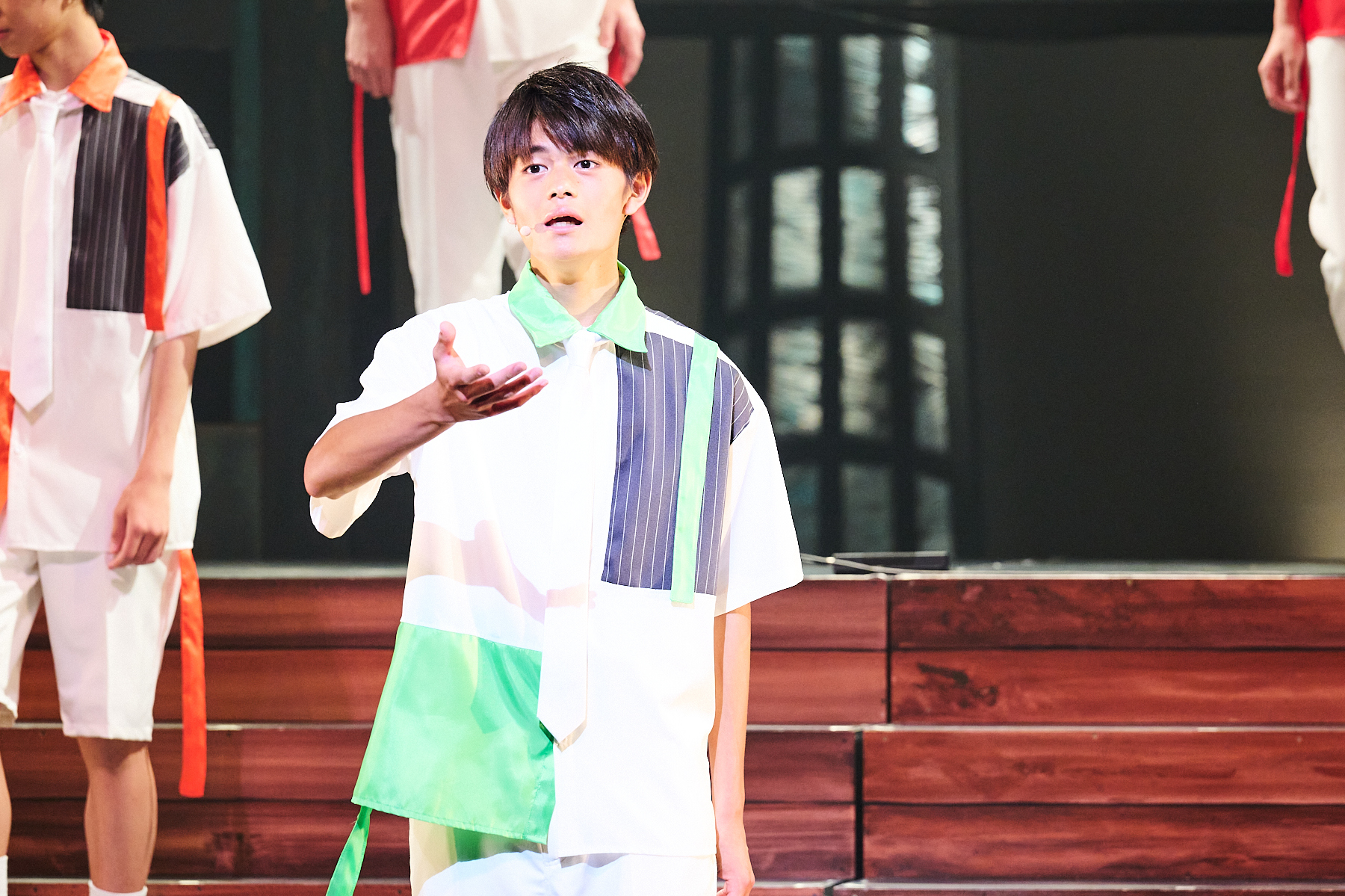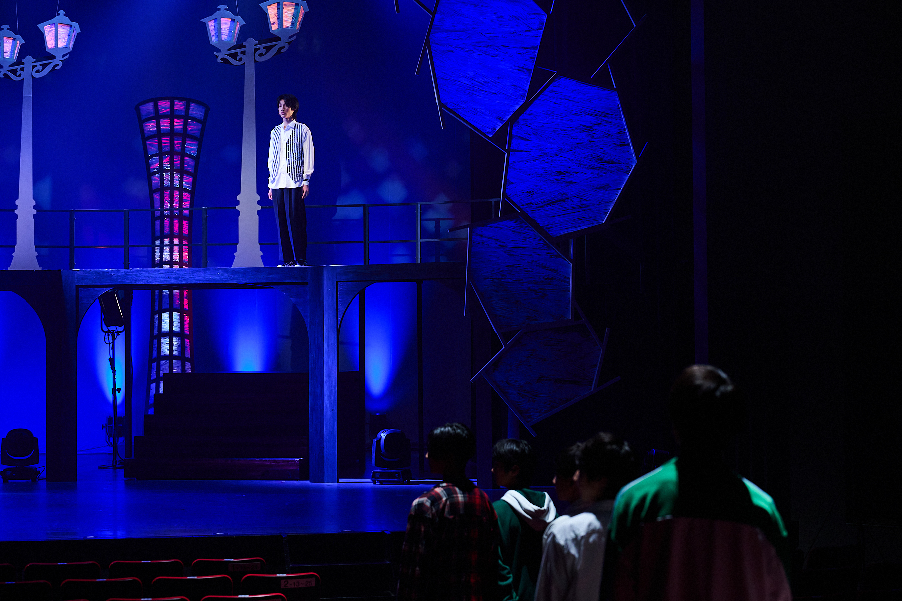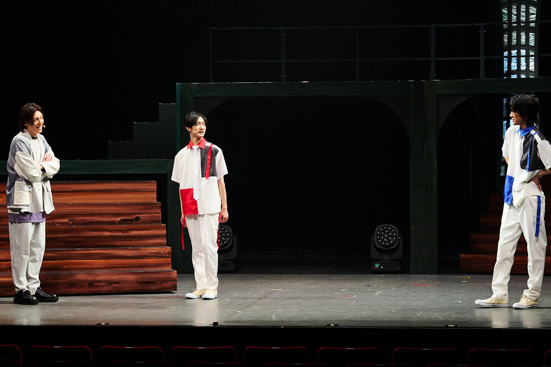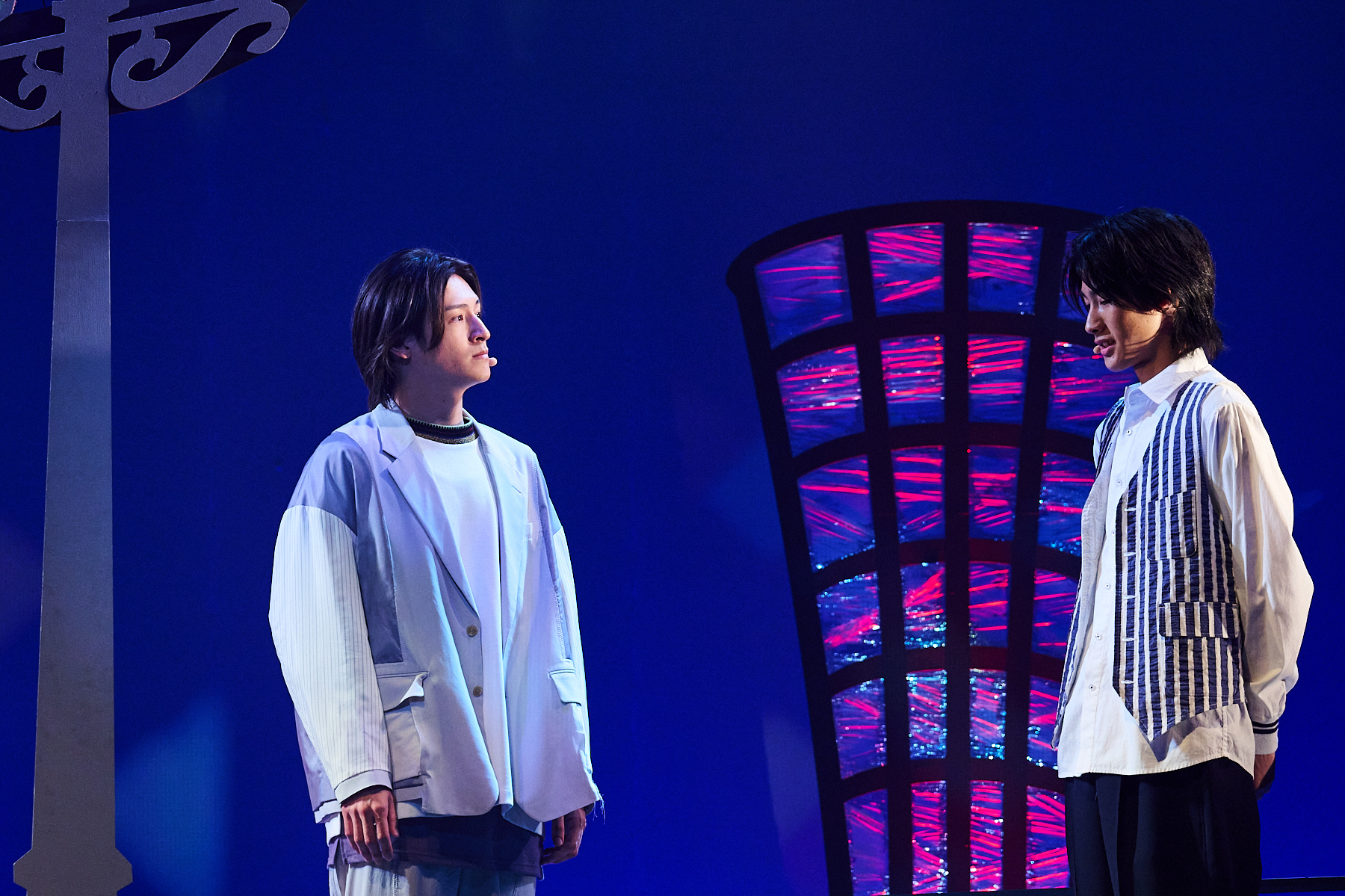 神戸の街並みを思わせる舞台に、波の音が涼しげに流れる。そして塚本晴人(塚木芭琉)、中城碧月(中川月碧)、明石田侑(明石侑成)、石川幸斗(石原月斗)、奥田頼(奥村頼斗)、崎フランツ(崎元リスト)、摂津士郎(津山晄士朗)、中田颯真(田中幸真)、細貝奏(細見奏仁)、大橋虎ノ介(髙橋龍ノ介)が、それぞれのメンバーカラーを反映したカラフルな衣装で登場した。