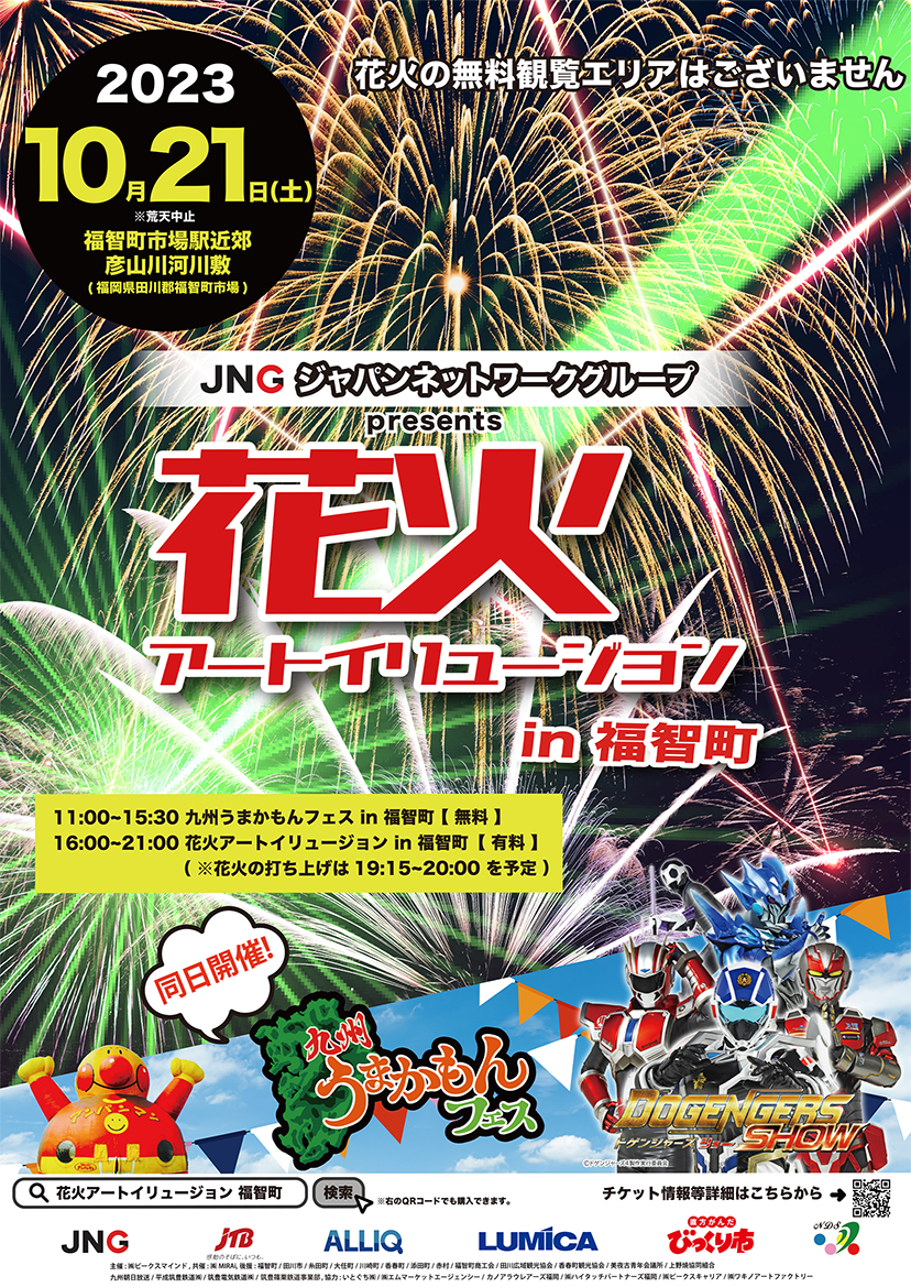 10月21日(土)に福岡県田川郡福智町にて、音楽とレーザーをシンクロさせた花火大会『JNGジャパンネットワークグループpresents 花火アートイリュージョンin福智町』と『九州グルメフェスin福智町』が開催される。