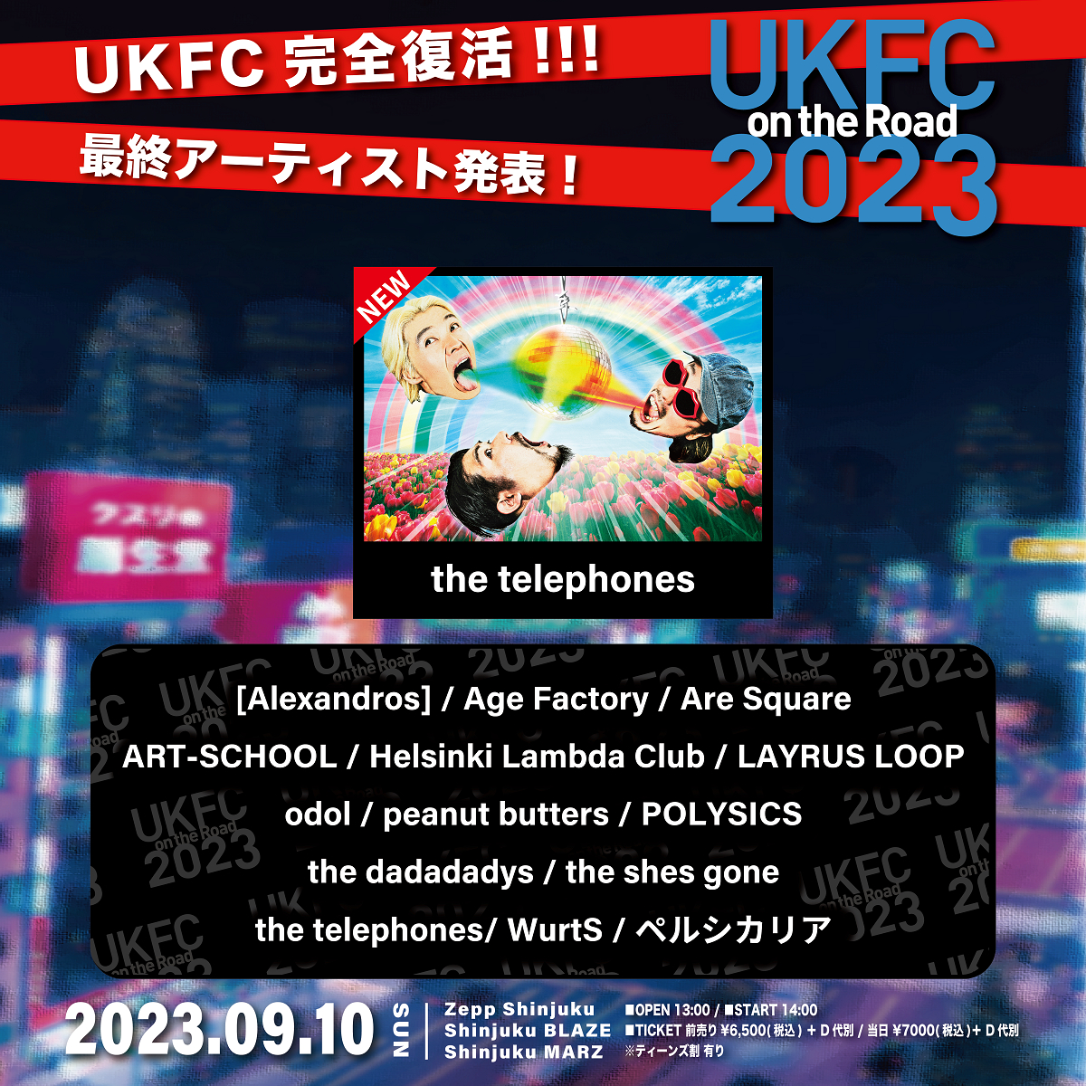 9月10日(日)にZepp Shinjuku (TOKYO) / 新宿BLAZE / 新宿MARZにて開催される、UK.PROJECTのレーベル部門とプロダクション部門による夏の恒例イベント『UKFC on the Road』の最終アーティストで、the telephonesの出演が発表された。併せてタイムテーブルも発表となった。