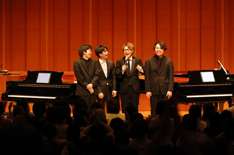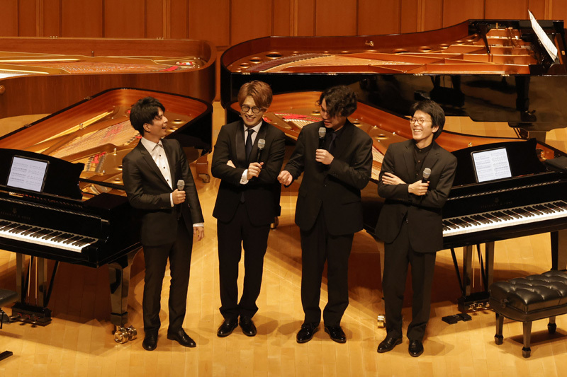 2023年7月30日(日)、『石井琢磨×髙木竜馬×藤川有樹×宮田森 4台ピアノコンサート』が、東京の浜離宮朝日ホールで昼夜二回にわたって開催された。ピアニストの石井琢磨の声がけで始まったこの “4台ピアノ企画”。一昨年5月オーストリアのヴェルスにあるピアノサロンからYouTube上で初配信されてから約二年。近夏、日本のステージ上で、しかも浜離宮朝日ホールで同企画が実現したことに当の出演者4人が感無量の思いにむせんでいたという前代未聞のコンサートとなった。昼夜ともに満場の客席は初回の配信を視聴した熱心なファンも多く集っていたようで、4人の思いに同調するかのように涙ながらに喜ぶ人々の姿も目にした。夜公演の模様をお伝えしよう。