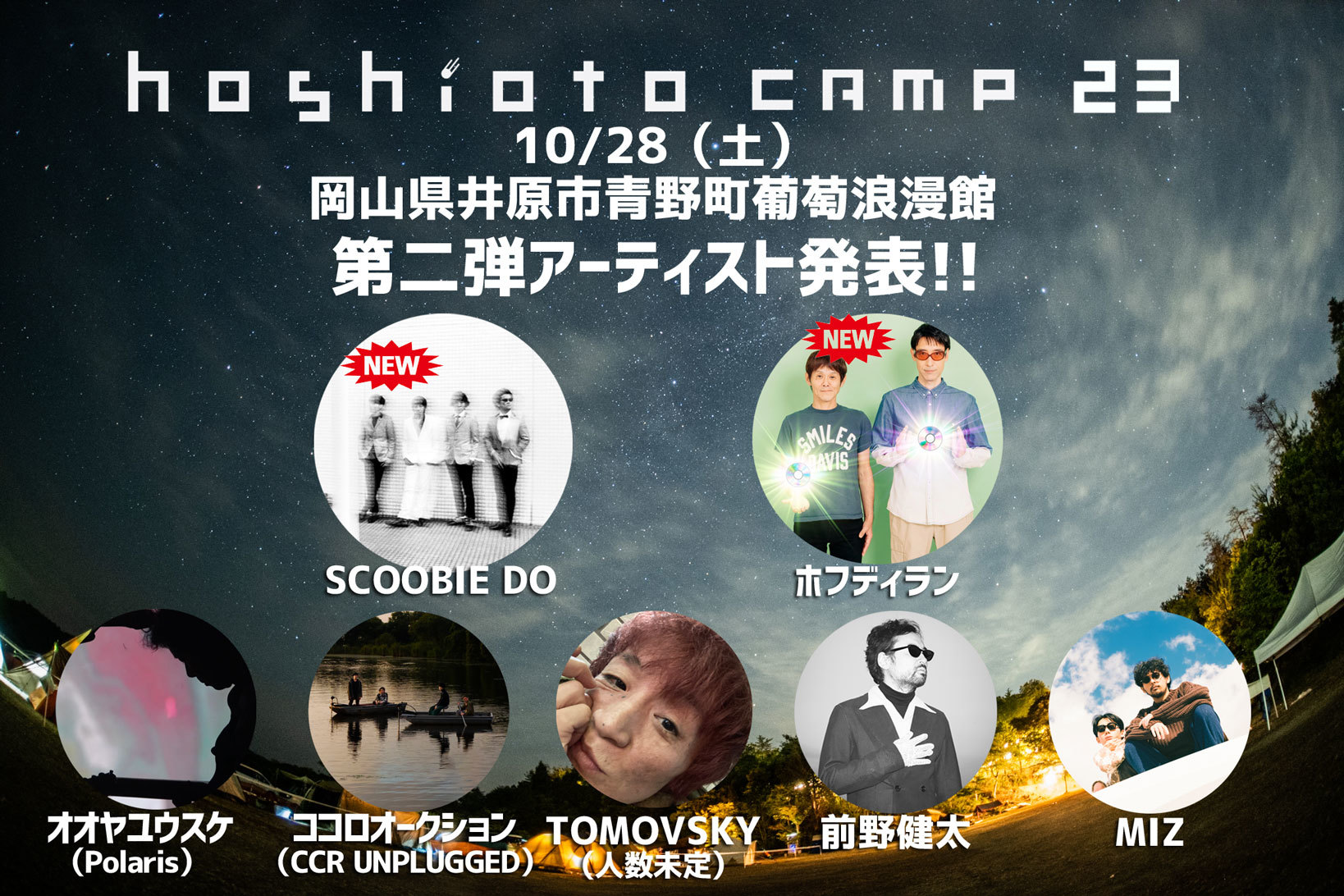 10月28日(土)に岡山県井原市青野町・葡萄浪漫館で開催される『hoshioto Camp 23』から、第二弾出演アーティストが発表された。