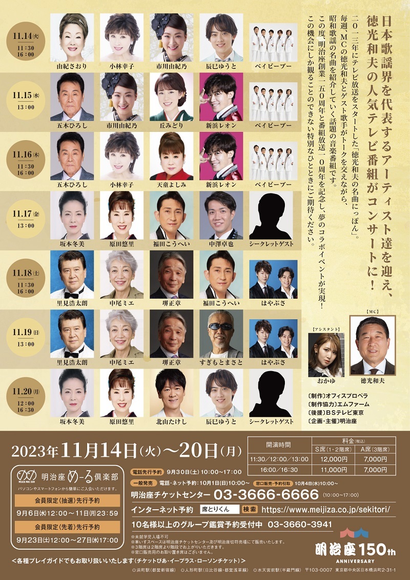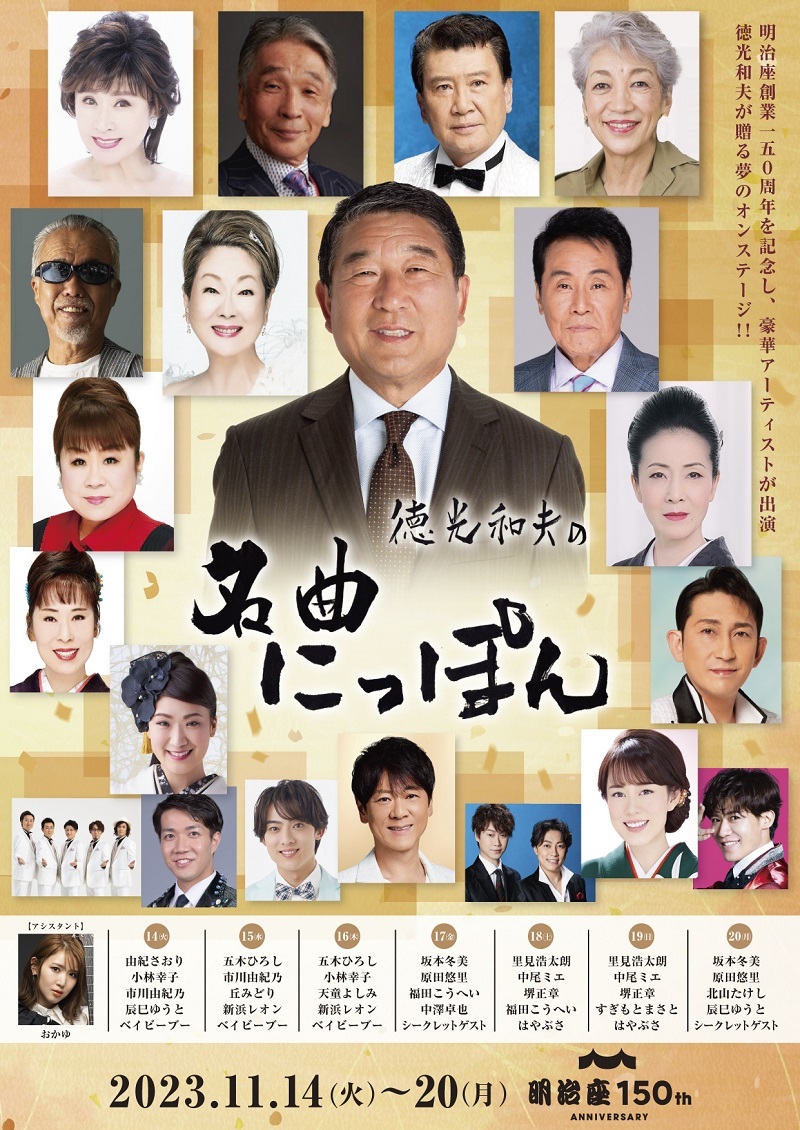 明治座創業 150 周年おめでとうございます。創業 150 周年の記念公演に私が司会を務める BS テレビ東京「名曲にっぽん」の劇場公演を企画していただき、ありがとうございます。誠に光栄です。「名曲にっぽん」は、昭和、平成、令和に歌い継がれる演歌・歌謡曲など日本の名曲をベテランから若手まで、多くの歌手がさまざまな企画とともに歌い、笑い、楽しんでもらう歌番組です。番組を放送しながら、いつも視聴者の皆さんが楽しんで観てくれているかを気にしながら、番組作りをしておりました。それだけに、直にお客さんの反応を見ることができる劇場公演は、私も楽しみで仕方ありません。今回の公演のために、いつも番組に出演してくれている人気歌手の皆さんはもちろん、普段は、なかなか出演してもらえない、大物歌手の皆さんも出演してくれます。数多くの名曲をとびきりのコラボレーションで、また私の大好きなムード歌謡をたっぷりと、お送りします。