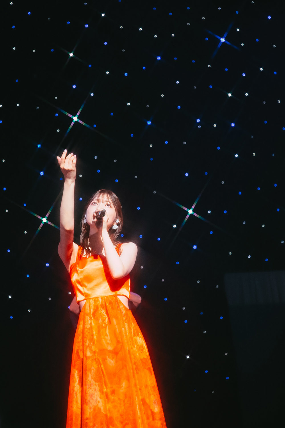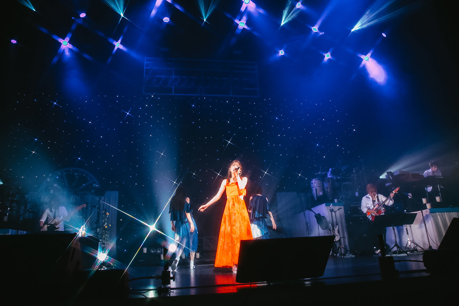 後半戦は一転し、オレンジ色のロングスカートをまとい、凛とした風格を漂わせながら、まずは笑顔が芽吹いていくような歌詞が印象的な『Remember Heart, Remember love』から。序盤をピアノのみでしっとりと聞かせ、2番からはバンドとともに感情豊かに歌い上げていく。続く『曖昧蜃気楼』でも、ウィスパーのような歌声からカタルシスをもたらす力強さまで、1曲のなかでさまざまな声の表情を展開し、ファンを楽しませた。また、家族への感謝の想いを綴った『To My Dear』では言葉の一つひとつを大切に届けていくように丁寧に歌唱。この3曲では、歌詞に込められた“感情”を真っ直ぐに伝えていくことを意識しているようにも感じられた。