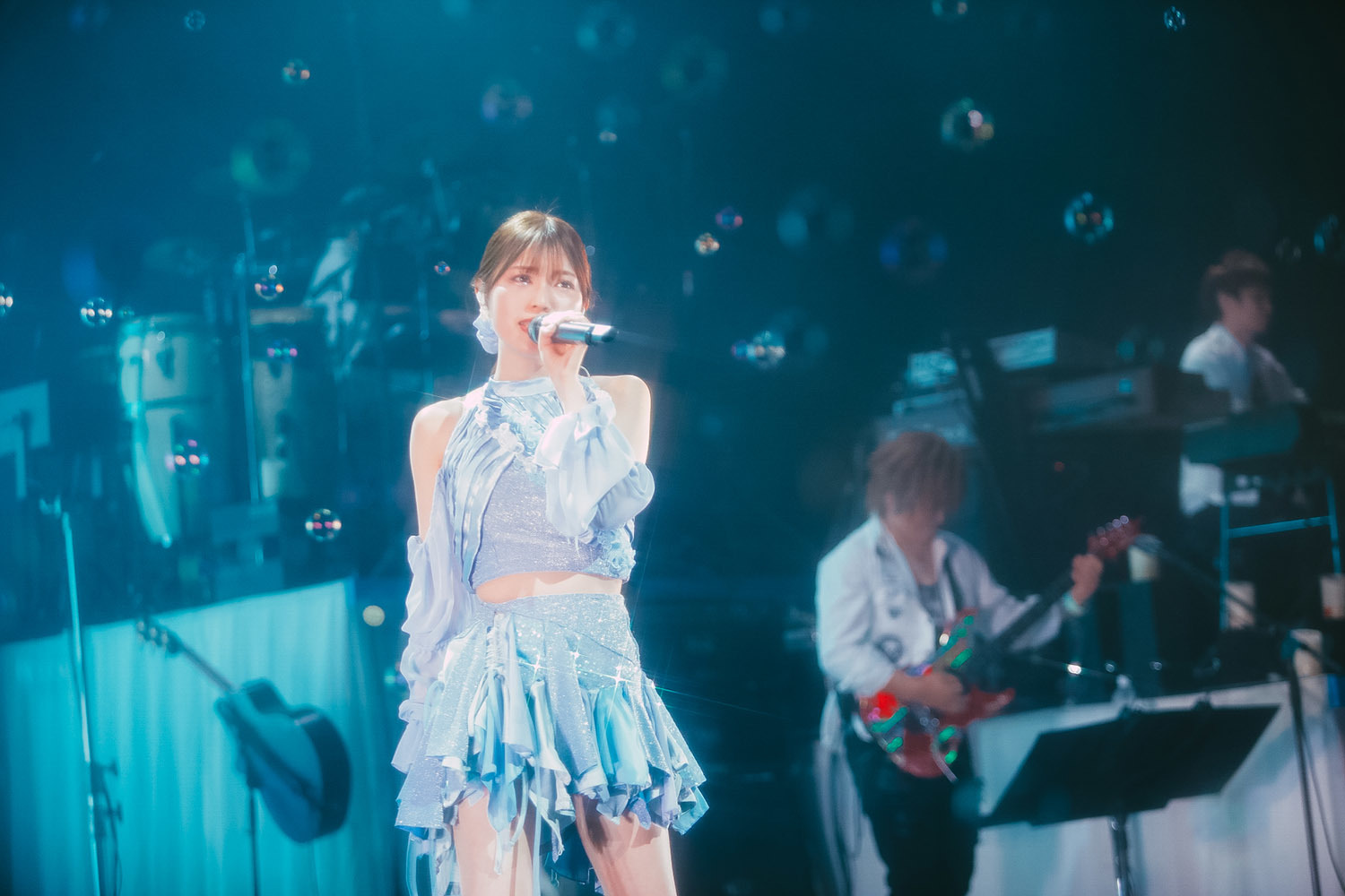 そんな熱気に彼女も圧倒されたのか、最初のMCでは「懐かし〜!みんな、いい声してますね!!」と笑顔を向ける。また、30歳のバースデーと5周年のアニバーサリーを祝うファンからの声援を受け、「私のことなのにこんなに皆さんが喜んでくれて、心がほっこりします」と感謝の思いも伝えた。その後は、「生バンドになったことで、より素敵になった曲たちが続々と待っていますよ!」とファンの期待を煽ると、リリースしたばかりの新曲『Paraglider』を初披露。オリジナル音源でも高揚感のある楽曲だが、バンドアレンジになり、さらに力強さと壮大さが増していく。また、ステージ上にシャボン玉が飛び交う幻想的な雰囲気のなか、『半透明の世界で』で透き通るようなハイトーンボイスを聞かせると、『夜とワンダーランド』ではエレクトロなシンセサウンドを融合させた少し大人な世界も表現。オープニングブロックで届けたダンサブルな3曲とは異なり、このターンではボーカリスト・石原夏織としてのポテンシャルの高さを見せつけた。