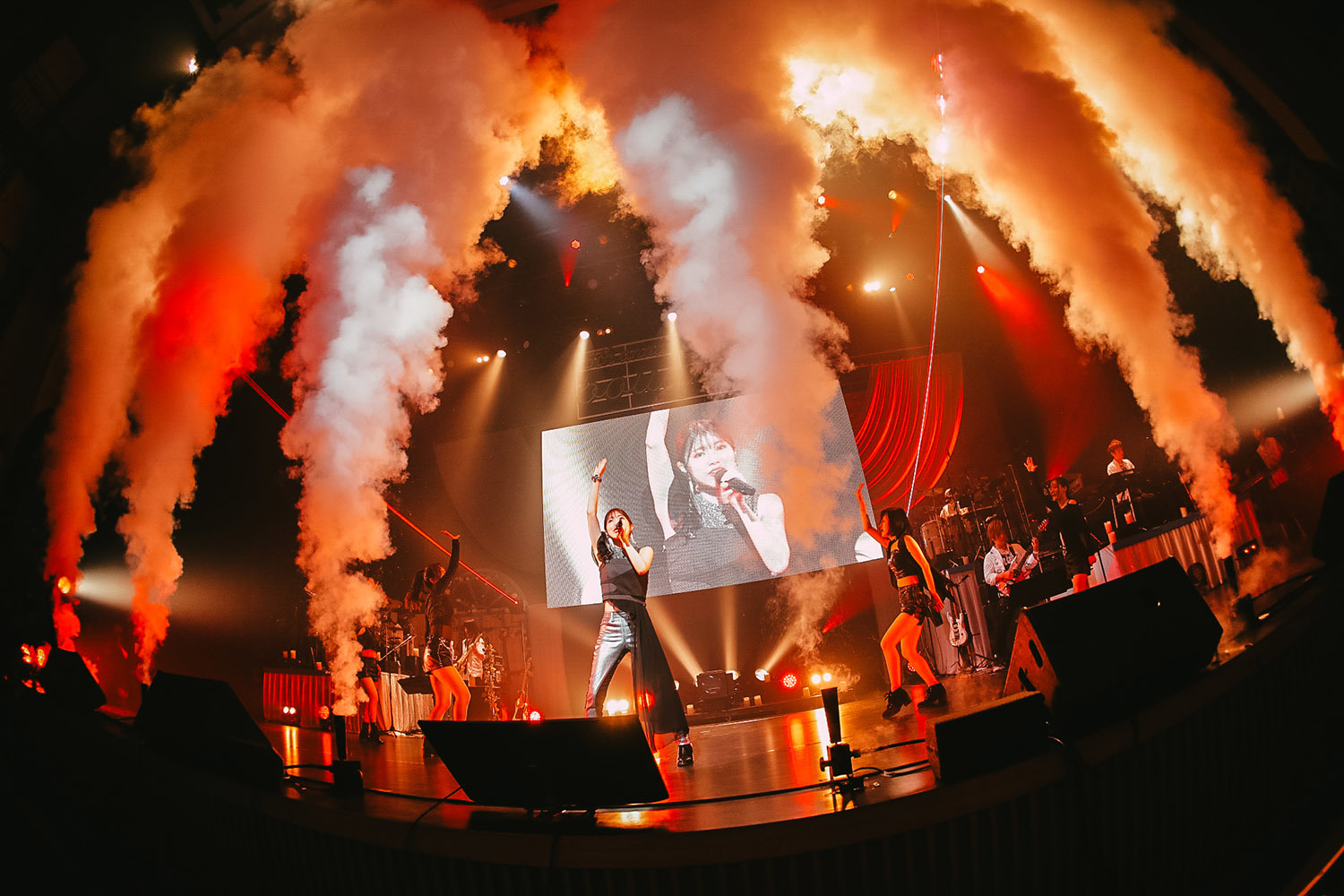 6曲を歌い終えたところで、一旦舞台をあとに。ステージ上ではバンドメンバーたちによる白熱したセッションが展開され、やがてジャジーな音色へと変化したところで、今度は黒を基調にした衣装で石原が再びステージに登場。4人のダンサーを従えて披露したのは、もちろん『Taste of Marmalade』だ。妖艶さを煽るようにミラーボールが会場を照らし、彼女の歌声にも艶っぽさが増していく。続いては、きっと多くのファンが生バンドでこの曲を聞きたかったのではないかと思われるロックテイストの『Ray Rule』。背景のスクリーンには過去のライブ映像がいくつも映し出され、2ndシングルながら彼女にとって新境地だったこの曲とともに積み上げてきた5年という時間の流れを感じさせる演出に、思わず目頭が熱くなる。また、ダークな一面に挑戦した『Abracada-Boo』でキレのあるダンスフォーメーションを届けると、ここからさらにギアを上げていく。『Singularity Point』と『Against.』では歌詞に合わせ、心に抱え込んだジレンマを解き放つようにドラマチックなパフォーマンスを披露。『TEMPEST』では激しく吹き上がるスモークの柱のなか、感情を爆発させるような熱いステージングでファンを魅了した。これでもかと攻め曲を繰り出した圧巻の構成。この激しい6曲をパワフルなダンスを交えながらノンストップで魅せていった姿はまさに衝撃的だった。