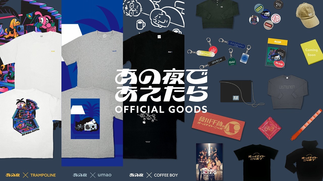 2022年3月に上演した、オールナイトニッポン55周年記念公演『あの夜を覚えてる』の続編となる、舞台演劇番組イベント生配信ドラマ『あの夜であえたら』。2023年10月14日(土)・15日(日)に東京国際フォーラム・ホールAにて上演となる、舞台演劇番組イベント生配信ドラマ『あの夜であえたら』の公演オフィシャルグッズのラインナップが発表され、HMV&BOOKS onlineでの販売も開始となった。
