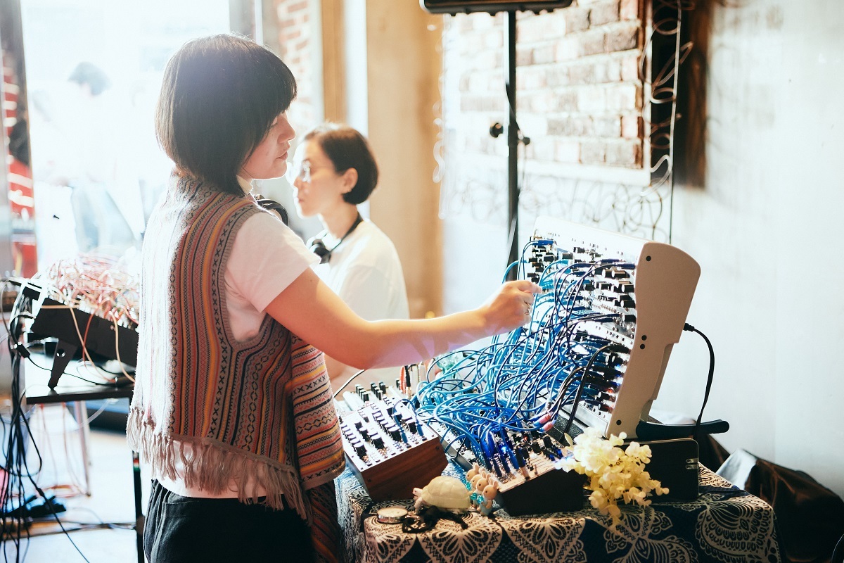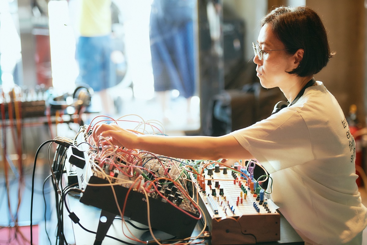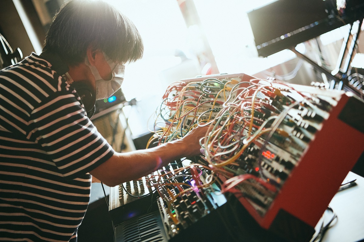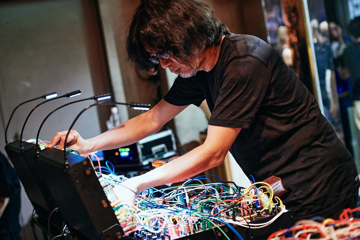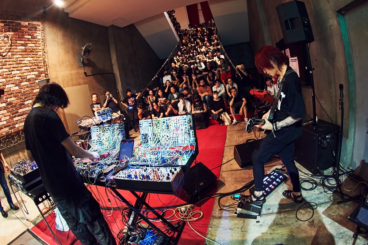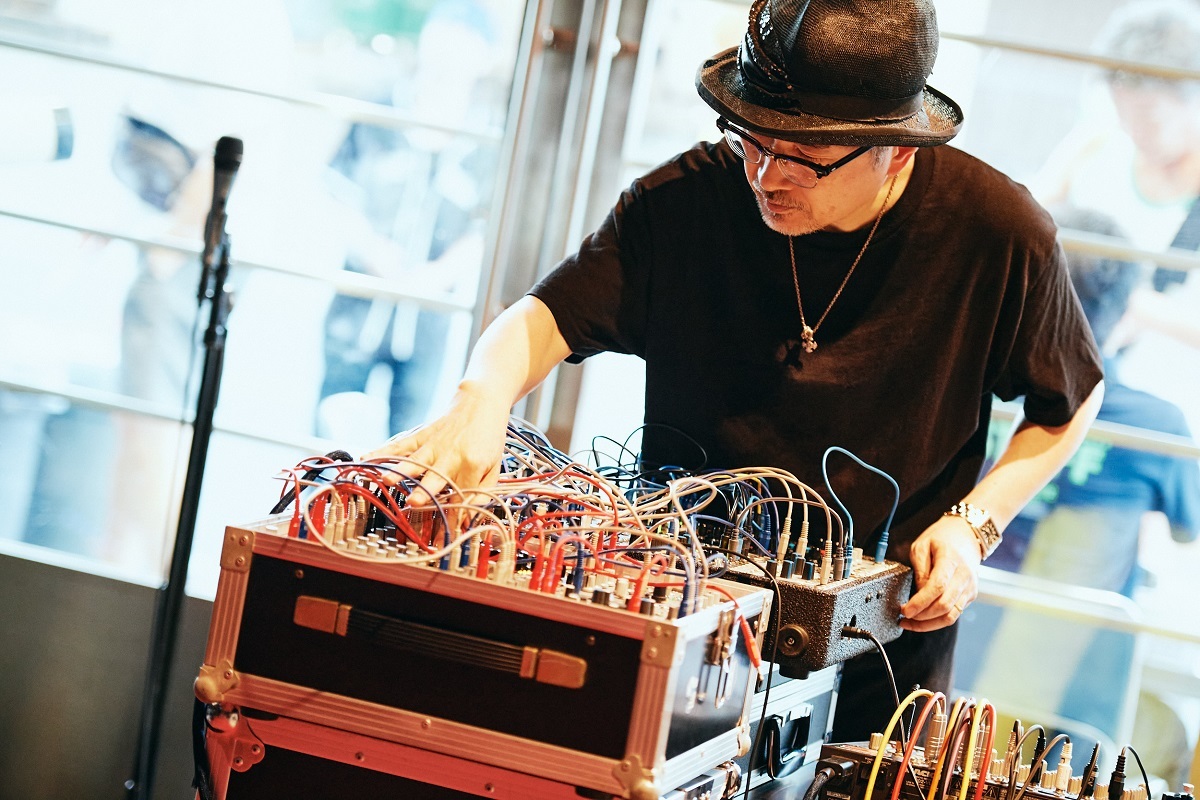 会場となった横浜ベイホールは、本来は2階のホールへとつながるエントランス部分も「MODULAR BOOTH」と題してtatata5やYumi Iwaki、Kenichi Takagi、坪口昌恭、HATAKENが、それぞれユーロラック・モジュラーシンセなどによる演奏を繰り広げる。また、2階のホールでも会場後方にDJ BOOTHのコーナーが設けられ、この日はGIVE UP GUYSが出演。このあたりも『WHAT IS JAM?』ならではの魅力である。