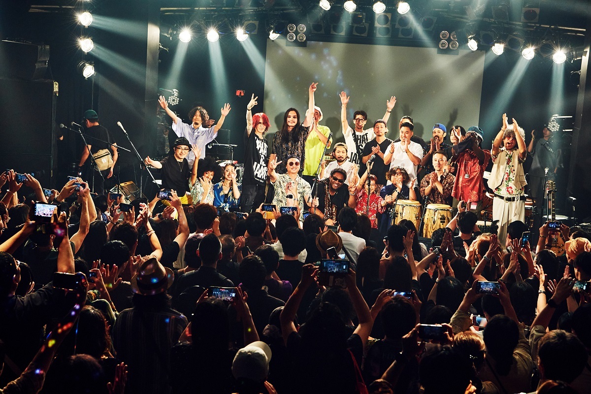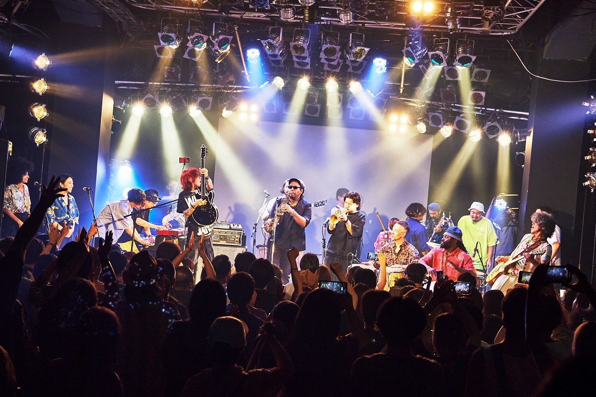 そのSPECIAL OTHERSの演奏が終了すると、ステージにはこの日出演した4つのバンドのメンバー、それにゲスト陣も含めた全員が登場しての一大ジャム・セッションへと突入。20人以上がところ狭しと一同に揃う眺めだけでも壮観だが、E7コード一発によるその場の完全インプロヴィゼーションの上で、それぞれがソロを回していく様も圧巻! 同じドラムを4人のドラマーが代わる代わる叩き、キーボードにはバンドからの鍵盤奏者に加えてモジュラーシンセサイザーで出演していた坪口昌恭も参入。ヴォーカルの女性ふたりもその場で即興の歌詞を付けて歌い、場内は興奮の坩堝と化す。そして、なによりも出演している当事者たちが心からこのイベントを楽しんでいるのが伝わってくる象徴的なシーンでもあった。