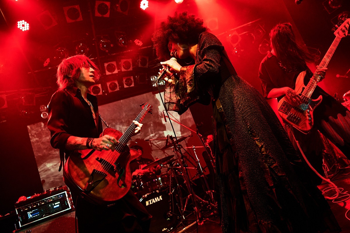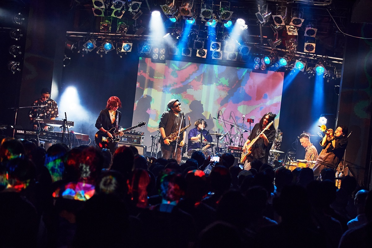 そして、3番手にいよいよSHAGが登場。2020年の1stアルバム『The Protest Jam』に収録の「Initiation of Rebellion」で幕を開けると、続いては完全インプロヴィゼーションによる演奏へ。類家心平の天空を突き刺すようなトランペット・ソロやSUGIZOのアグレッシヴなギター・ソロが炸裂。結果、SHAGの持ち時間が切迫するほどの大熱演が展開され、演奏の最中にKenKenから「時間大丈夫?」という言葉が飛び出すほどであった。続いては、パジャマで海なんかいかないのChloeが加わり、1997年にリリースしたリミックス3部作のうちの『REPLICANT TRUTH?』に収録されていた「REPLICANT DELIVER…」を歌ったのだが、このヴァージョンをライブで披露するのはこれが初めてということで、貴重極まりない。そして、ラストはChloeに替わってアルト・サックスのパトリック・バートリーが加わり、KenKen作曲の「KAMOGAWA」へ。マイナー調のバラードから一転してファンキーな16ビートが交互に登場する構成が特徴で、聴衆をどっぷりと曲に引き込みながら、同時に乗せまくっていたのが実に印象的であった。