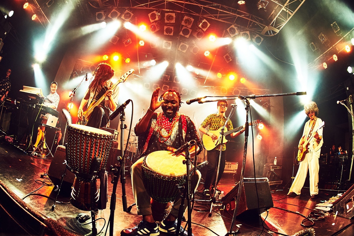 2番手は、セネガル人で打楽器ジャンベの達人オマール・ゲンデファル率いるAfro Begue。SHAGでベースも務めるKenKenが2020年から参加し、昨年にはキーボードにNaotoを新たに迎えてさらにパワーアップした同バンドなだけに、強烈なアフロ・グルーヴが繰り出され、そこにオマールのジャンベが炸裂するのだからして、盛り上がらないはずがない。さらに2曲目からサプライズ・ゲストでシアターブルックの佐藤タイジがギターで参戦して観客は大喜び。会場ごと揺れんばかりのノリノリ状態になっていた。