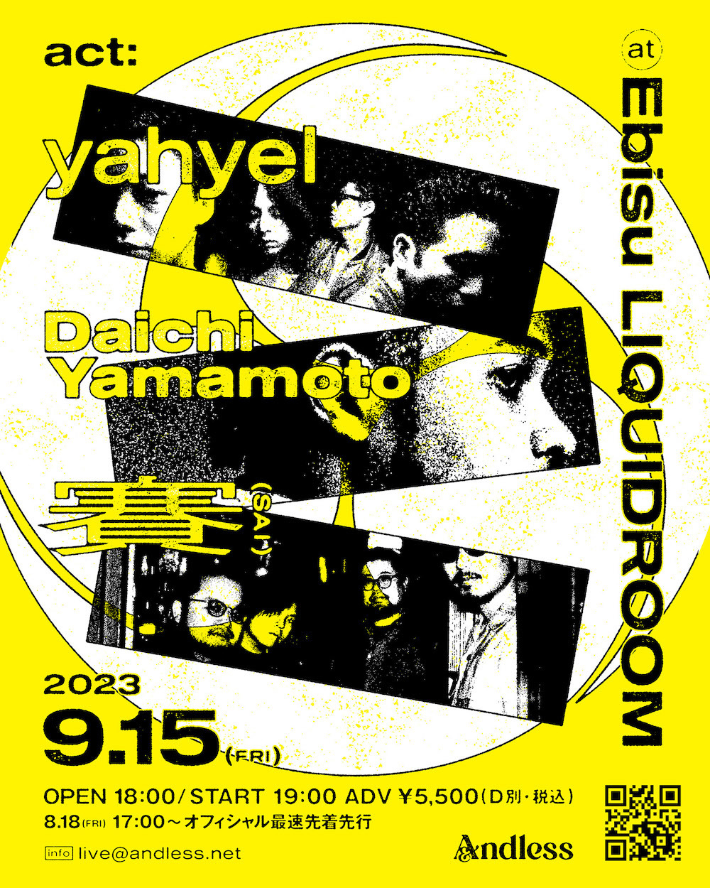 yahyel、Daichi Yamamoto、賽(SAI)による3マンライブが、9月15日(金)に恵比寿のLIQUIDROOMにて開催される。