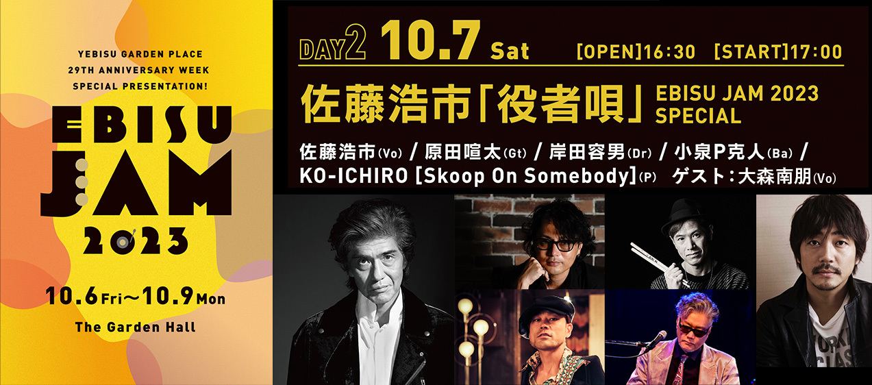 「役者だから歌える唄を」をテーマに、日本映画界を代表する俳優・佐藤浩市がEBISU JAMのステージに立つ。先輩俳優の原田芳雄の唄に触れ、原田の勧めで歌い始め、これまでも定期的にライブハウスで歌声を披露してきた佐藤。デビュー40周年である2020年に挑んだ初アルバム『役者唄60 ALIVE』をリリースし、寺尾聰、宇崎竜童、木梨憲武、江口洋介、小澤征悦といった錚々たるゲストとともに男臭さや不器用なかっこよさ、刹那的な弱さなど、さまざまなイメージを演じるように歌い、その豊かな表現が話題となった。今回、EBISU JAMのステージに、同じ役者仲間でありバンド活動も行う大森南朋がゲストボーカルとして登場する。
